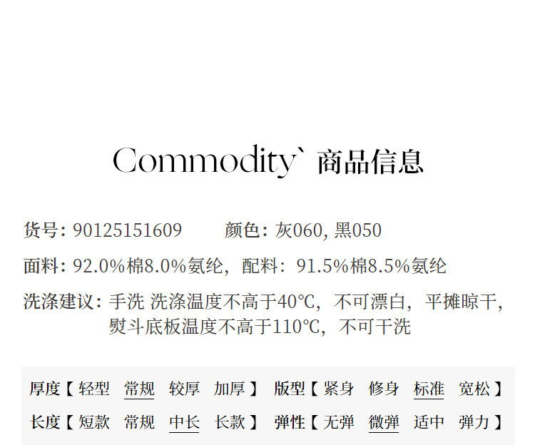 Material Composition 92% Cotton, 8% Polyurethane Elastic Fiber (Spandex)