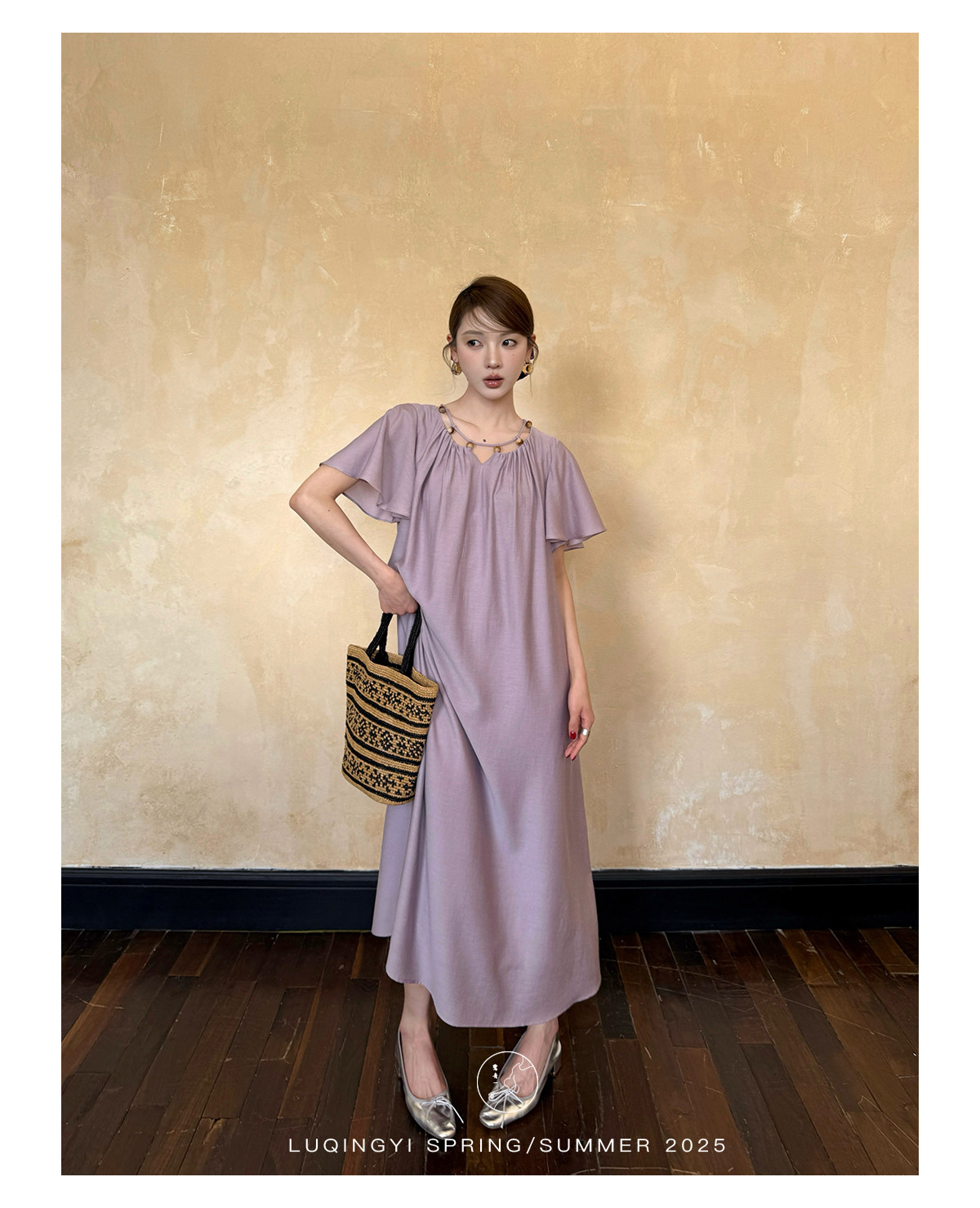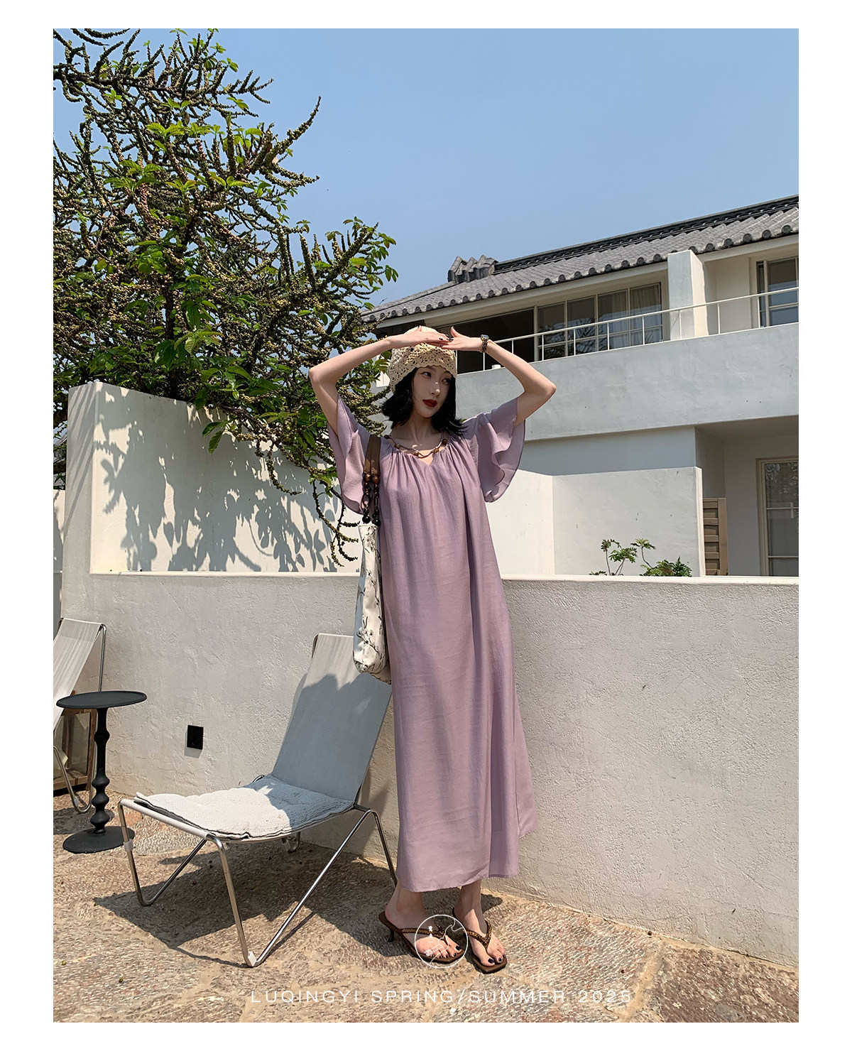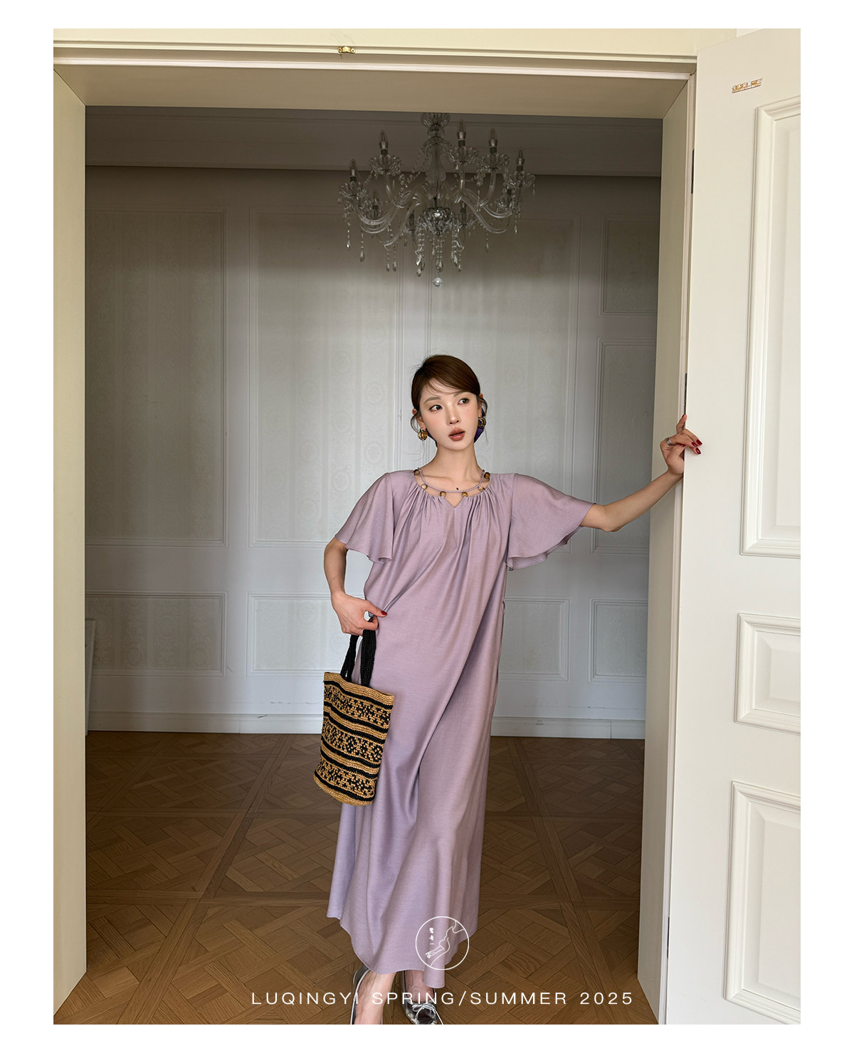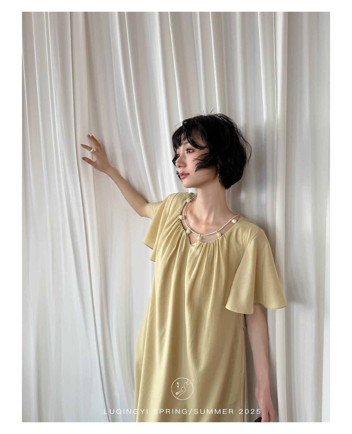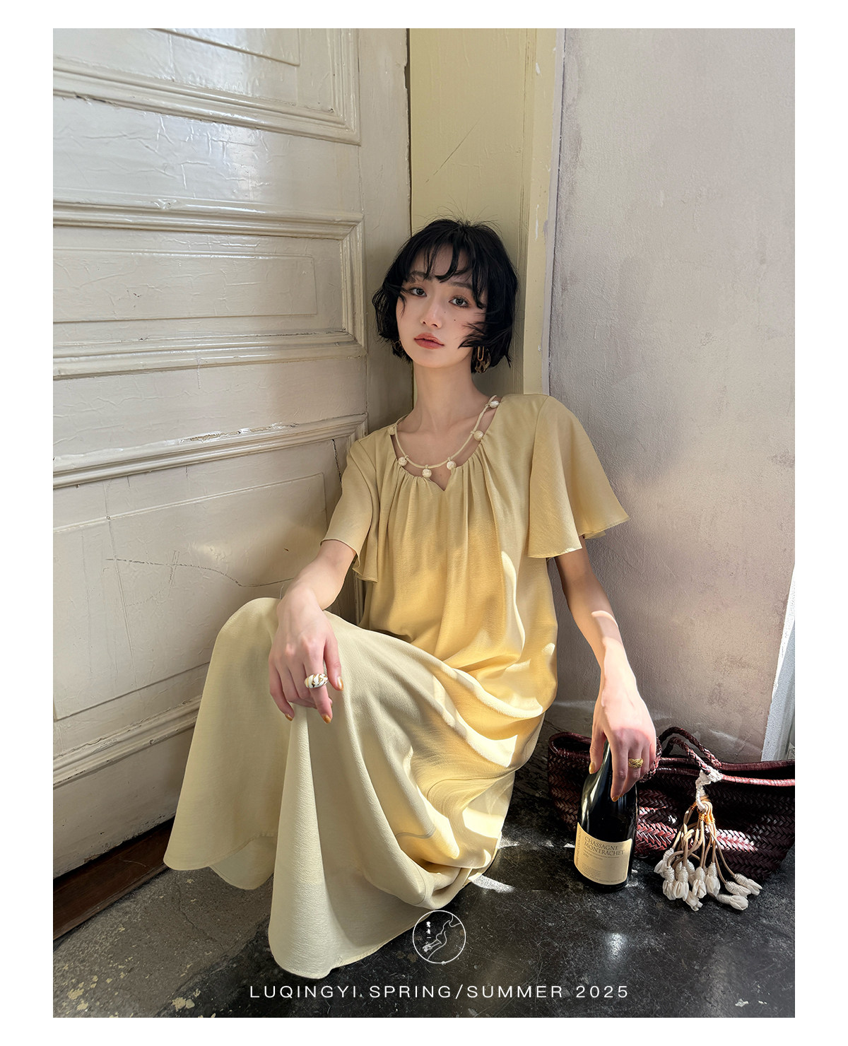 Lu Qingyi's Original [Rosary] French-Style Exquisite Acetate Dress, Summer Design with Ruffle Sleeves, Loose A-Line Skirt