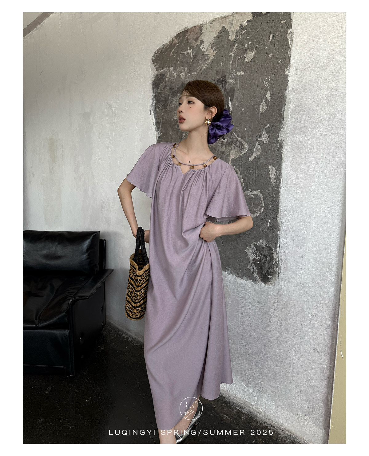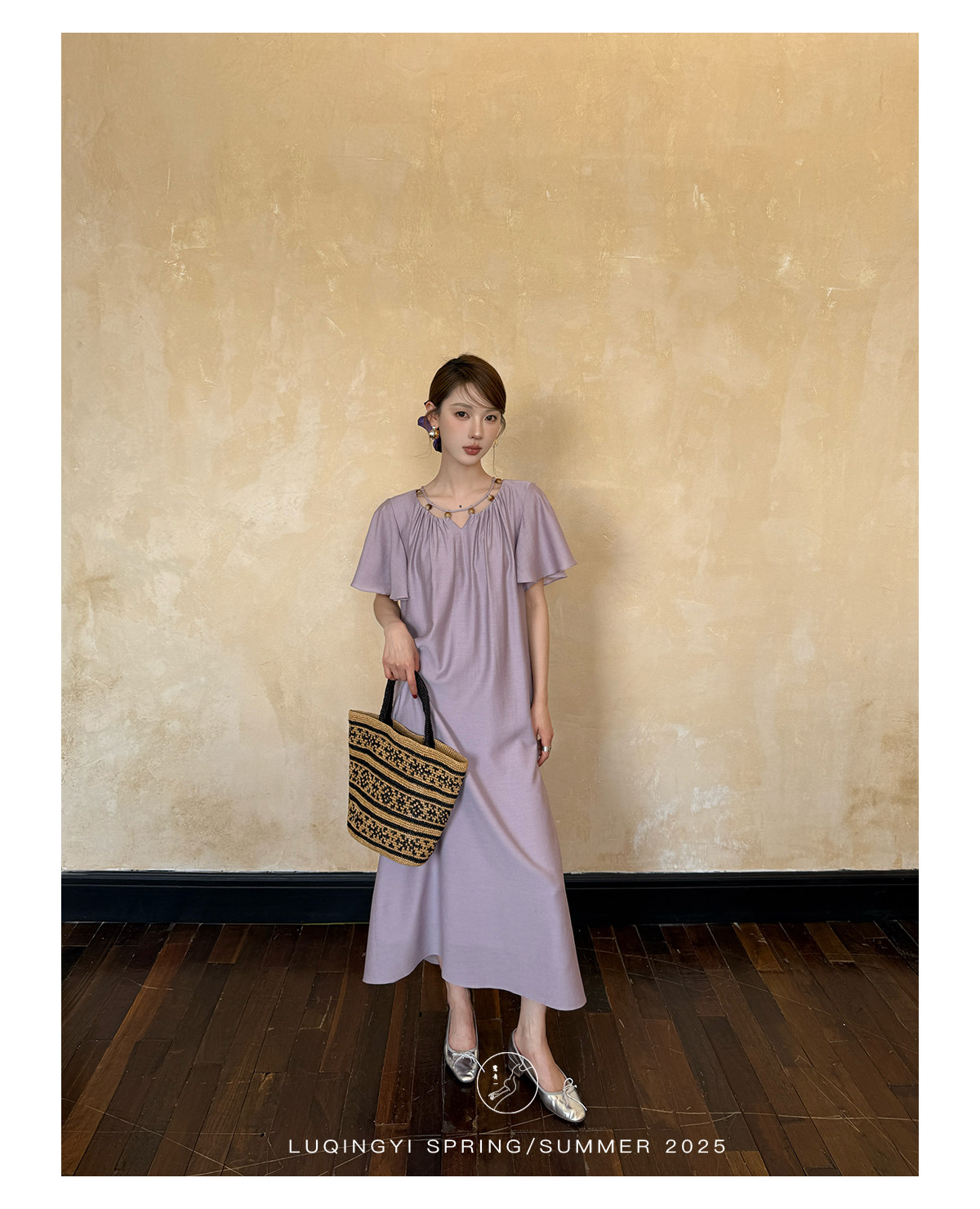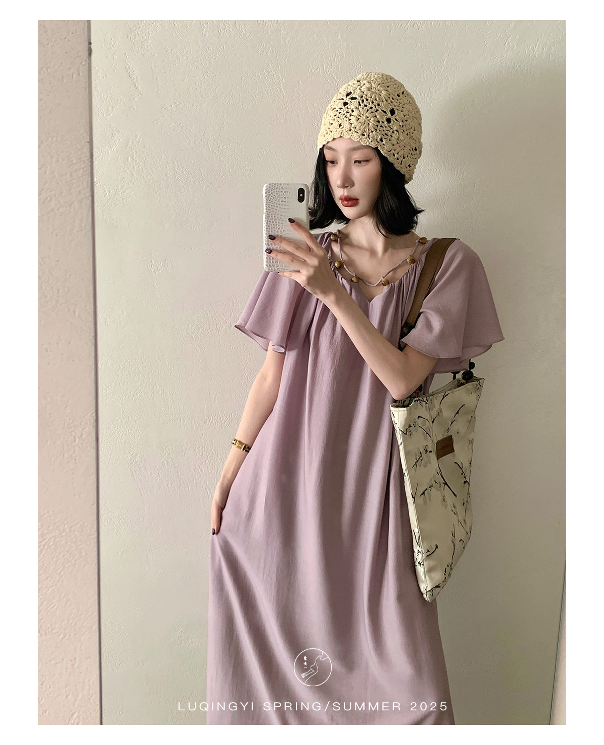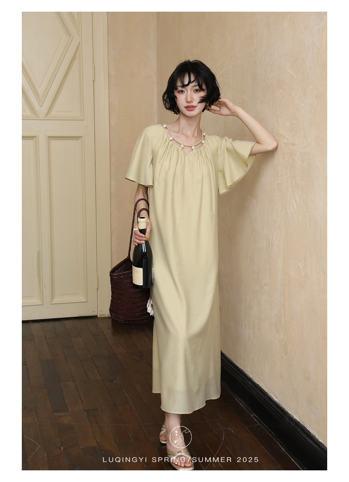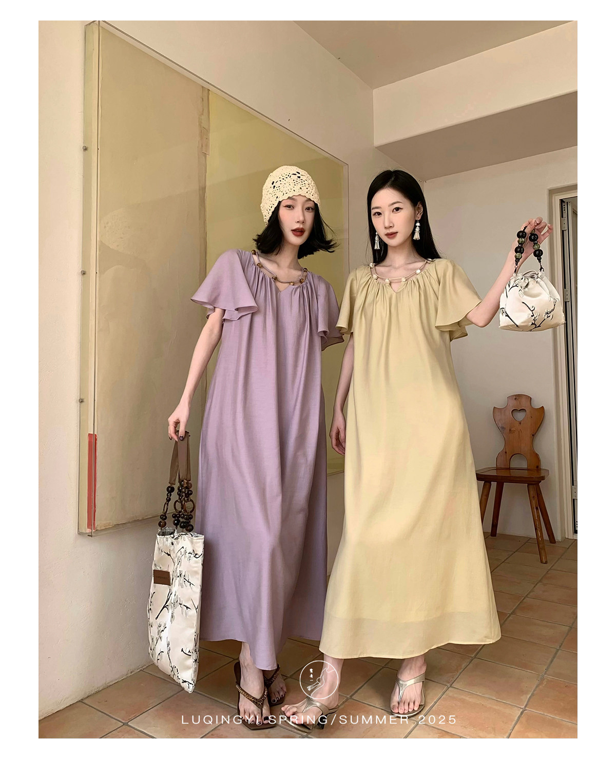 Lu Qingyi's Original [Rosary] French-Style Exquisite Acetate Dress, Summer Design with Ruffle Sleeves, Loose A-Line Skirt