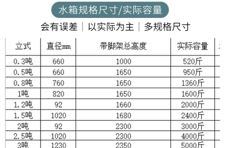 Color Classification 0.3 Tons Horizontal (Regular Thickening 0.6mm)304-K55,0.5 Tons Horizontal (Regular Thickening 0.6mm)304-I12,0.5 Tons Horizontal (Upgraded Extra Thick 1.0mm)304-G78,1 Ton Horizontal (Regular Thickening 0.6mm)304-T23,1 Ton Horizontal (Upgraded Extra Thick 1.0mm)304-O85,1.5 Tons Horizontal (Regular Thickening 0.6mm)304-C38,1.5 Tons Horizontal (Upgraded Extra Thick 1.0mm)304-Q46,2 Tons Horizontal (Regular Thickening 0.6mm)304-E33,2 Tons Horizontal (Upgraded to Extra Thick 1.0mm)304-A71,2.5 Tons Horizontal (Regular Thickening 0.6mm)304-A52,3 Tons Horizontal (Regular Thickening 0.6mm)304-I18,3 Tons Horizontal (Upgraded to Extra Thick 1.0mm)304-A34,4 Tons Horizontal (Regular Thickening 0.6mm)304-O53,4 Tons Horizontal (Upgraded to Extra Thick 1.0mm)304-S48,5 Tons Horizontal (Regular Thickening 0.7mm)304-U43,5 Tons Horizontal (Upgraded Extra Thick 1.0mm)304-L88,6 Tons Horizontal (Regular Thickening 0.7mm)304-N37,6 Tons Horizontal (Upgraded Extra Thick 1.0mm)304-A64,8 Tons Horizontal (Regular Thickening 0.7mm)304-S85,8 Tons Horizontal (Upgraded Extra Thick 1.0mm)304-K64,10 Tons Horizontal (Regular Thickening 0.7mm)304-M53,10 Tons Horizontal (Upgraded to Extra Thick 1.2mm)304-C41,0.25 Tons Vertical 304 Water Tank ( )-O16,0.3 Tons Vertical 304 Water Tank ( )-N75,0.5 Ton Vertical 304 Water Tank ( )-B70,1 Ton Vertical 304 Water Tank (with Shelf)-U63,1.5 Tons Vertical 304 Water Tank (with Shelf)-L29,2 Tons Vertical 304 Water Tank (with Shelf)-U37,2.5 Tons Vertical 304 Water Tank (with Shelf)-S44,3 Tons Vertical 304 Water Tank (with Shelf)-U70,4 Tons Vertical 304 Water Tank (Without Shelf)-H20,5 Tons Vertical 304 Water Tank (Without Bracket)-E16,60kg Square[Thickened Upgraded Version]304 Water Tank-S71,30kg Square[Thickened Upgraded Version]304 Water Tank-D39,120kg Square[Thickened Upgraded Version]304 Water Tank-G77,175kg Square[Thickened Upgraded Version]304 Water Tank-G65,200kg Square[Thickened Upgraded Version]304 Water Tank-J72,250kg Square[Thickened Upgraded Version]304 Water Tank-I68,300kg Square[Thickened Upgraded Version]304 Water Tank-B43,500kg Square[Thickened Upgraded Version]304 Water Tank-Q89