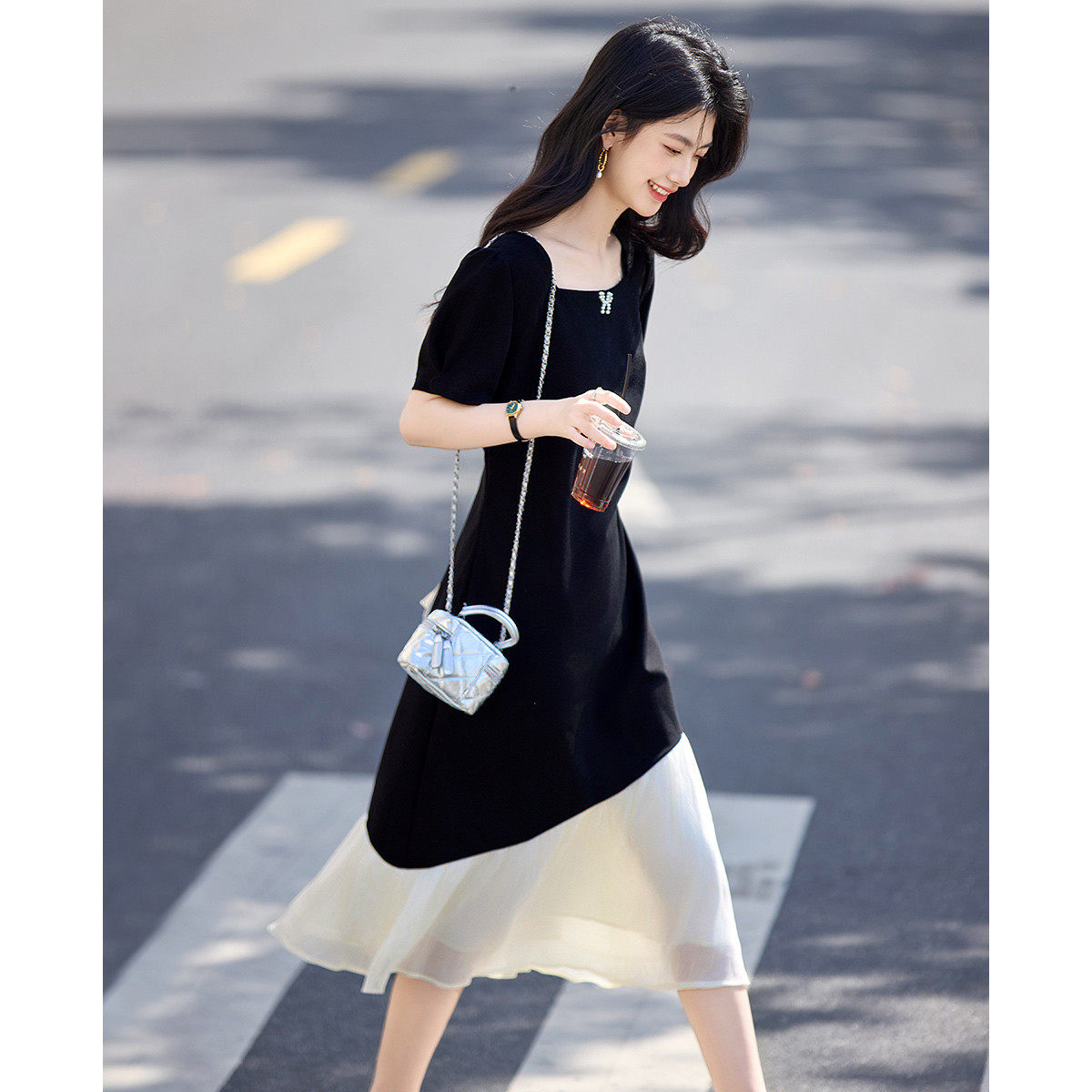 法式优雅赫本风连衣裙夏季新款收腰显瘦撞色拼接方领减龄小黑裙