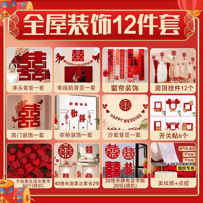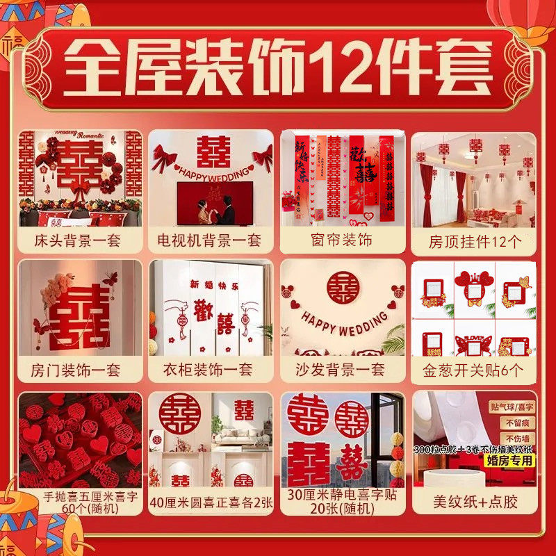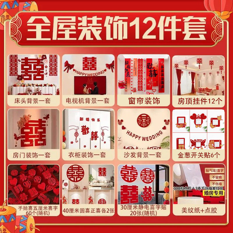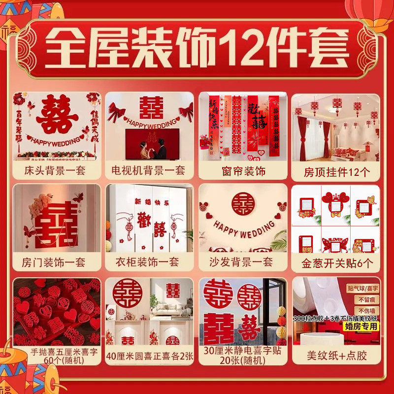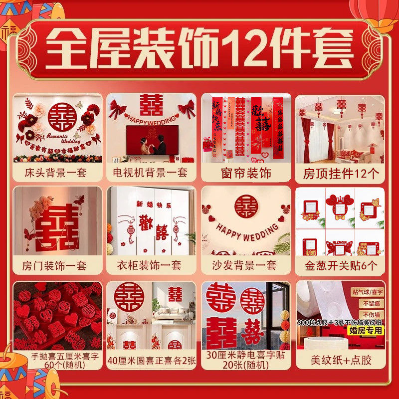 Whole House Decoration Wedding Room Set Wedding Arrangement for the Bride and Groom Wedding Bedroom New Room Double Happiness Character Wedding Supplies Collection