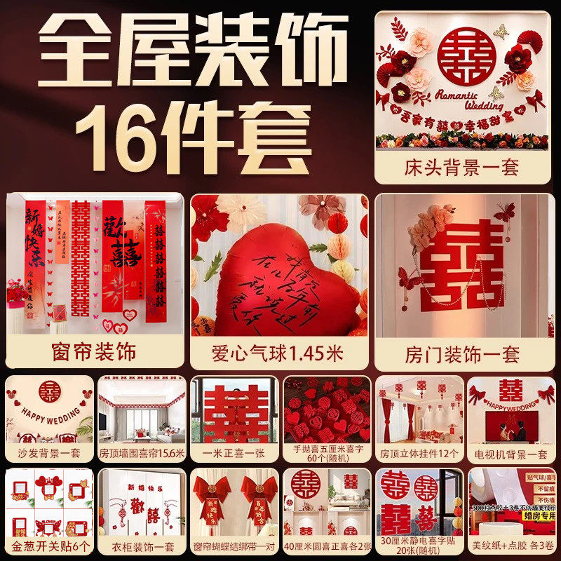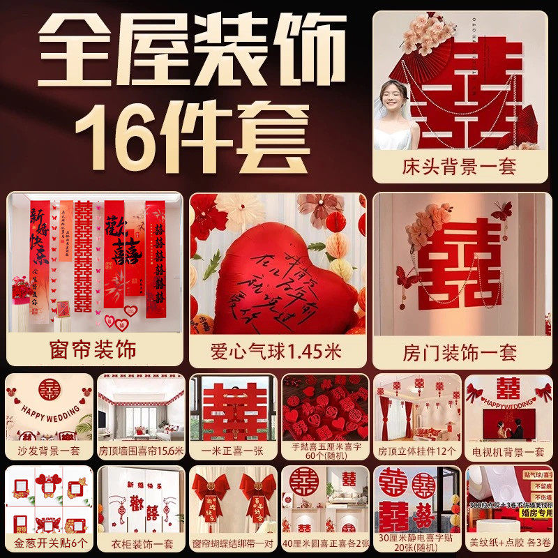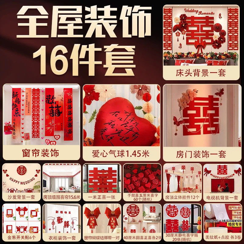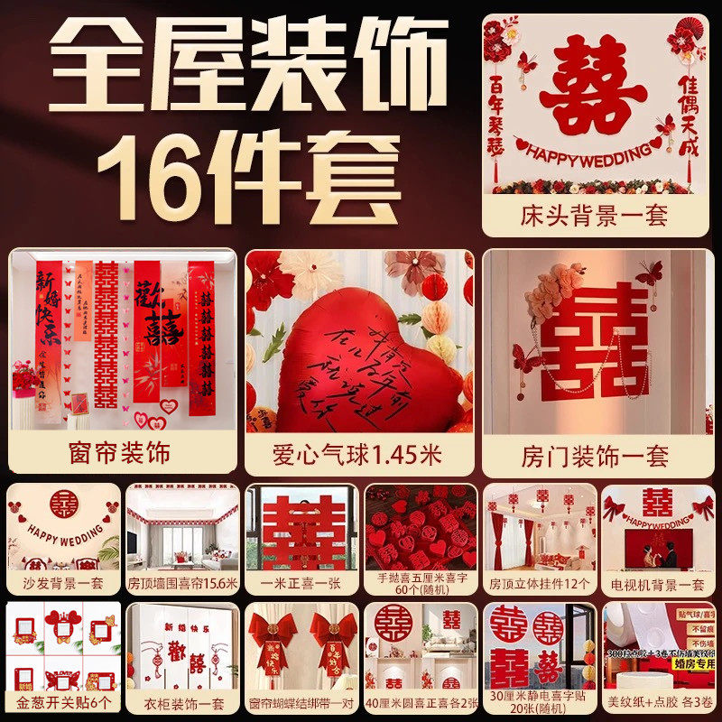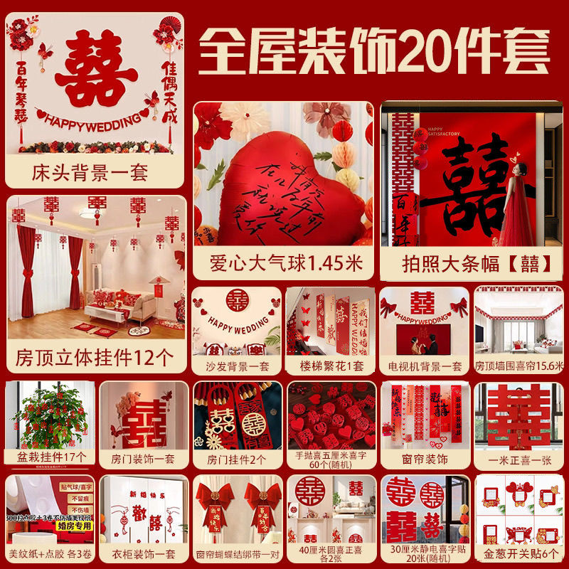Whole House Decoration Wedding Room Set Wedding Arrangement for the Bride and Groom Wedding Bedroom New Room Double Happiness Character Wedding Supplies Collection