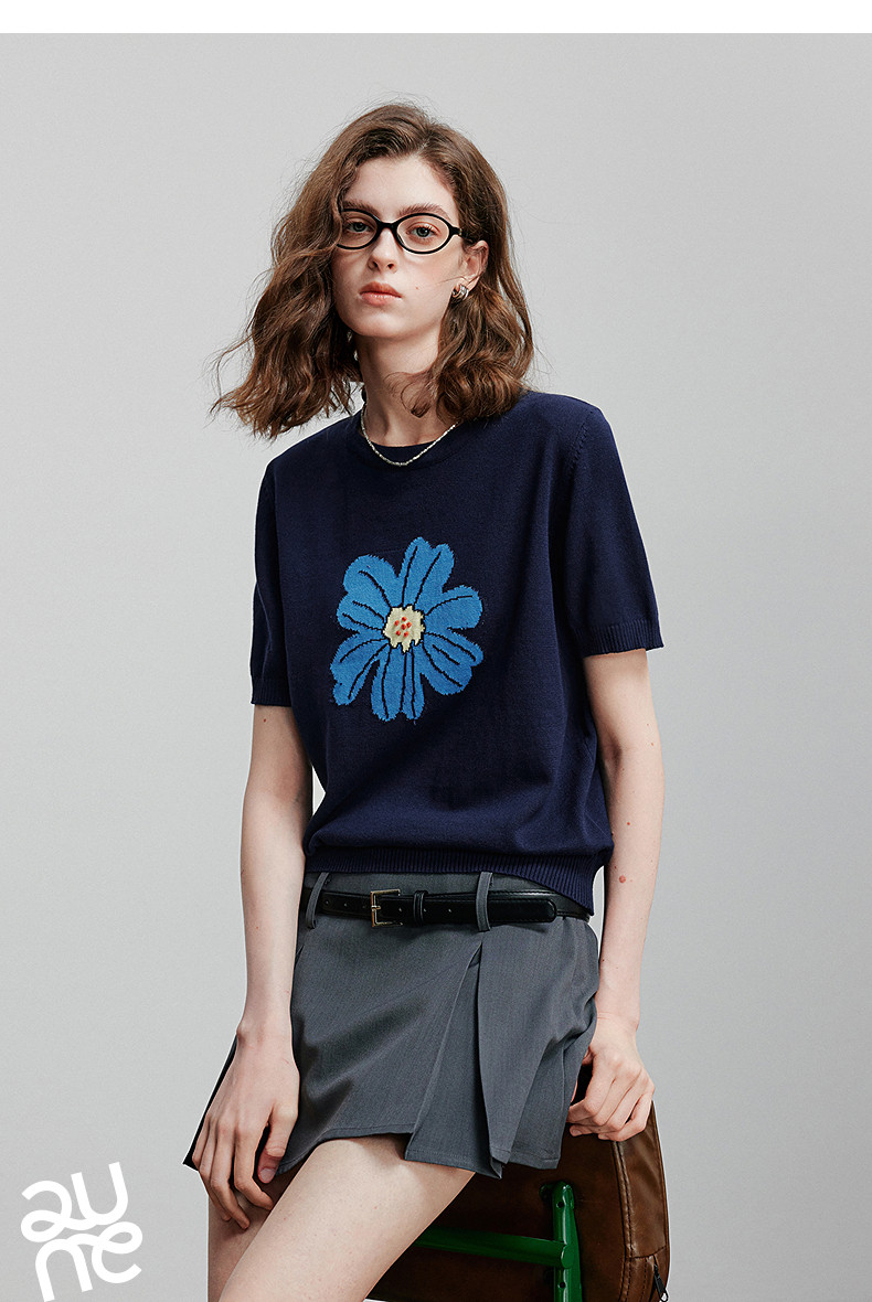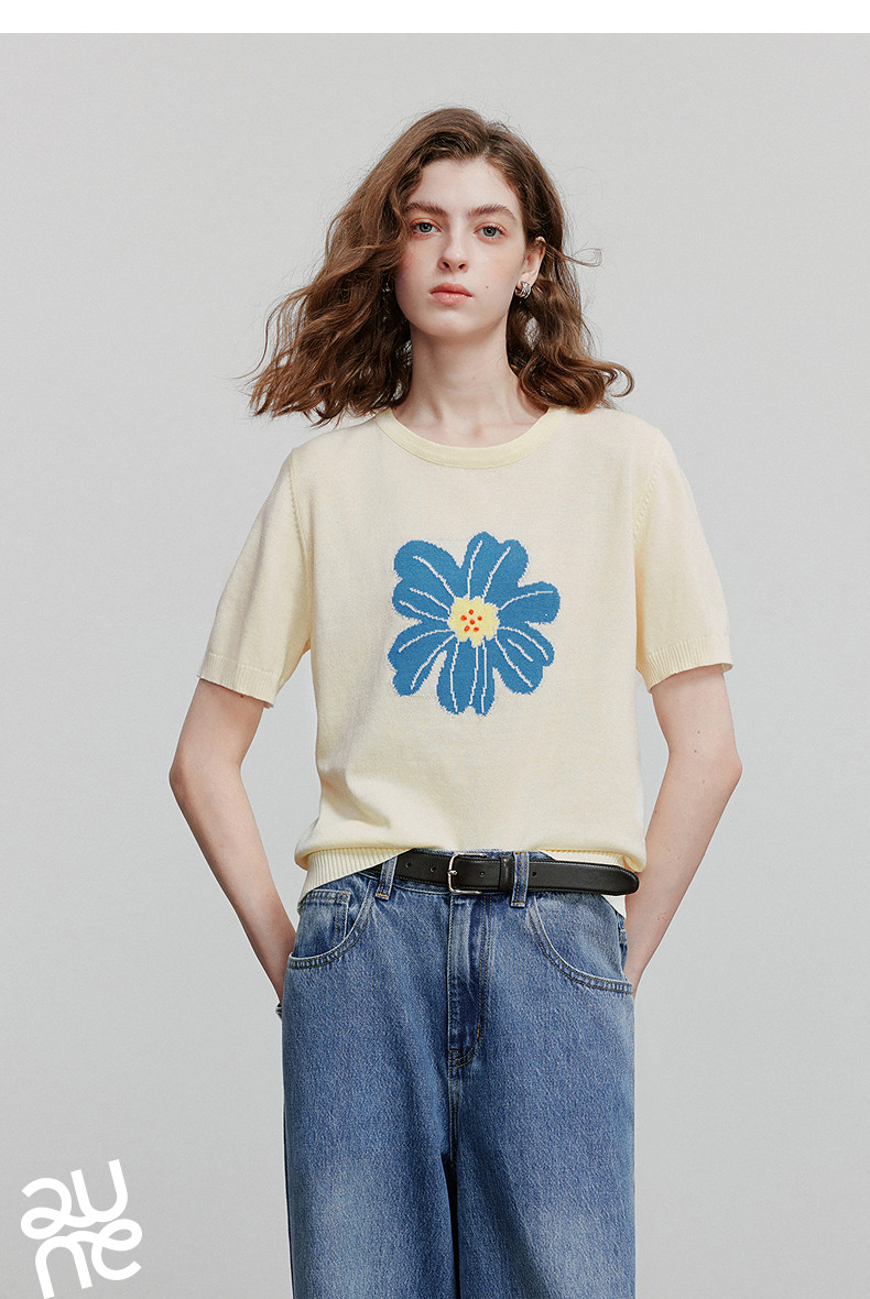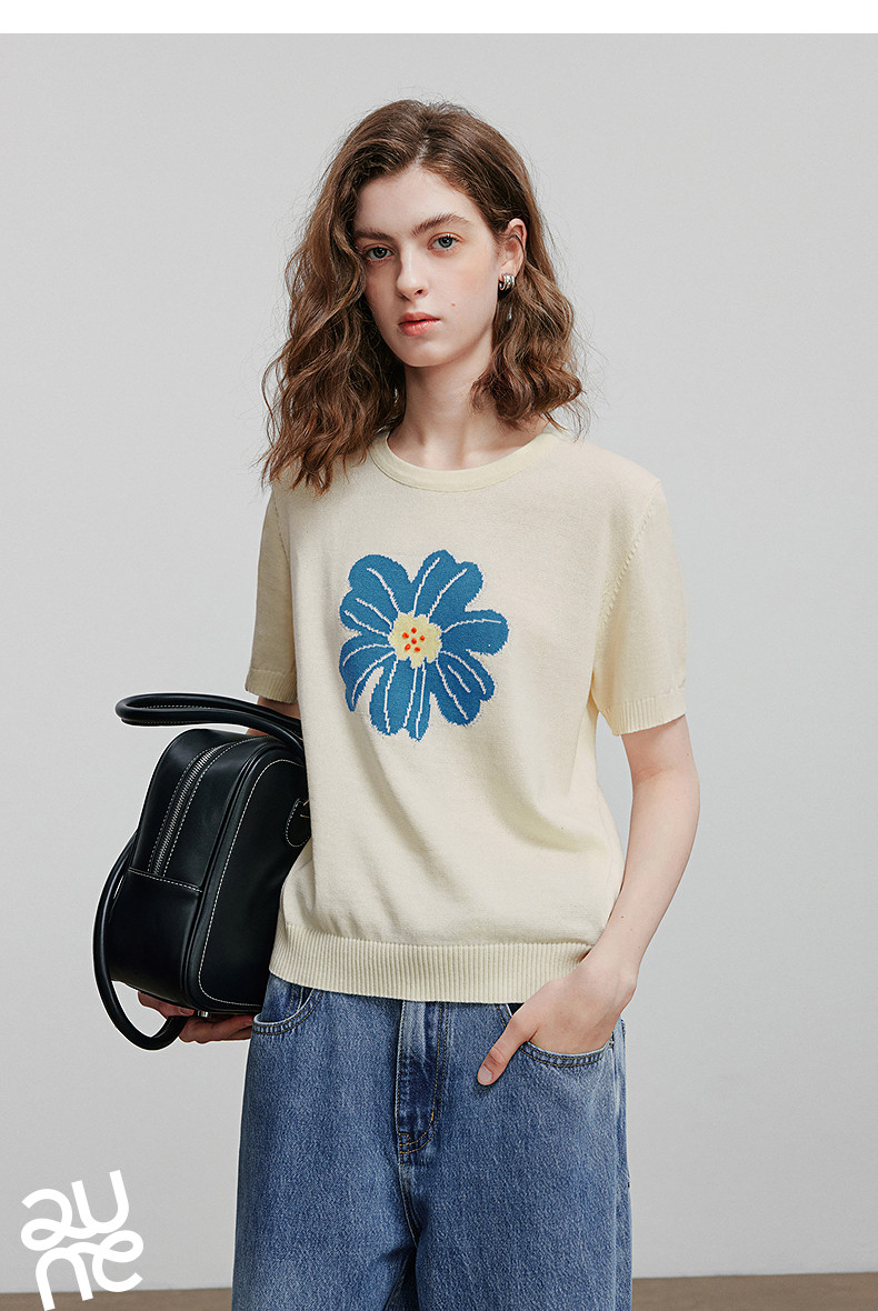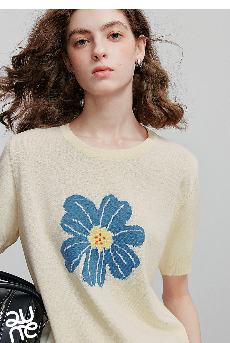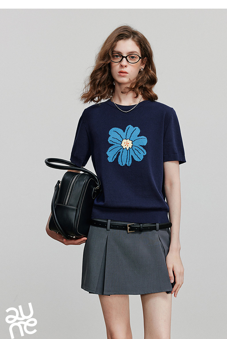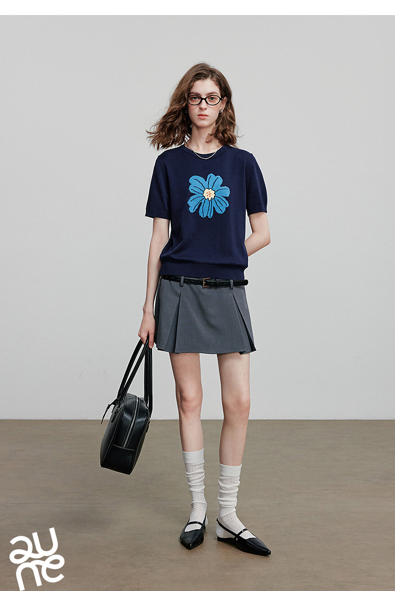 初语2026夏季新款穿搭花卉提花短袖针织衫/简约气质纯色半身裙