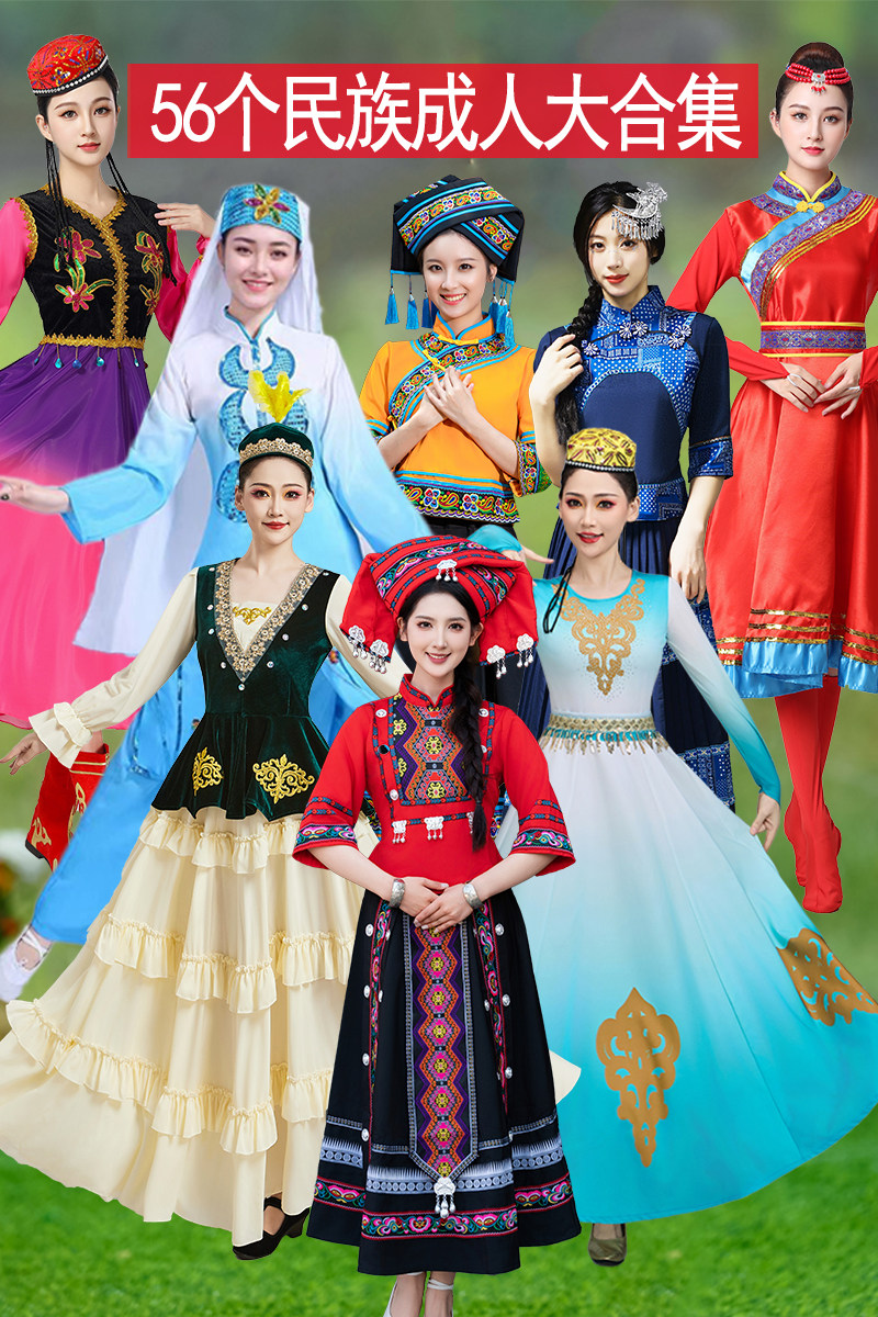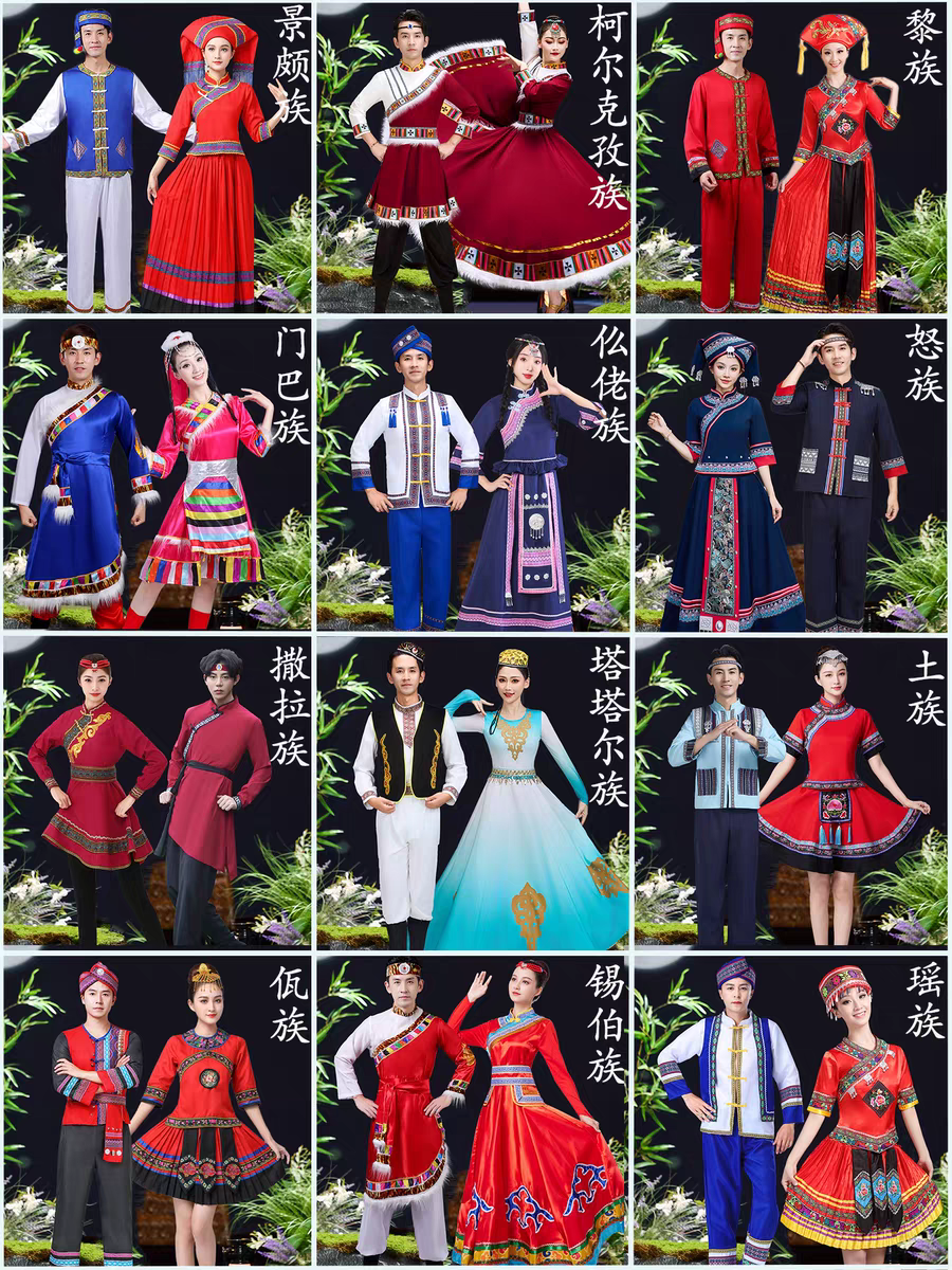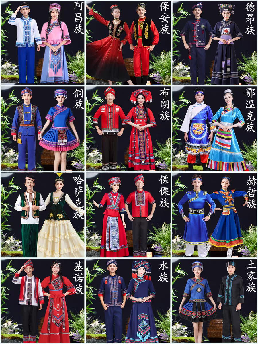 56 Ethnic Minority Costumes for Adults, Men and Women, Zhuang, Mongolian, Miao, Yi, Li, Wa, Xinjiang Performance Dance Costumes