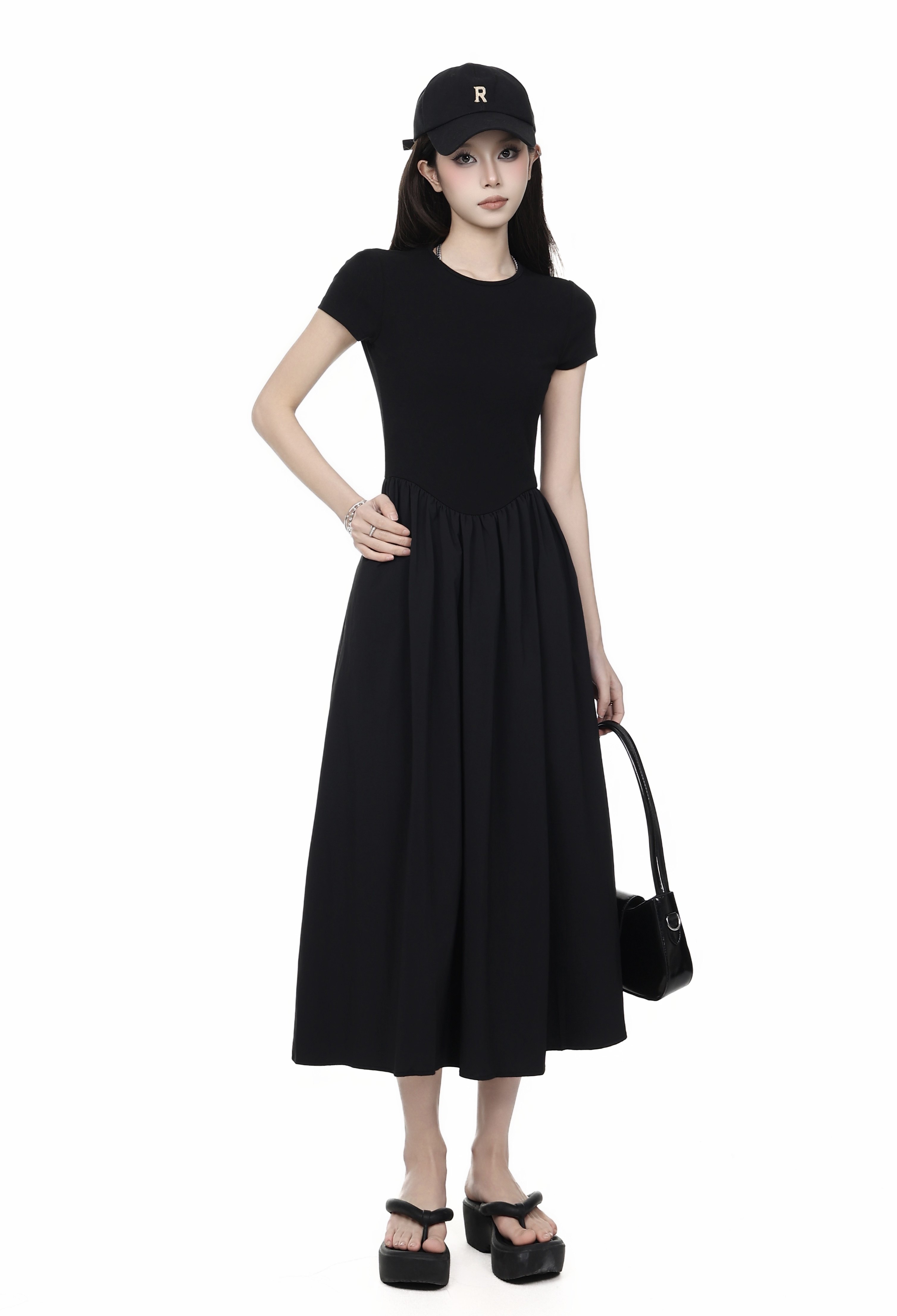 Black French short-sleeved dress for women in 2025 summer small person with slim fit and slim temperament A-line big skirt long skirt