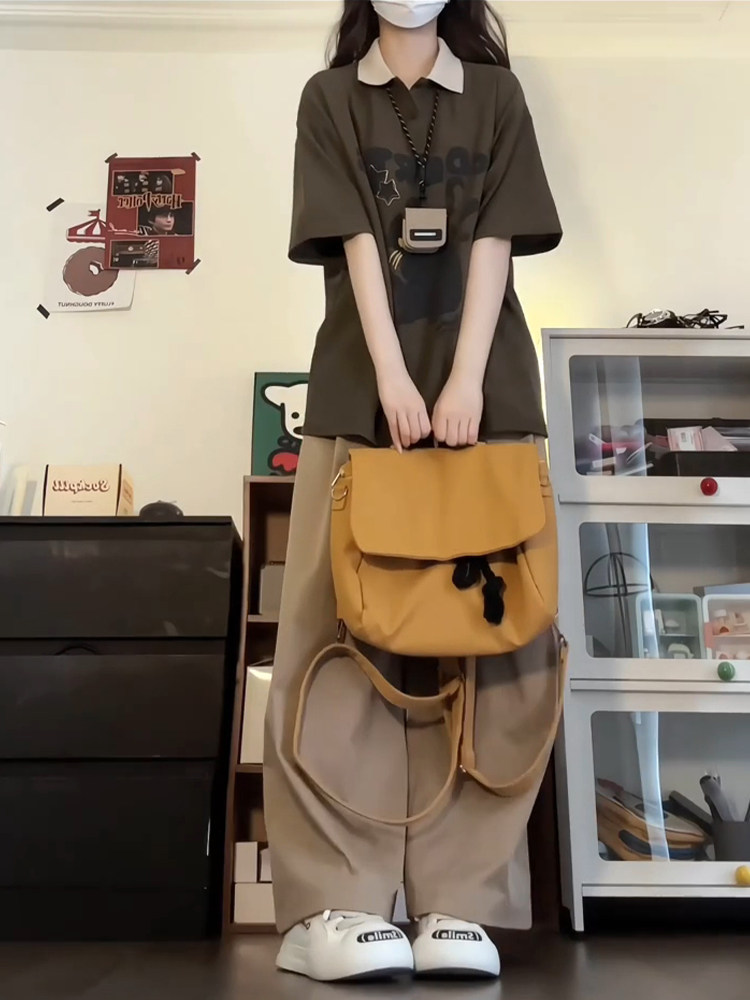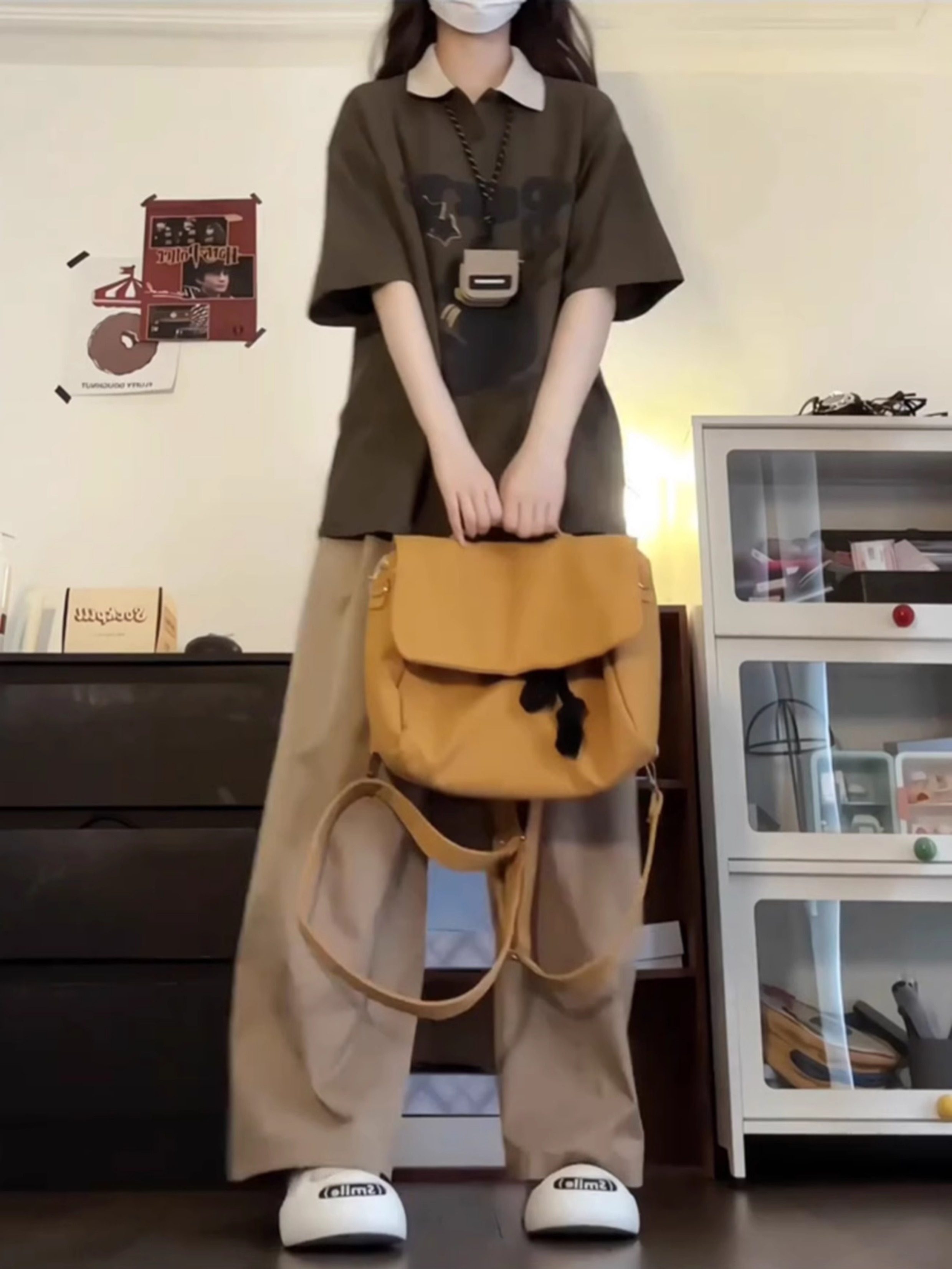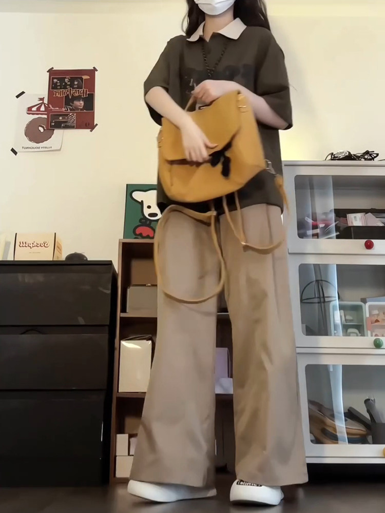 Japanese Retro Casual Sports Suit for Women, Summer Student Loose-Fitting Korean Style Fashion Polo Short-Sleeve Wide-Leg Pants Two-Piece Set