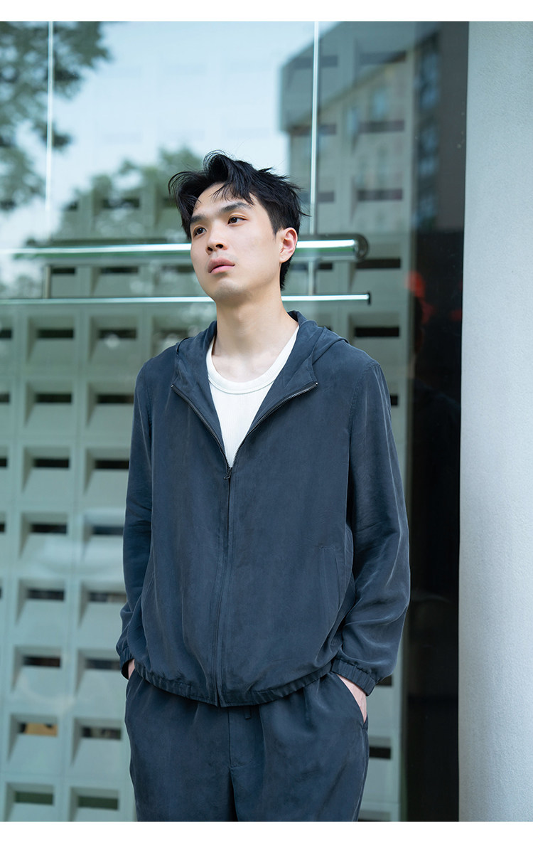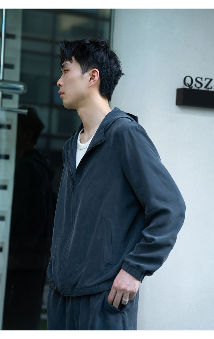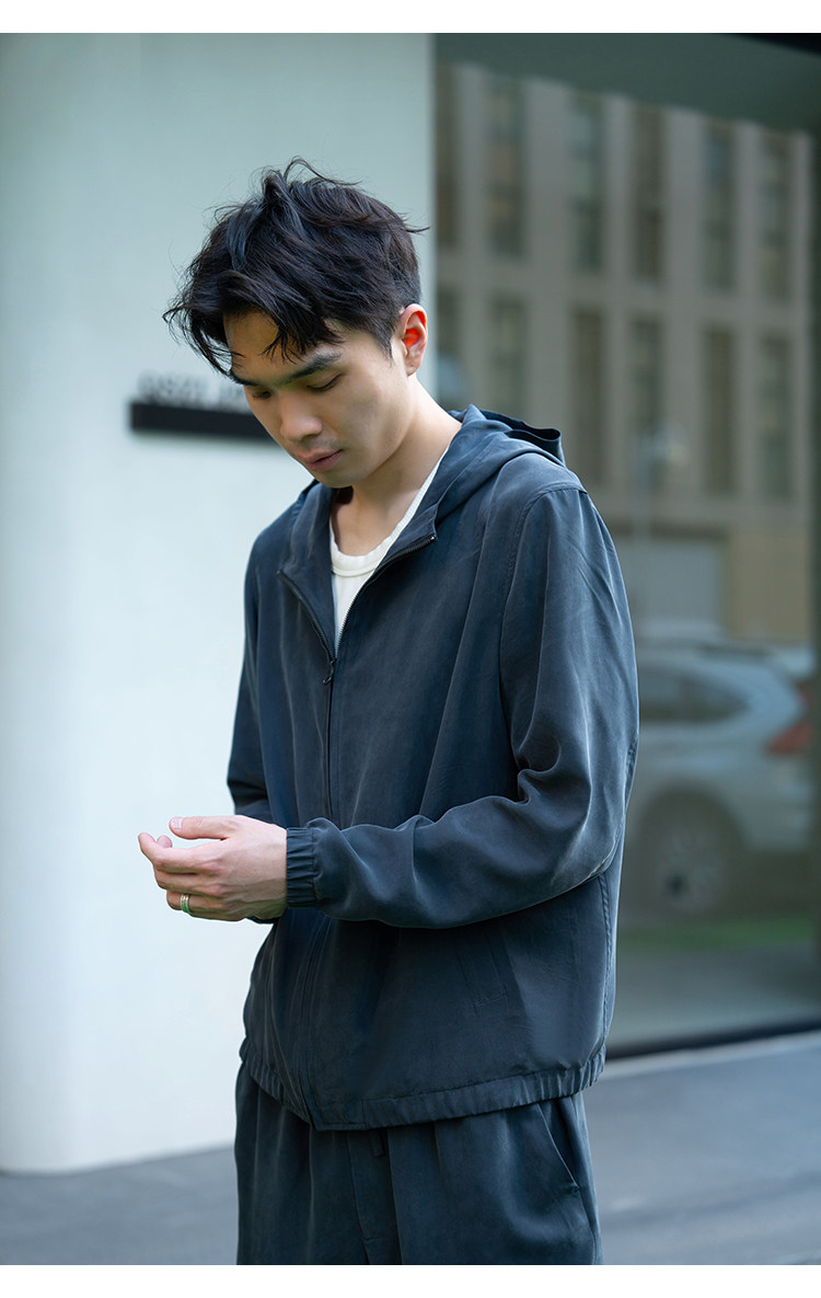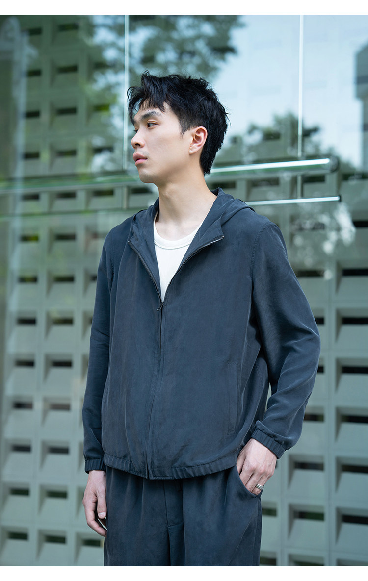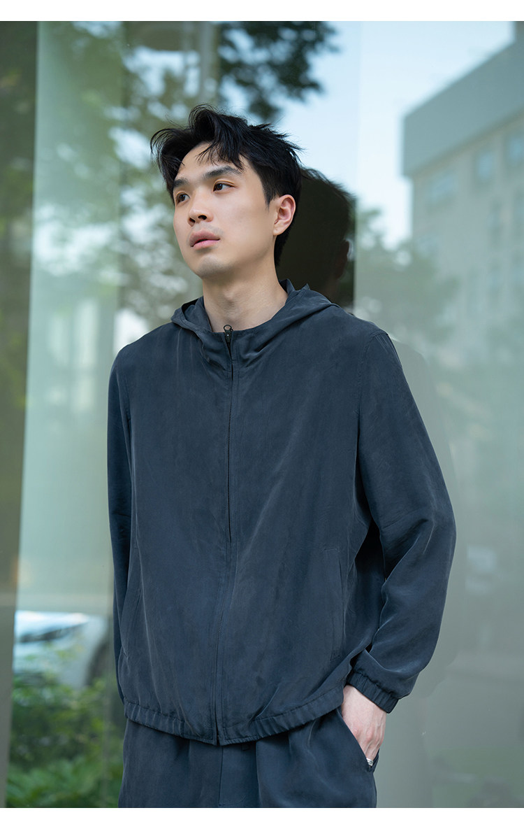 Zhengchen/正辰 高端黑标雾面纯桑蚕丝轻薄微廓连帽夹克外套男秋