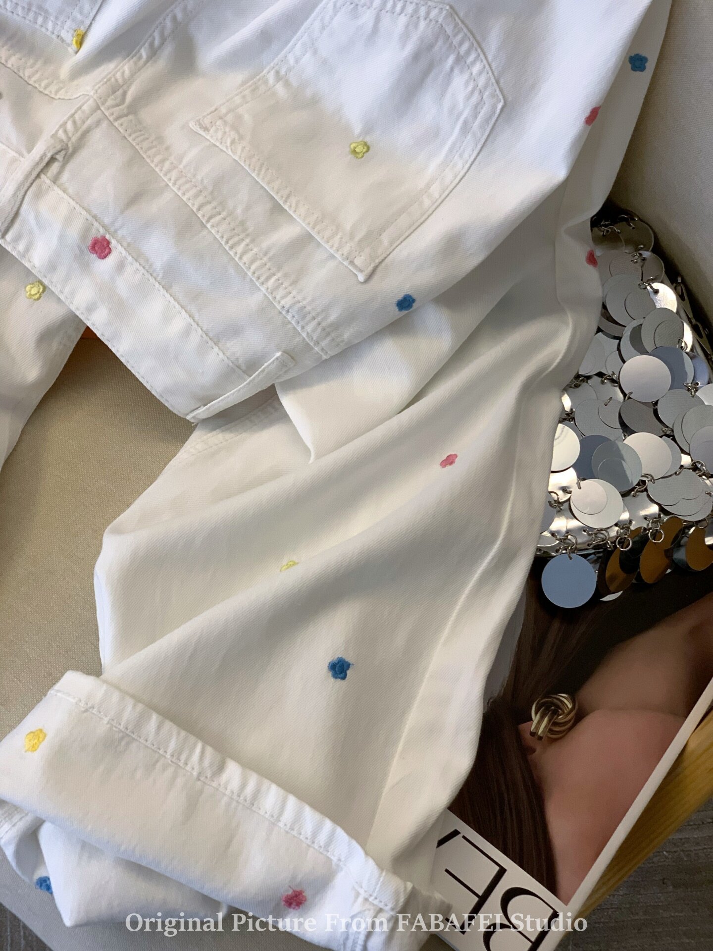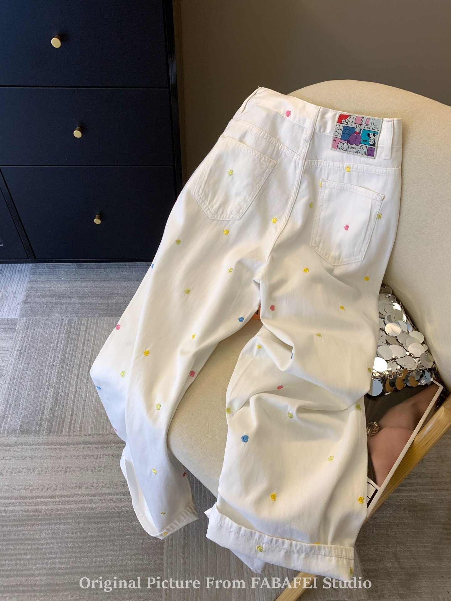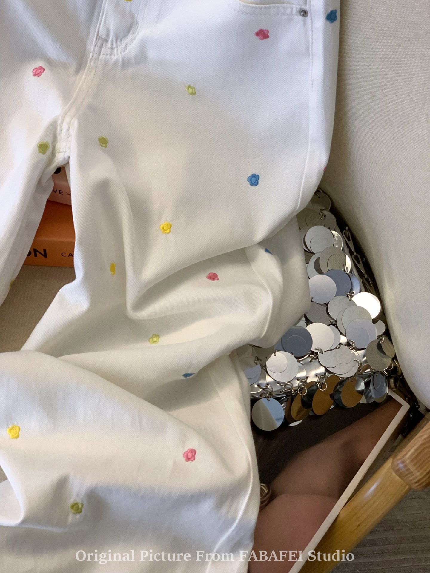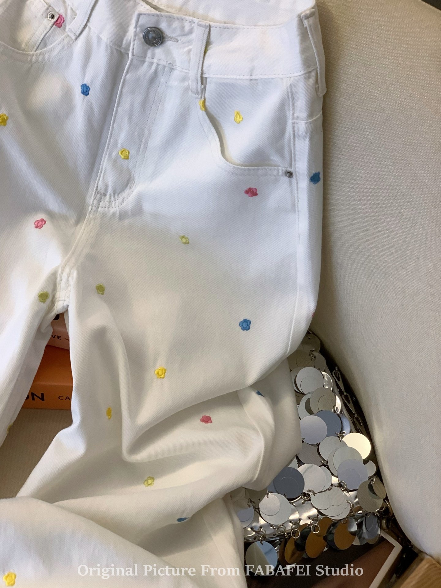Small Floral Embroidered White Jeans for Women, 2025 Summer Design, Cuffed Straight-Leg Pants, Wide-Leg, Slimming, Floor-Length Pants