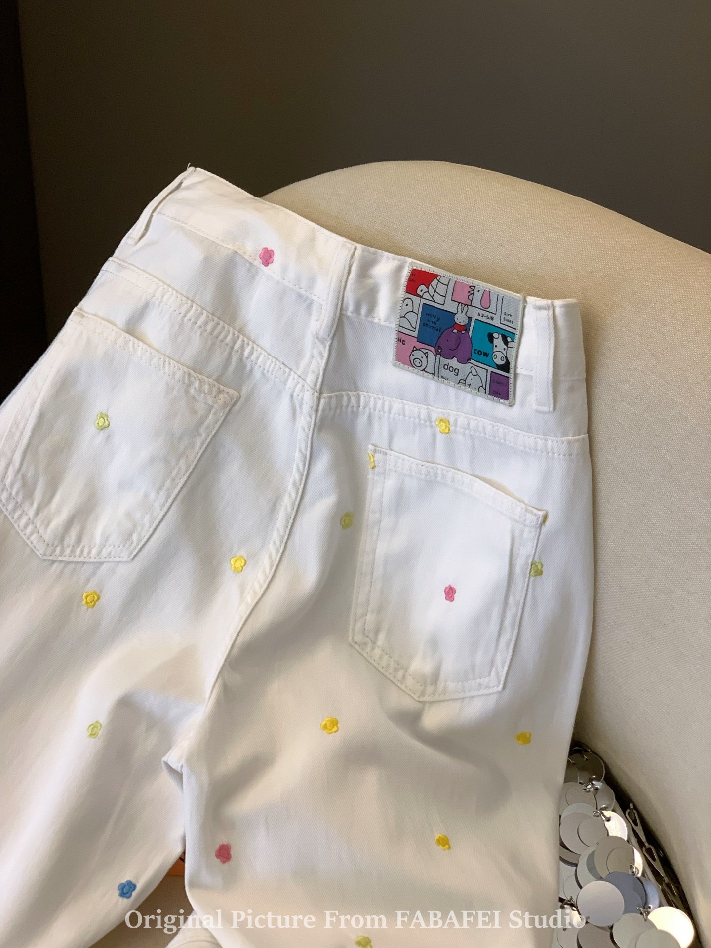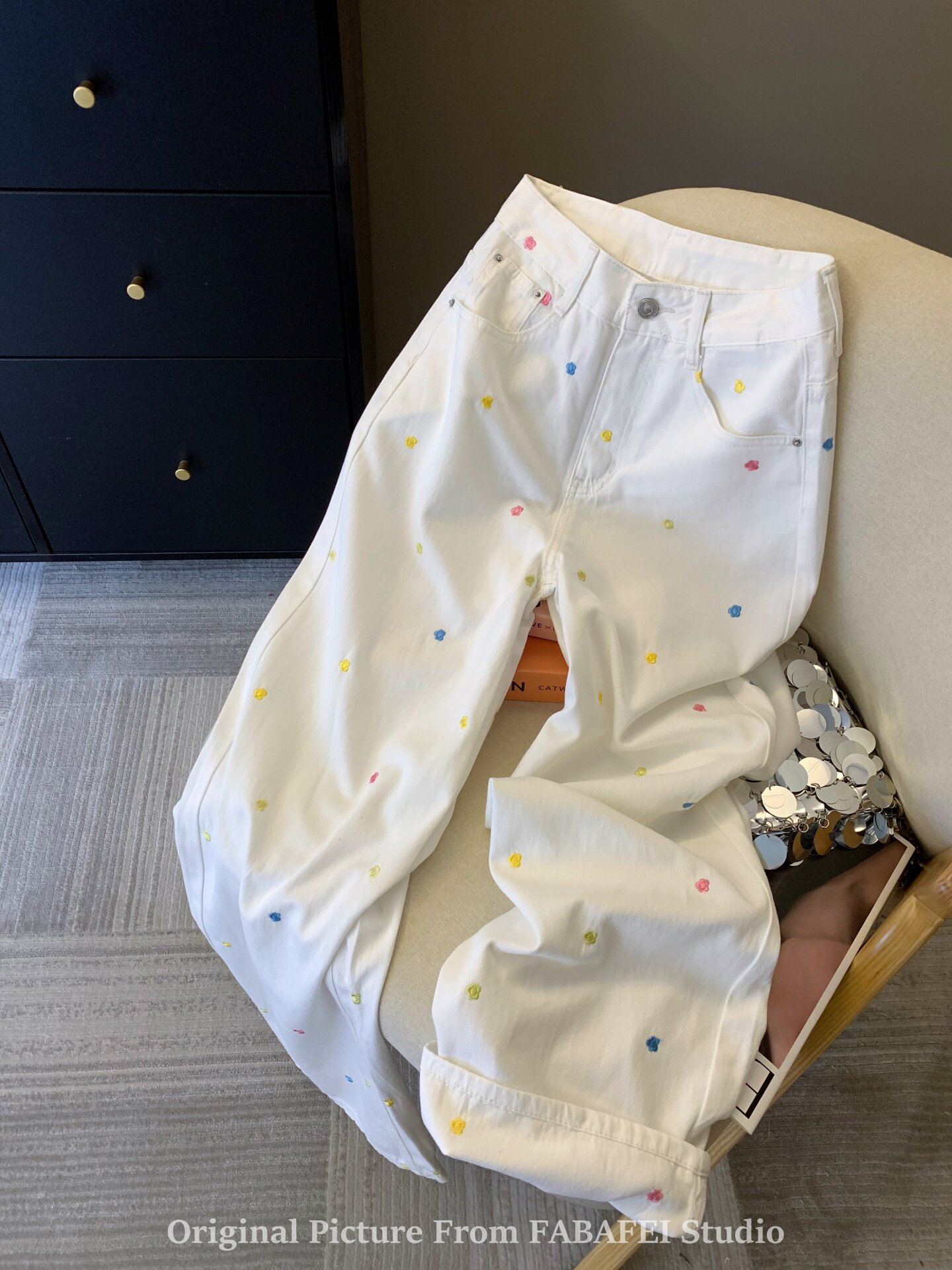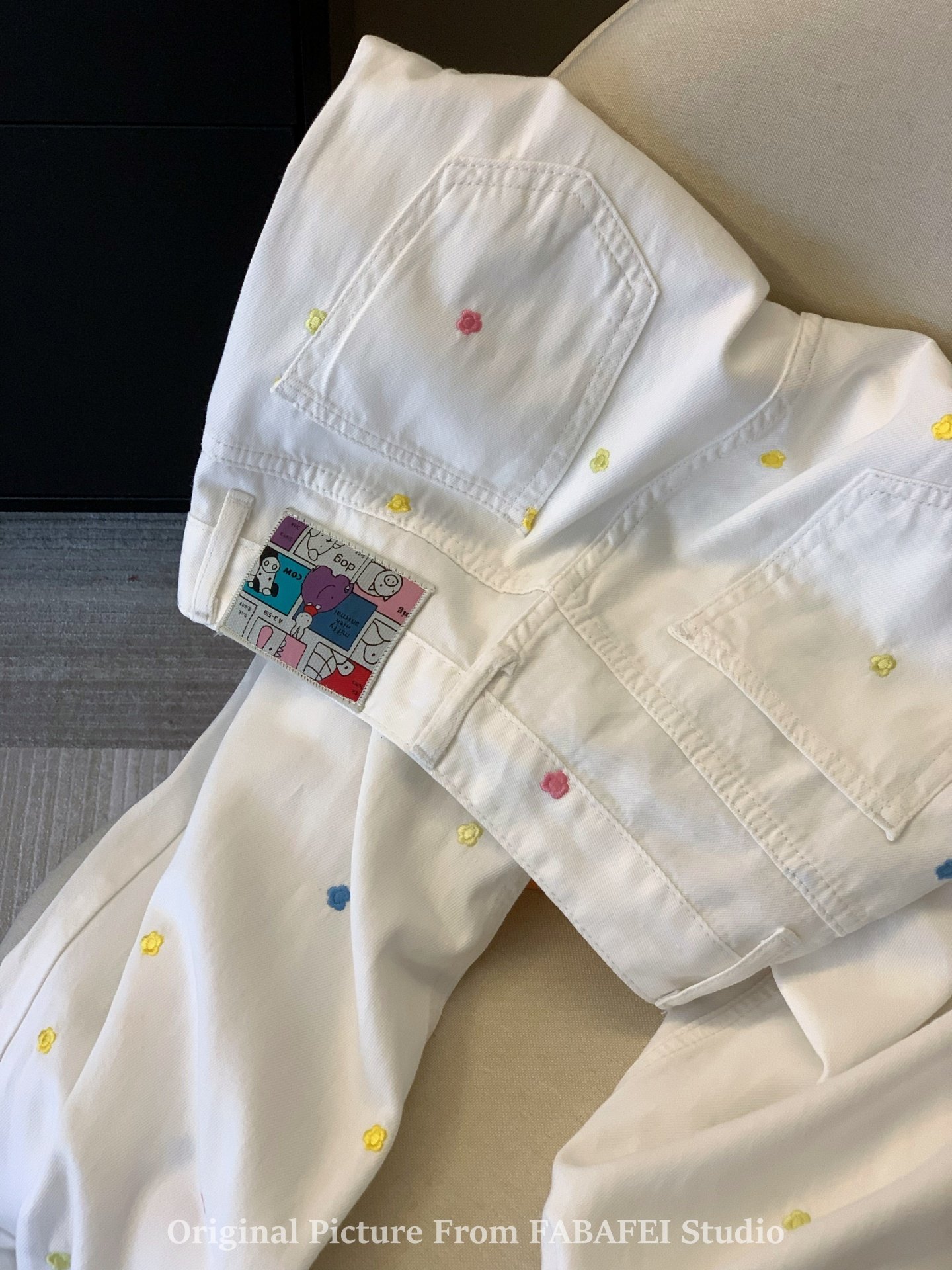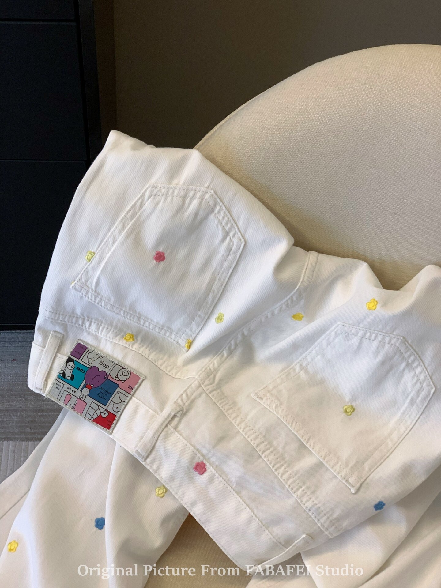 Small Floral Embroidered White Jeans for Women, 2025 Summer Design, Cuffed Straight-Leg Pants, Wide-Leg, Slimming, Floor-Length Pants