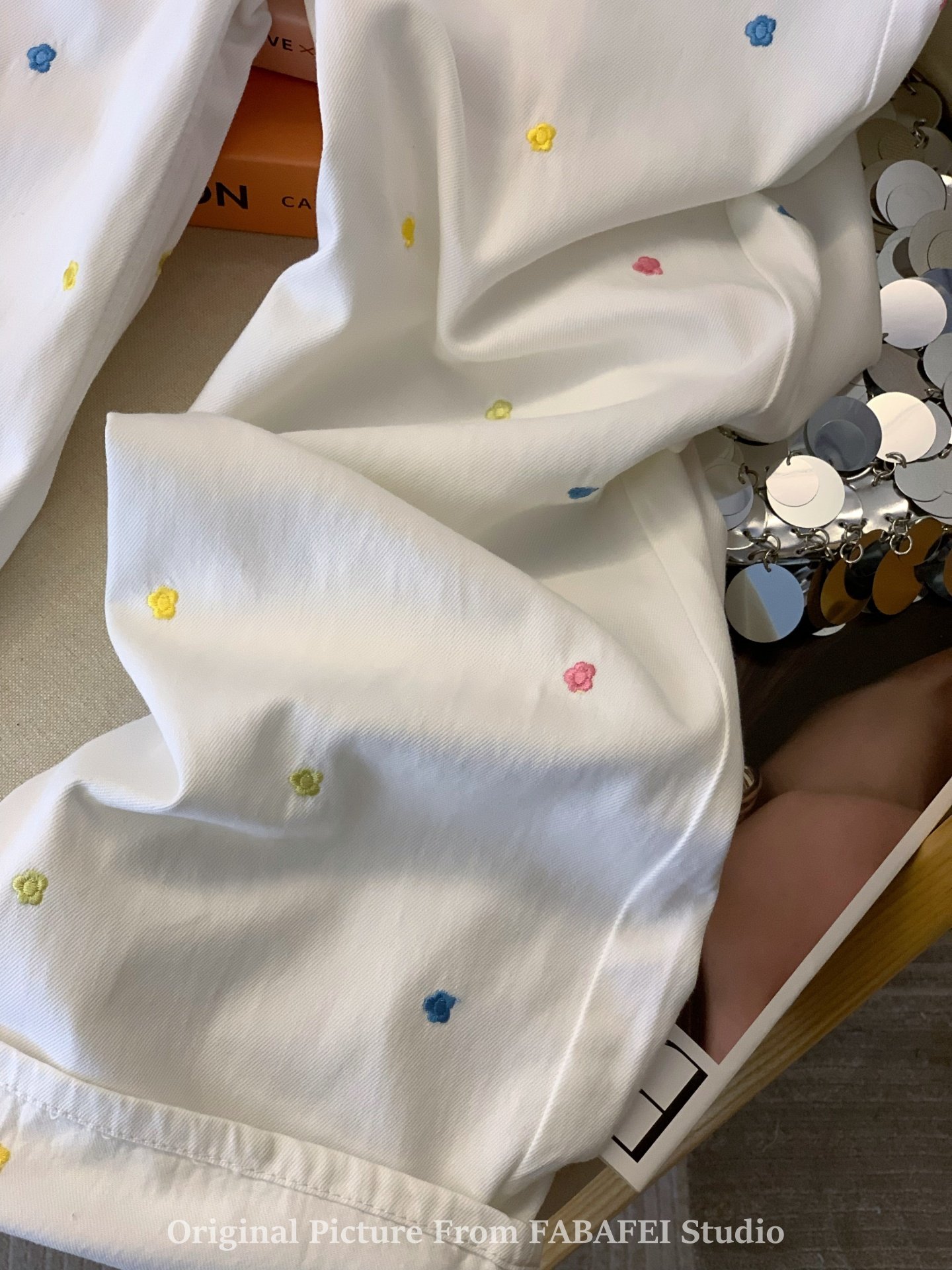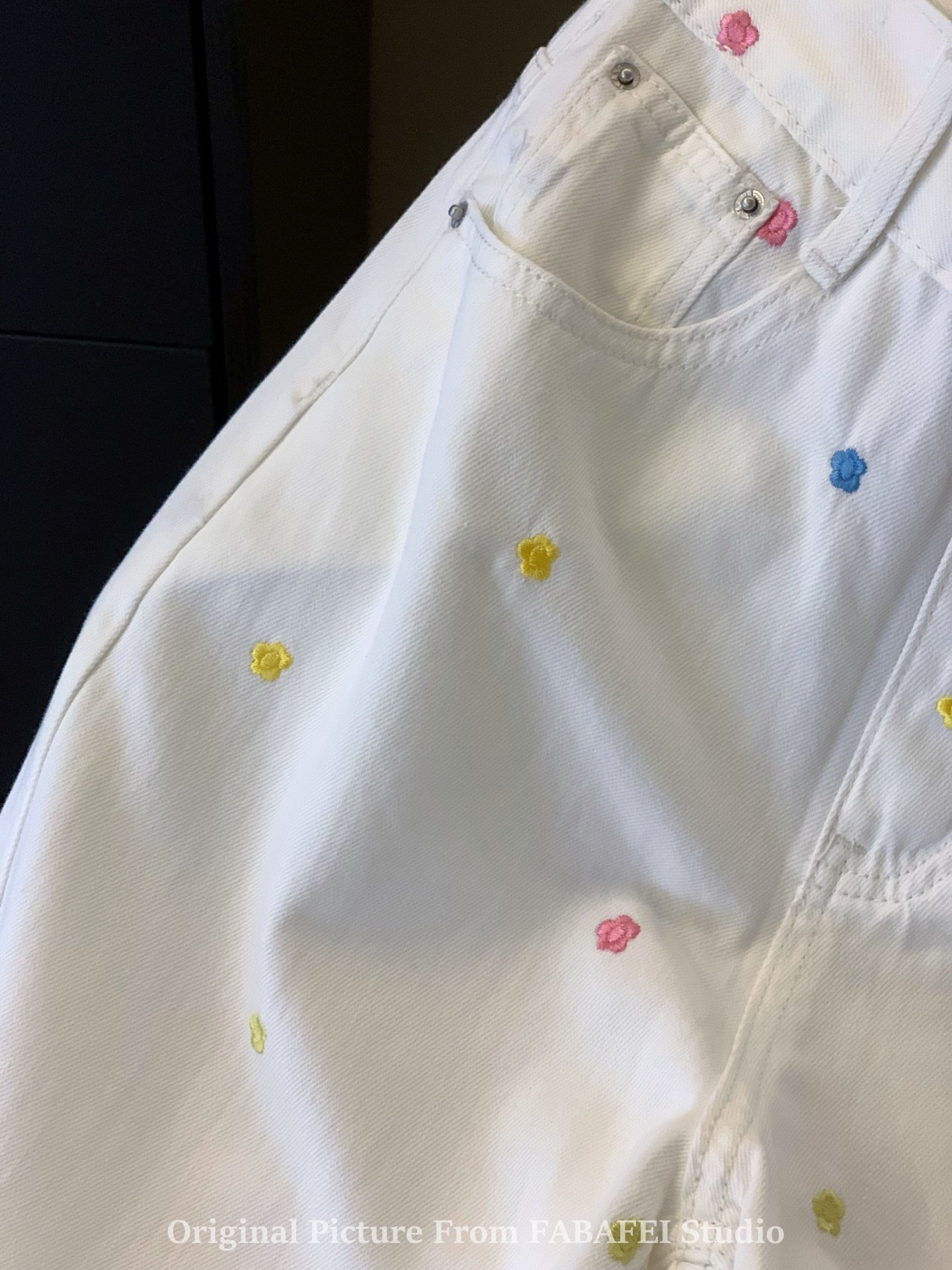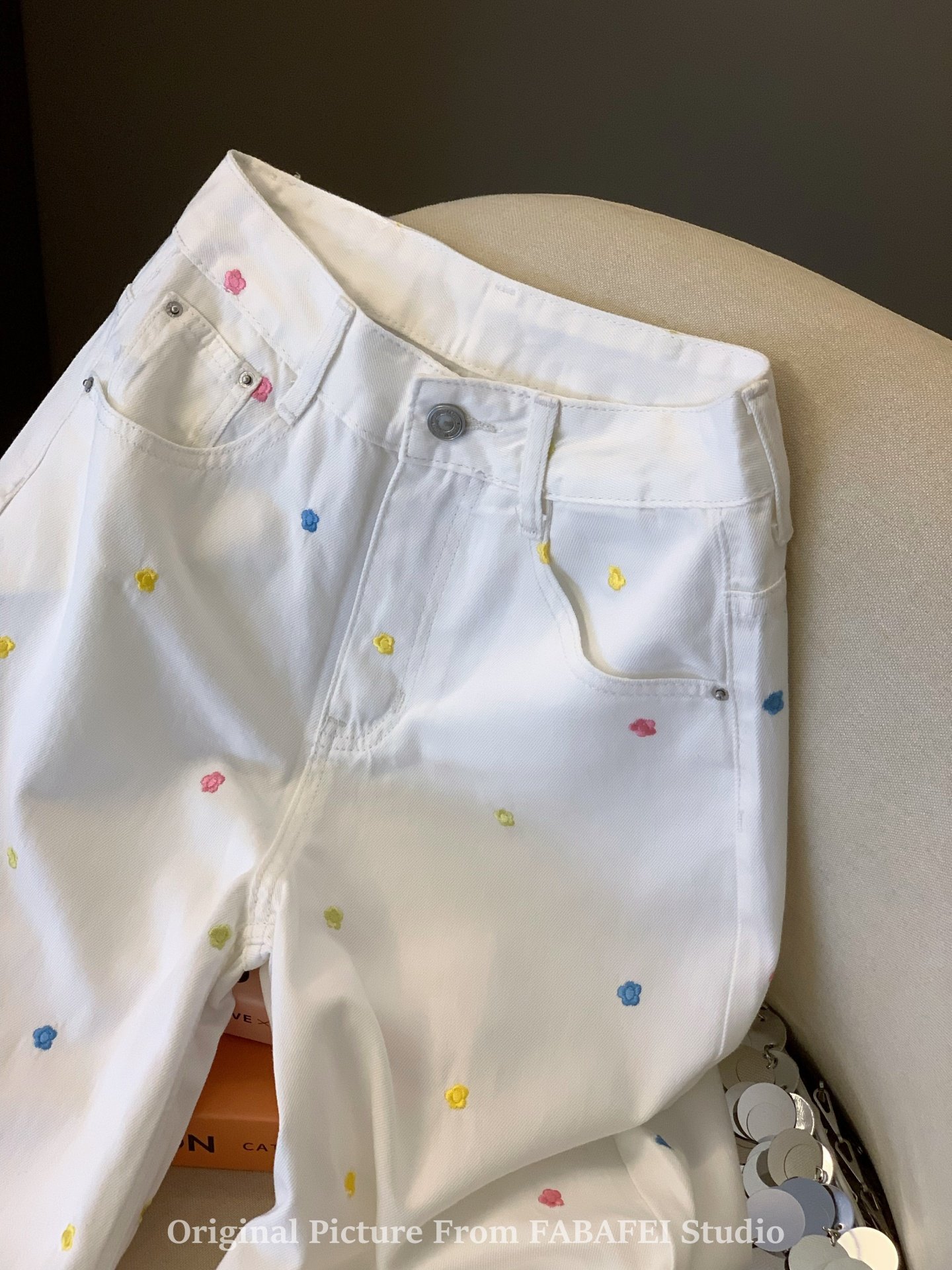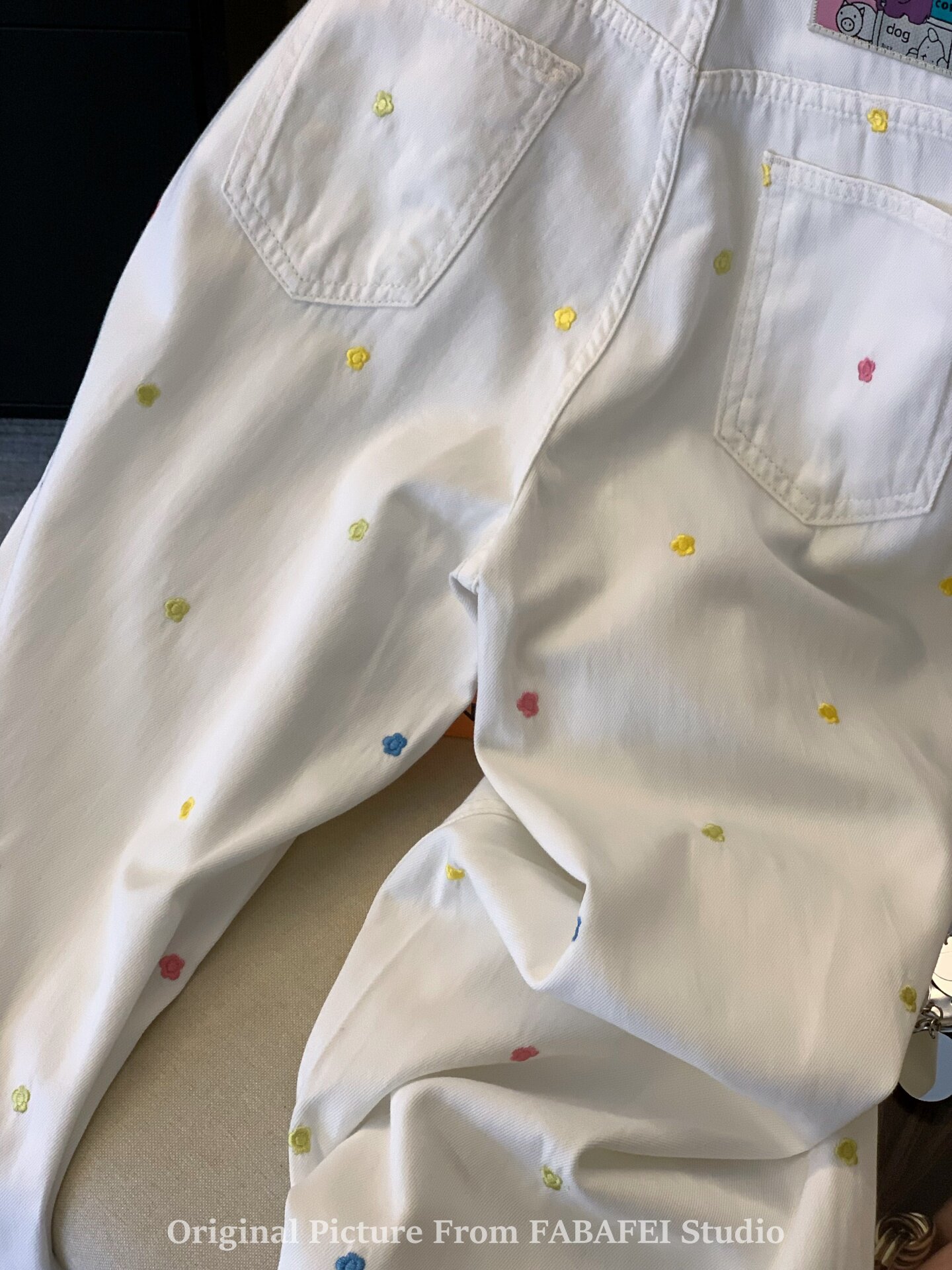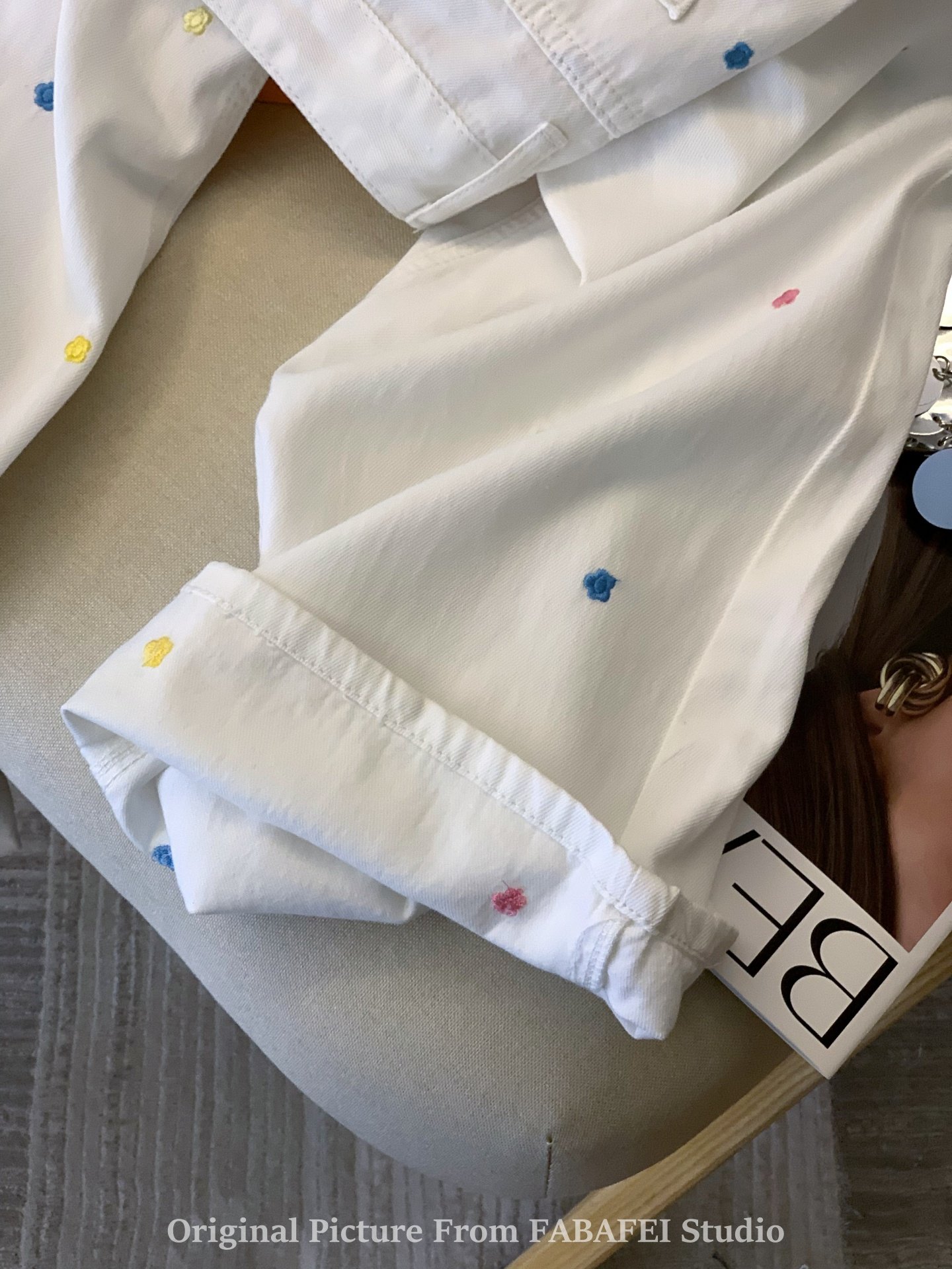Small Floral Embroidered White Jeans for Women, 2025 Summer Design, Cuffed Straight-Leg Pants, Wide-Leg, Slimming, Floor-Length Pants