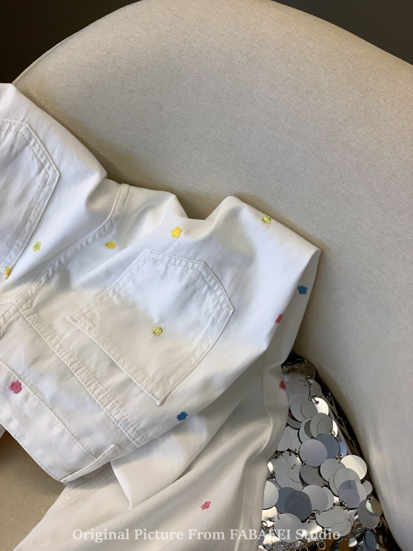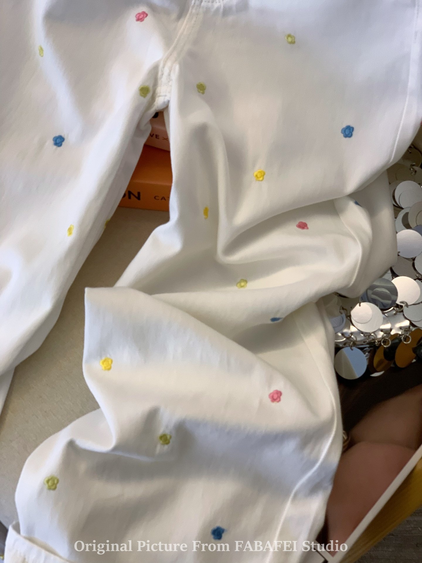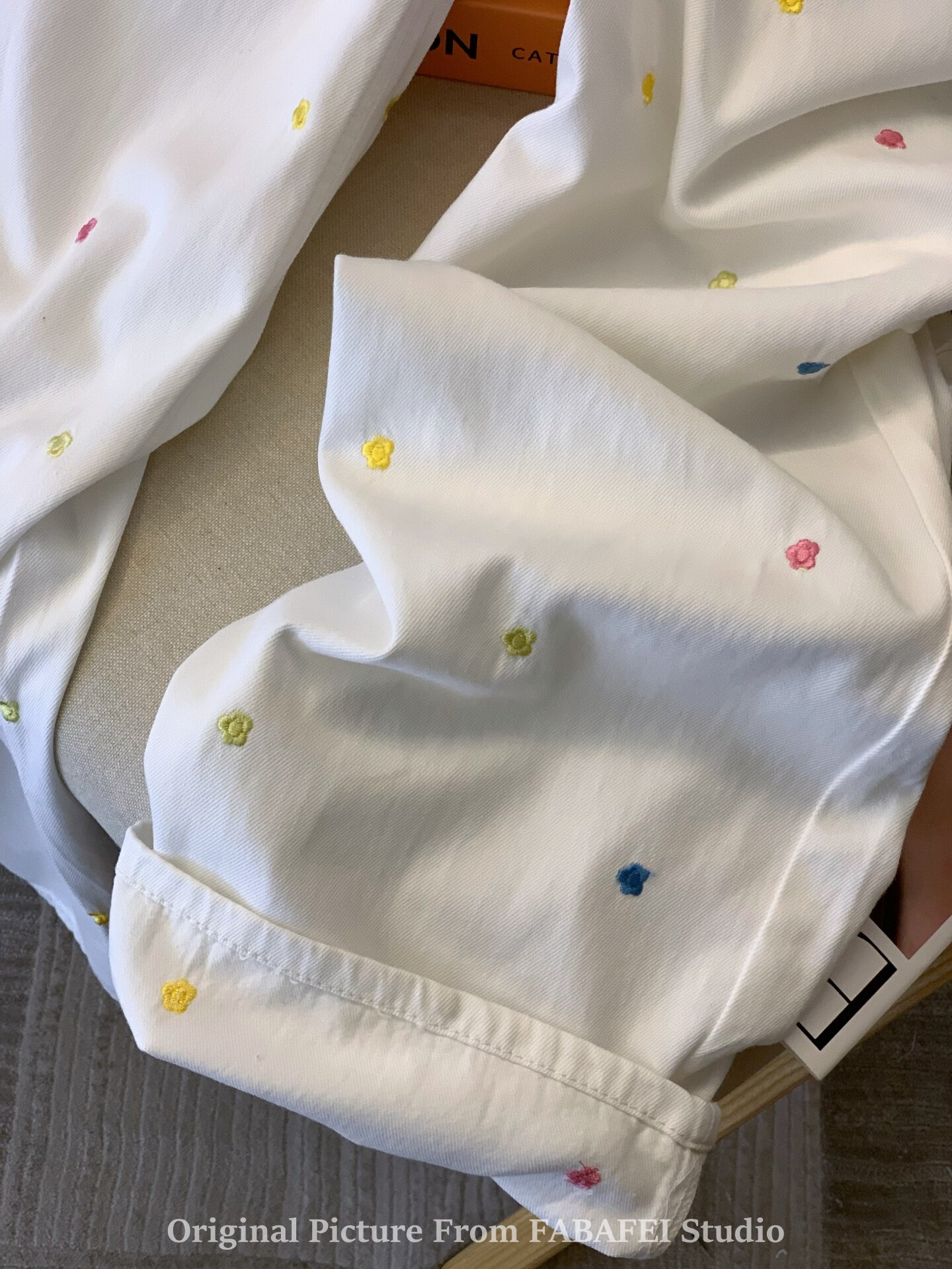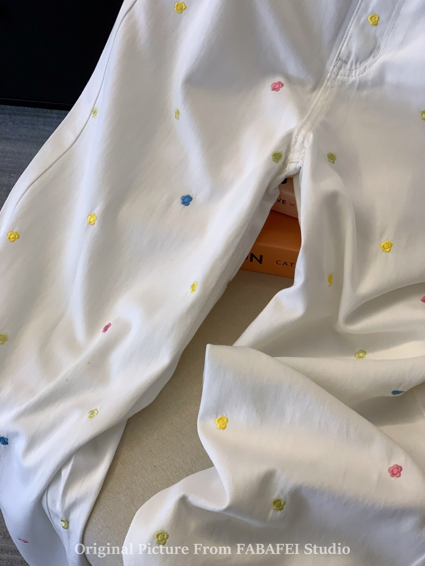 Small Floral Embroidered White Jeans for Women, 2025 Summer Design, Cuffed Straight-Leg Pants, Wide-Leg, Slimming, Floor-Length Pants
