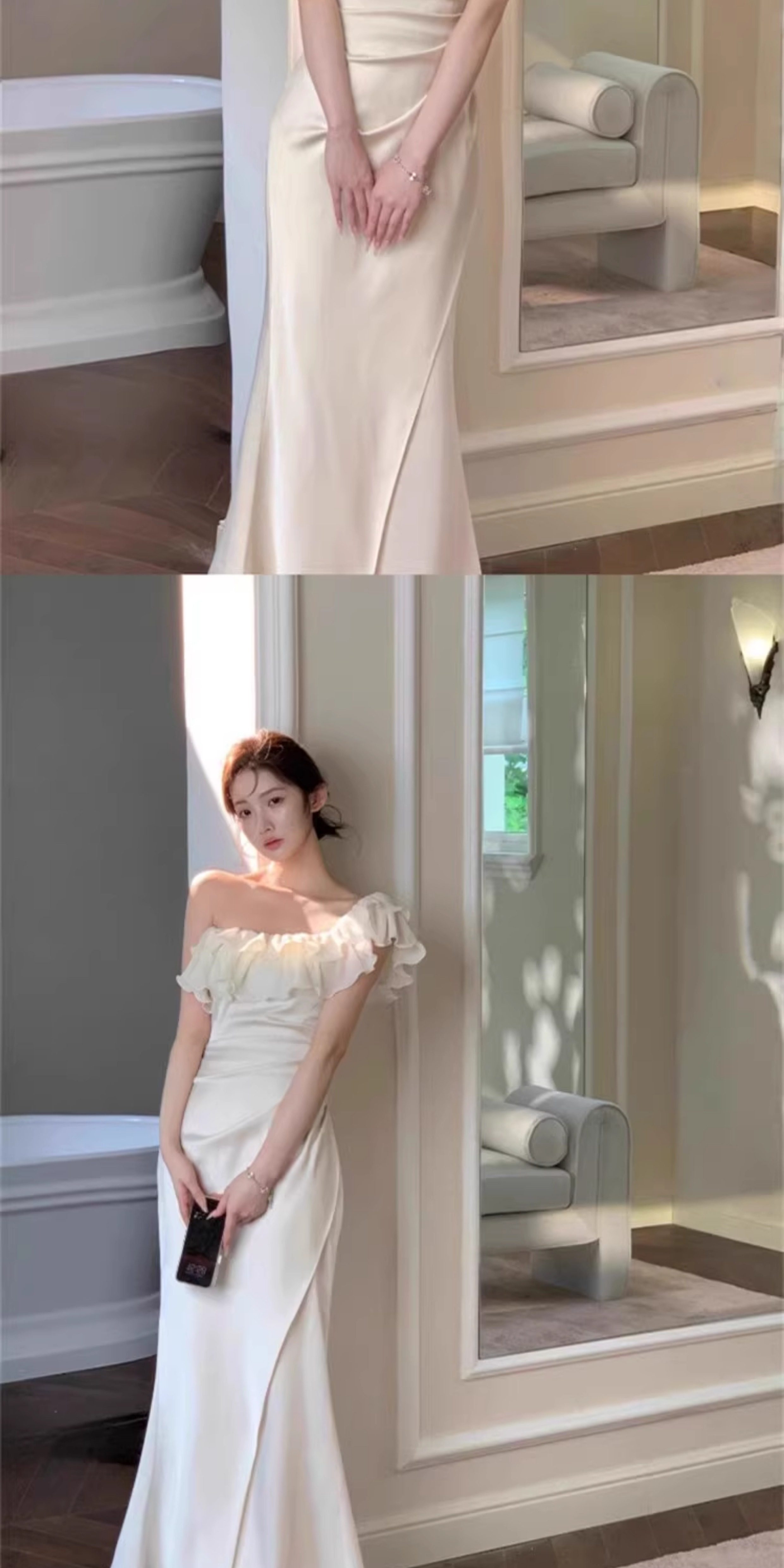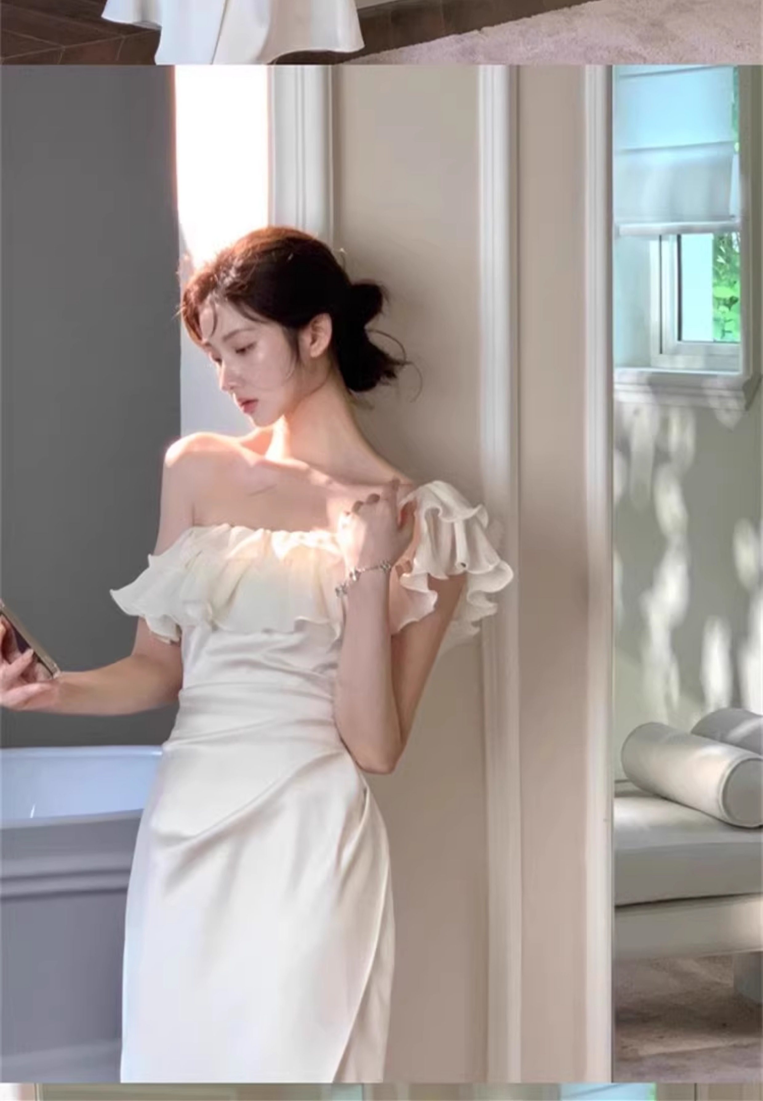 法式一字肩绝美缎面连衣裙高级感名媛气质轻奢宴会生日小礼服长裙