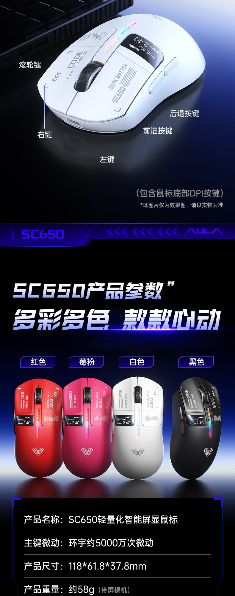 狼蛛(AULA)SC580/650无线鼠标 游戏鼠标电竞专用 有线无线蓝牙三模 可充电 轻量化鼠标 电脑键盘鼠标套装 SC580X【浅紫色】+防滑贴