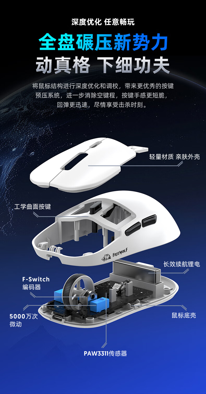 Free Wolf A6 Gaming-Maus mit drei Modi, kabellos, kabelgebunden, Bluetooth, E-Sport, leicht, universeller USB-Desktop-Laptop, ergonomische Peripheriegeräte für Jungen und Mädchen, PAW3311, lange Akkulaufzeit, A6 Rot, drei Modi/24000 DPI – 1K Rückgaberate