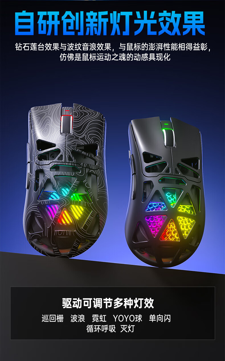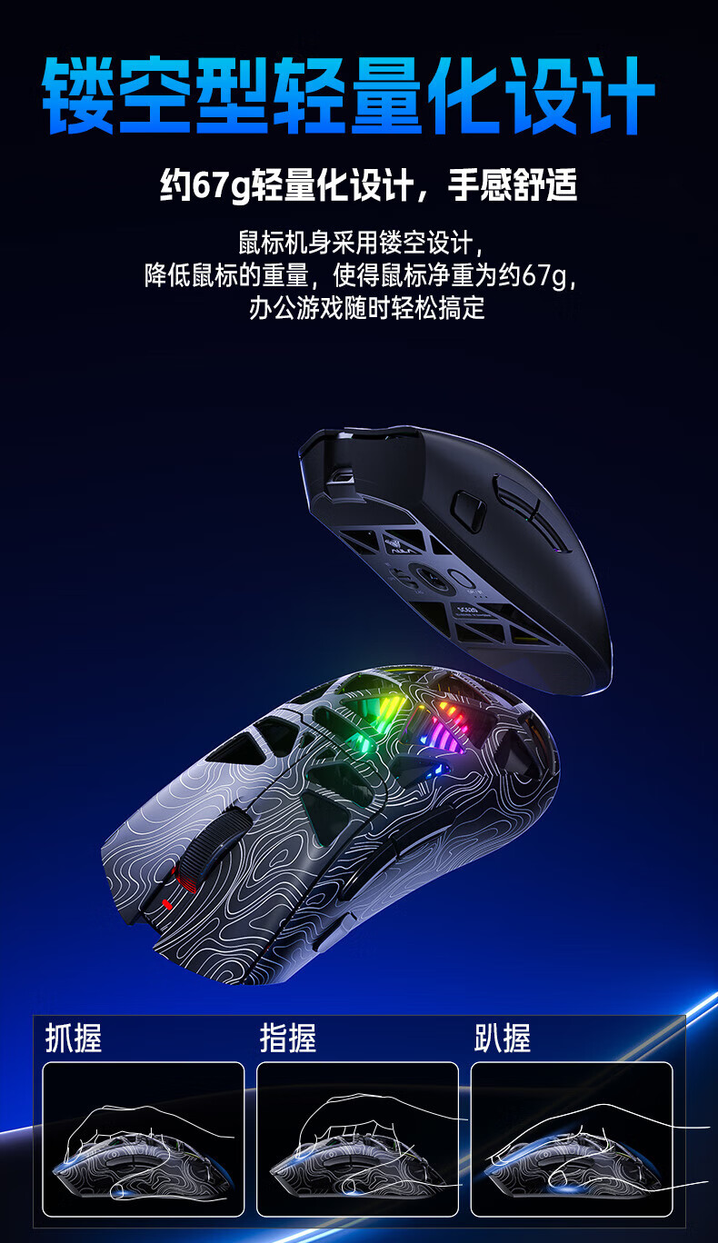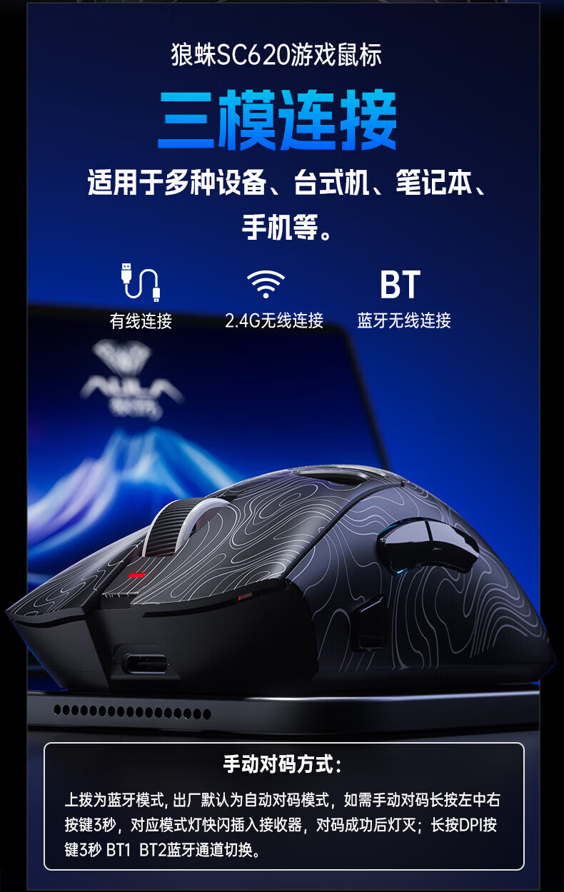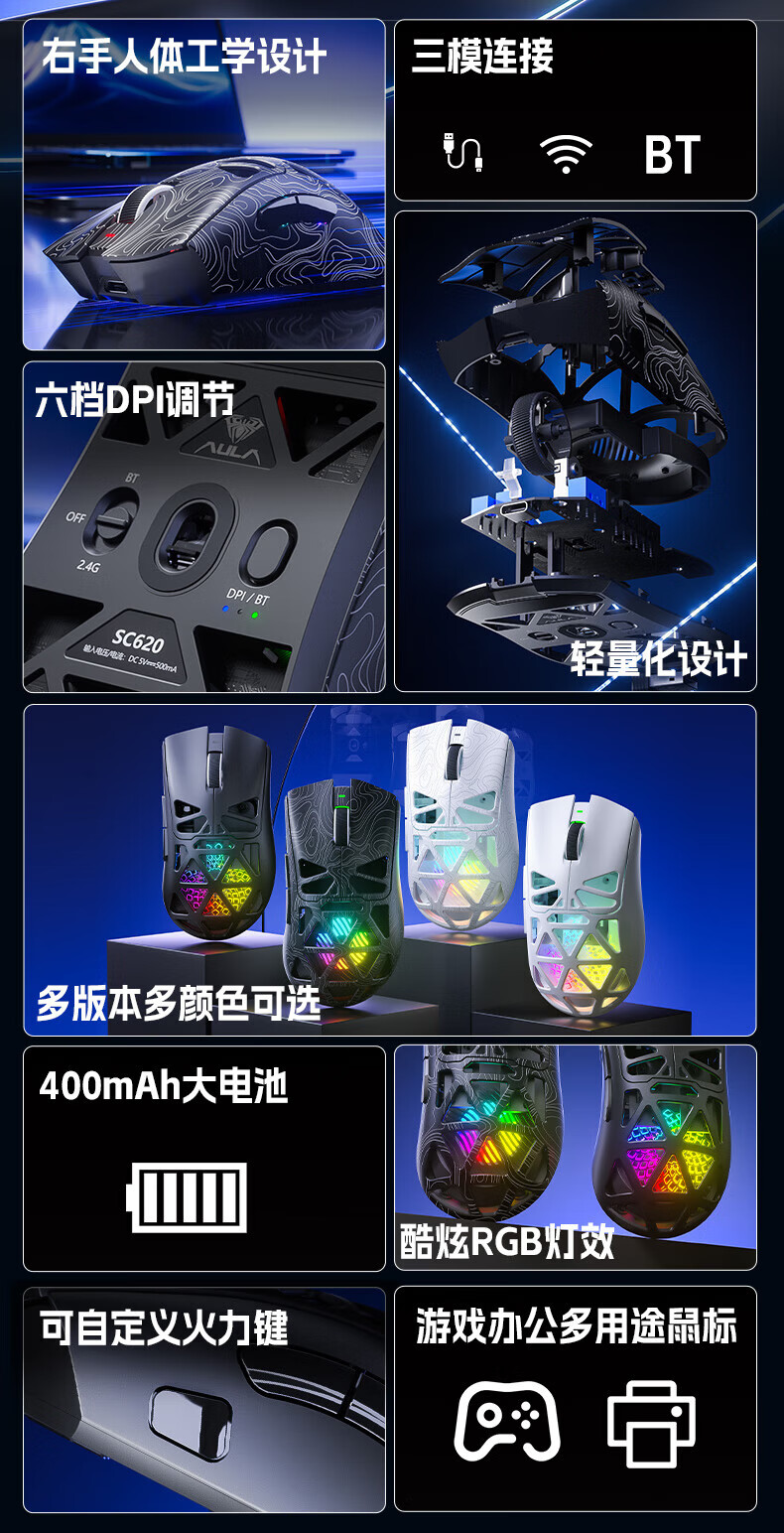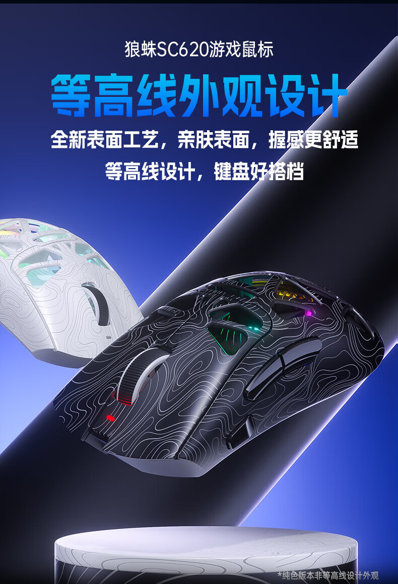 狼蛛SC620有线/无线/蓝牙三模游戏电竞鼠标镂空RGB灯效充电6档灵敏度吃鸡无畏契约电脑轻量化办公鼠标 【镂空-黑色】三模鼠标+自定义火力键