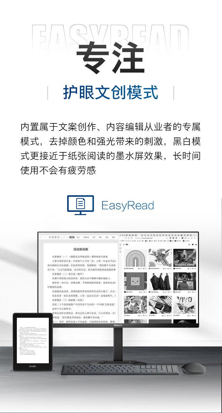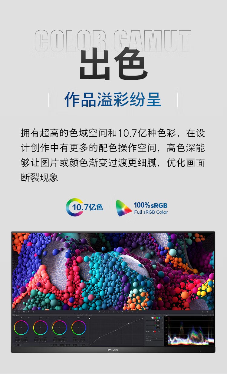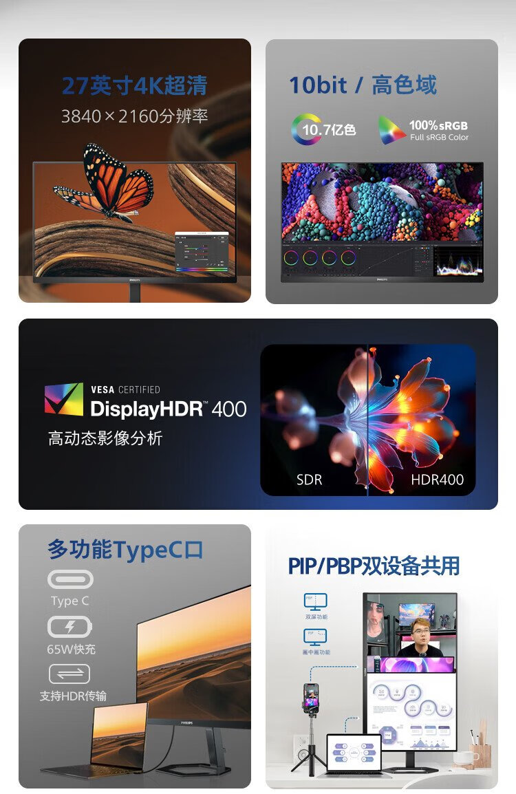 飞利浦27英寸 4K IPS 10bit出厂校准 HDR400 TypeC65W 低蓝光 办公显示器专业设计屏 国家补贴27E1N5900R