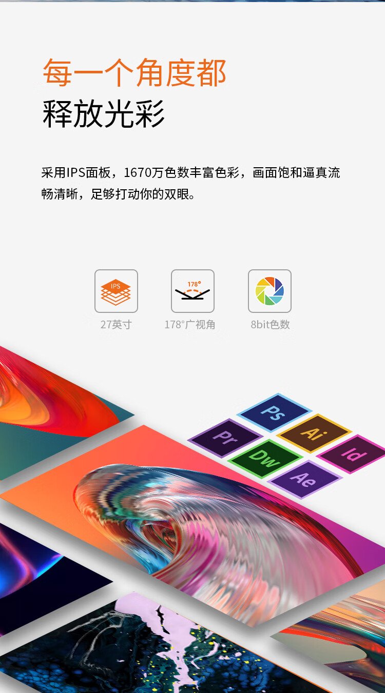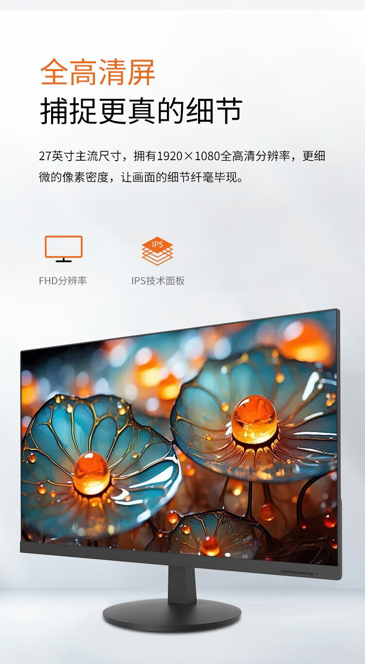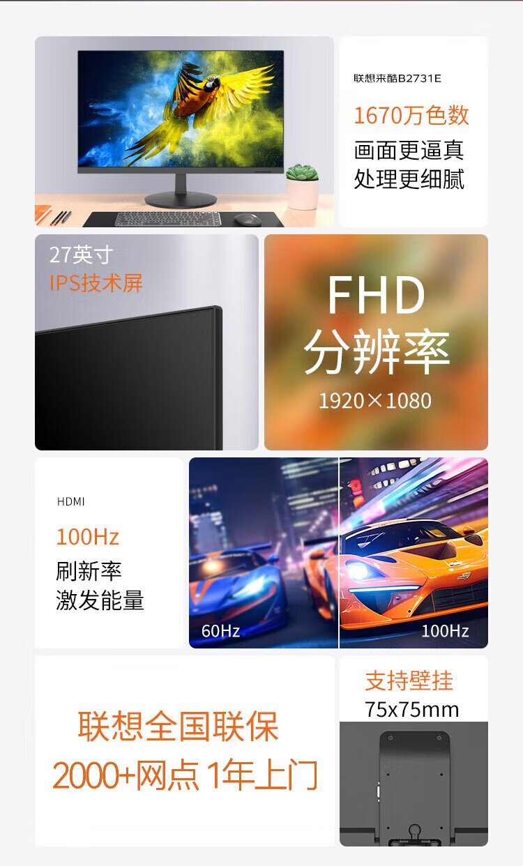 联想(Lenovo)来酷27英寸IPS高清显示器 100Hz 三微边低蓝光不闪屏 家用办公显示器 B2731E