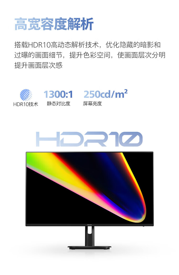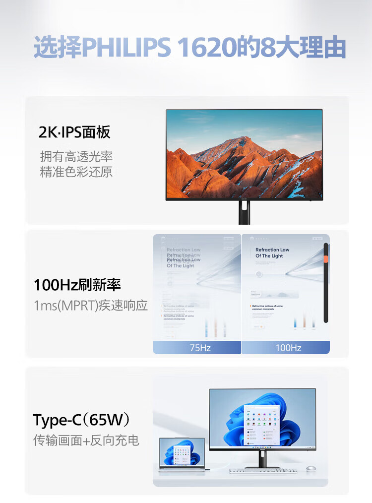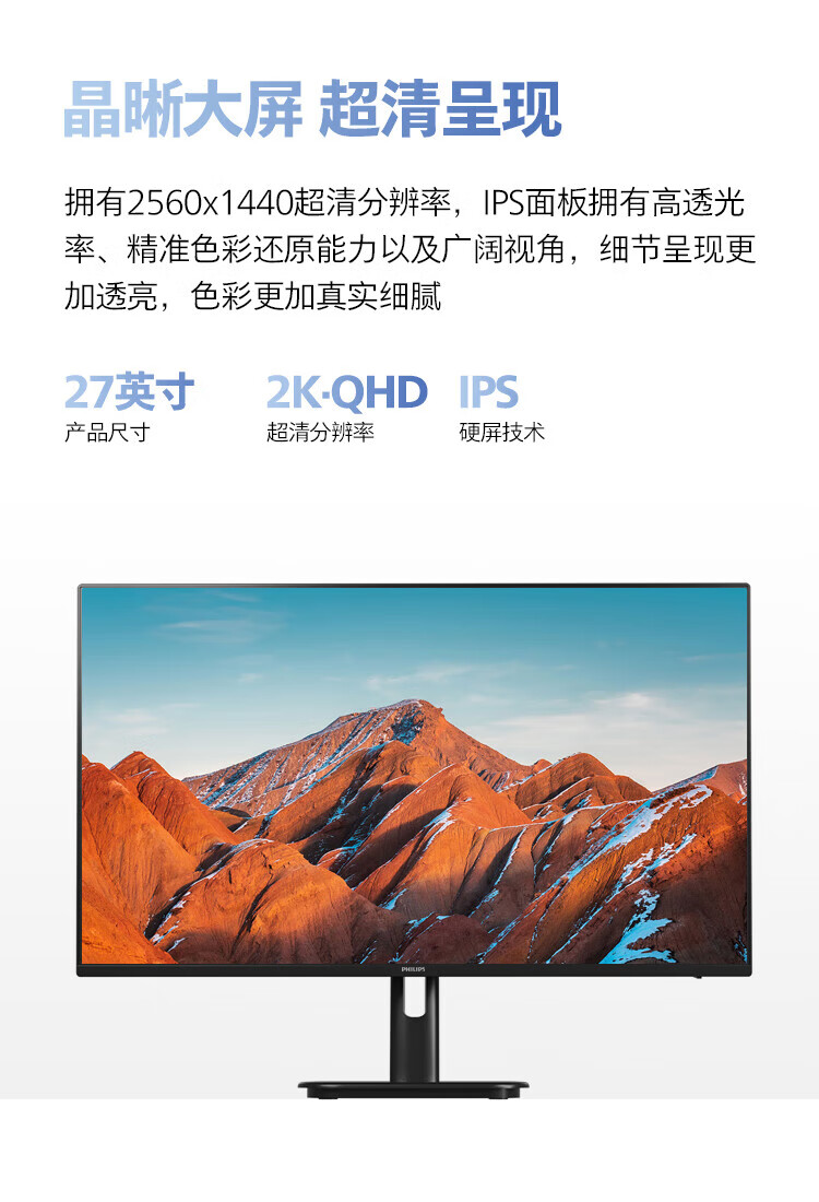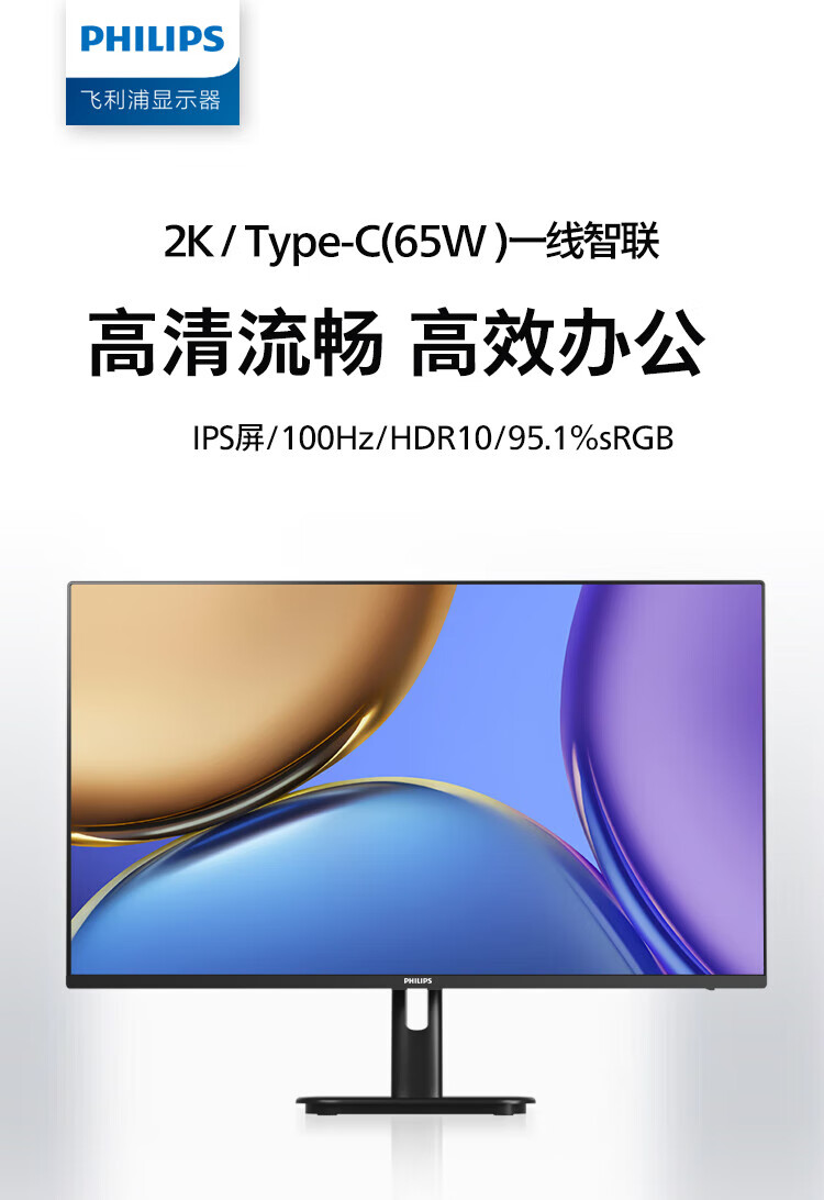 飞利浦27英寸 2K IPS 100Hz HDR TypeC65W 三面窄边框设计 低蓝光不闪屏 办公显示器 27E1N1620