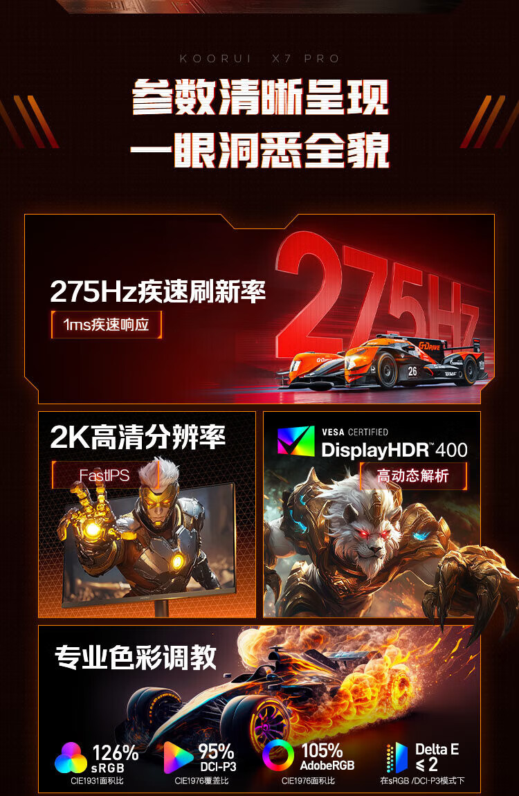 KOORUI Core 27-inch 2K275Hz high brush Fast IPS hardware low blue light HDR400 certification 10bit wide color gamut 1ms e-sports game 240Hz monitor X7 PRO