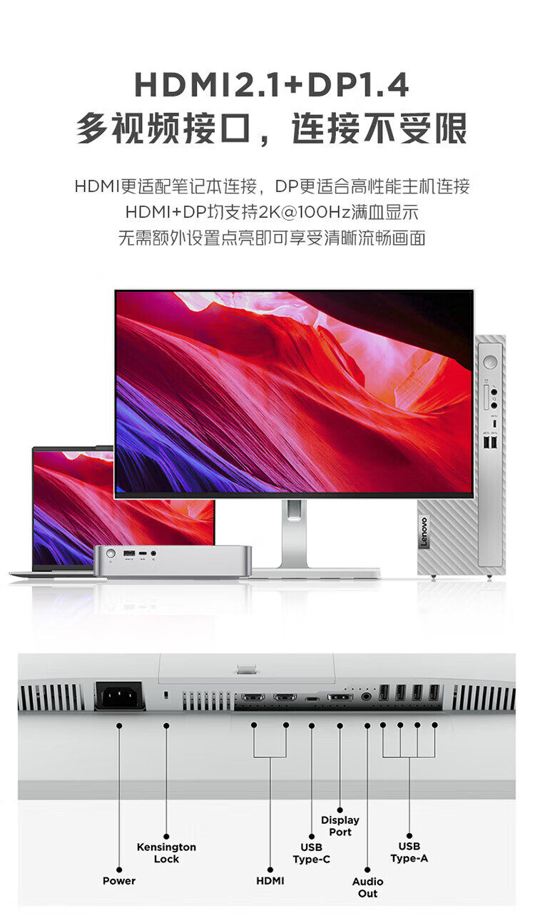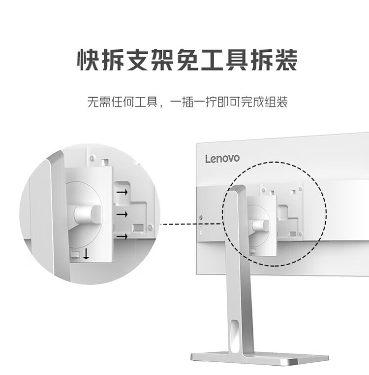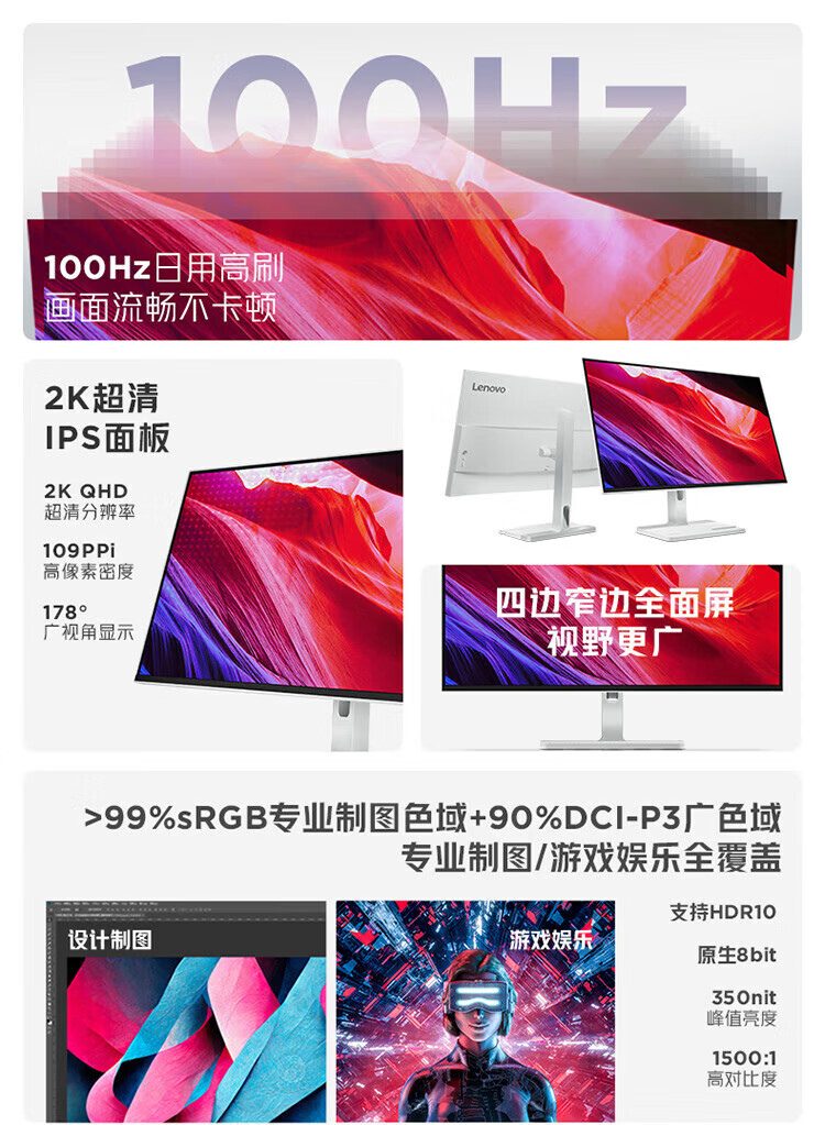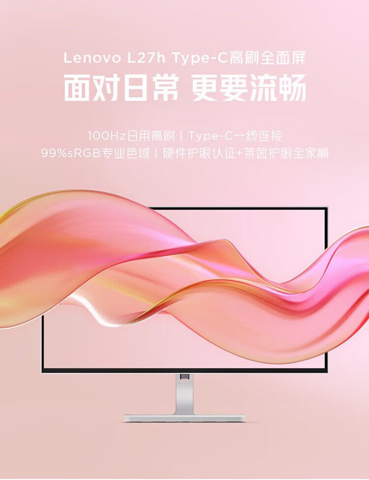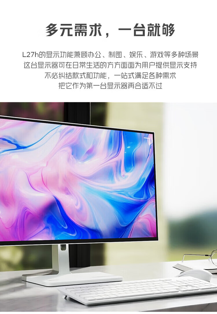 联想 23.8/27英寸显示器 白色 100Hz IPS屏 Type-C75w 全面屏 内置音箱 TUV硬件滤蓝光 升降旋转支架 27英寸电脑显示屏 2K高分画质 L27h-4A