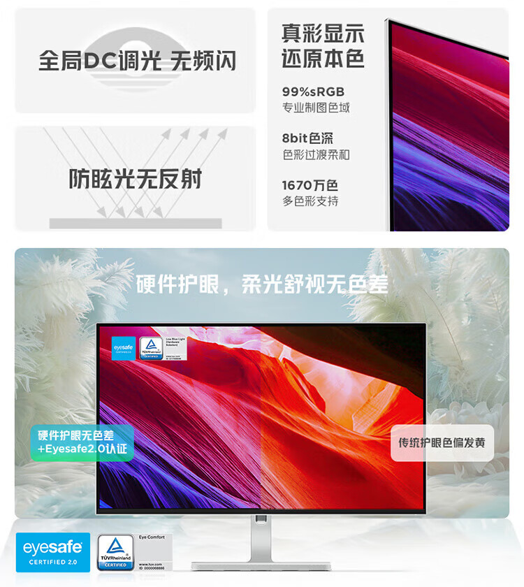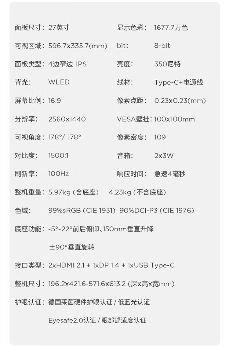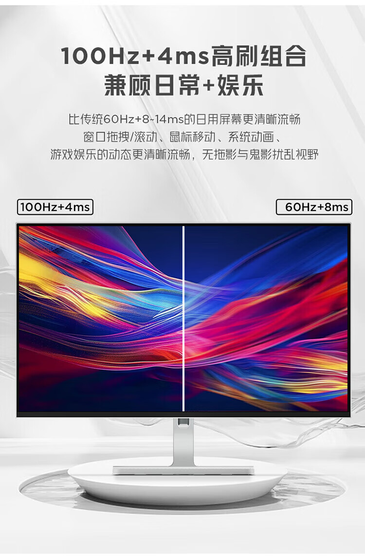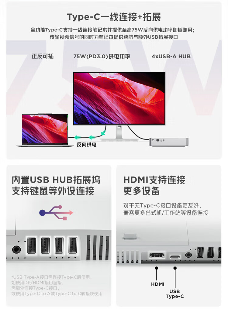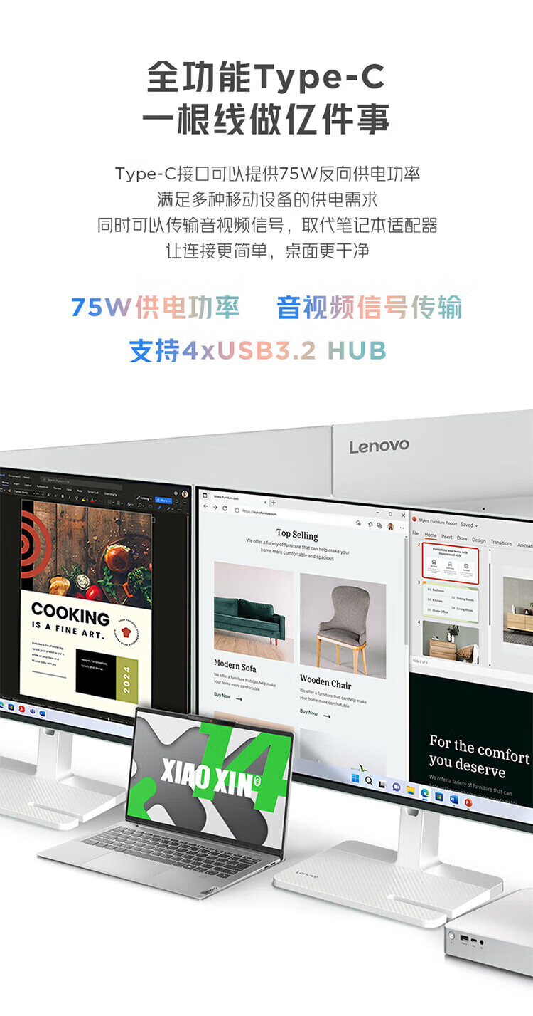 联想 23.8/27英寸显示器 白色 100Hz IPS屏 Type-C75w 全面屏 内置音箱 TUV硬件滤蓝光 升降旋转支架 27英寸电脑显示屏 2K高分画质 L27h-4A