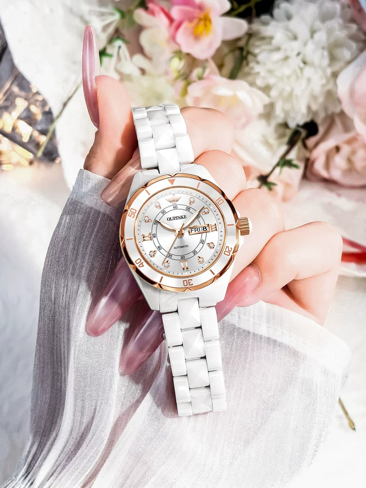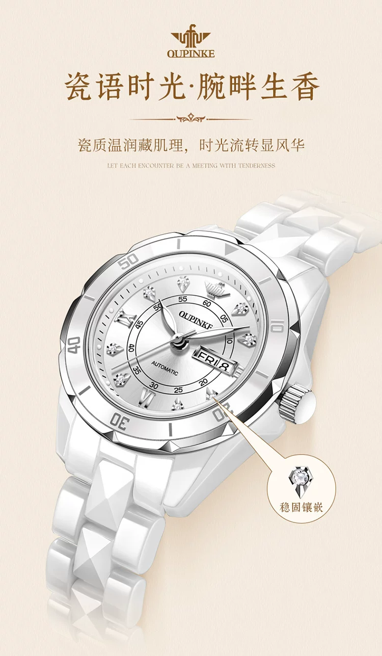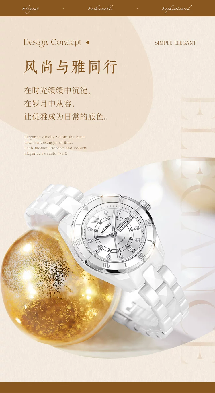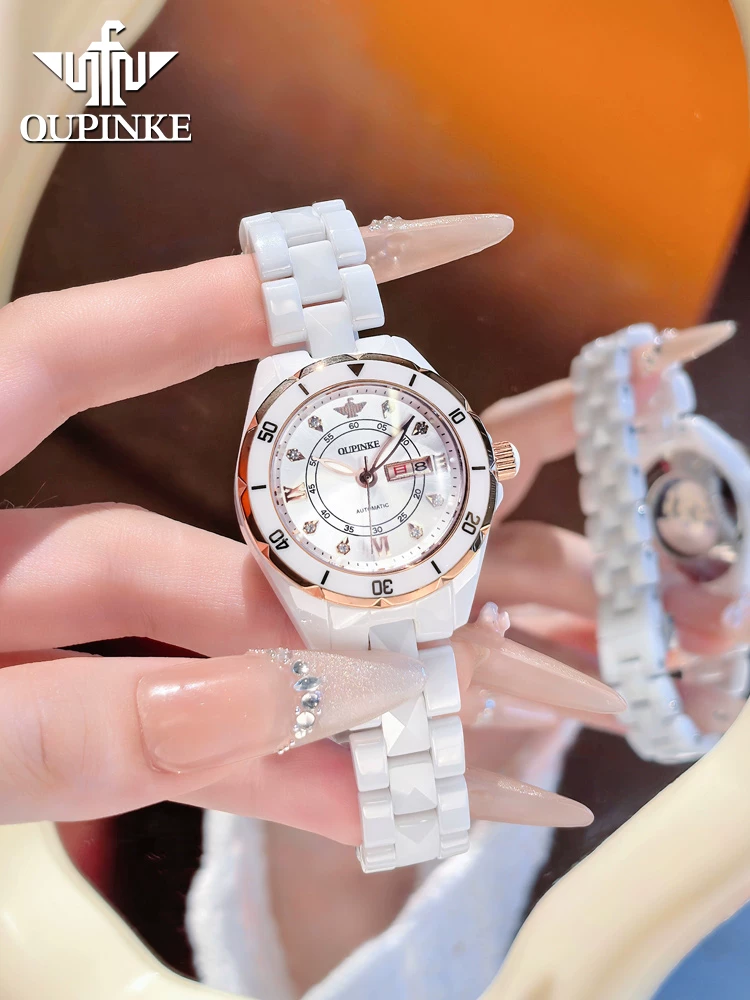 Swiss New Genuine Brand Women's Watch, Trendy and Elegant Ceramic Mechanical Watch with Dual Calendar, High-End and Premium Gift