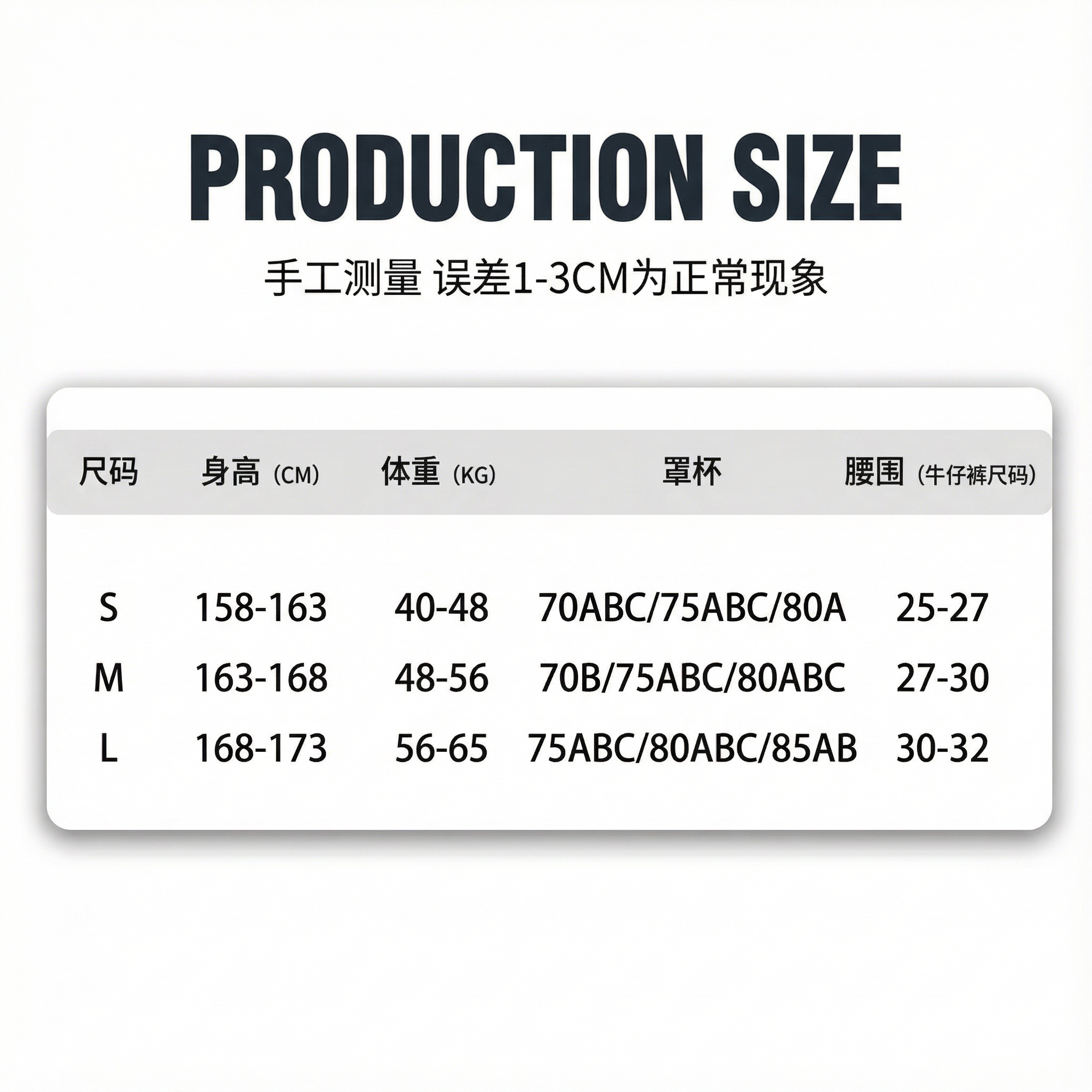 China (cm) 160-165/84-86 165-170 / 88-90 167-172 / 92-96 168-173 / 98-102 170-176 / 106-110