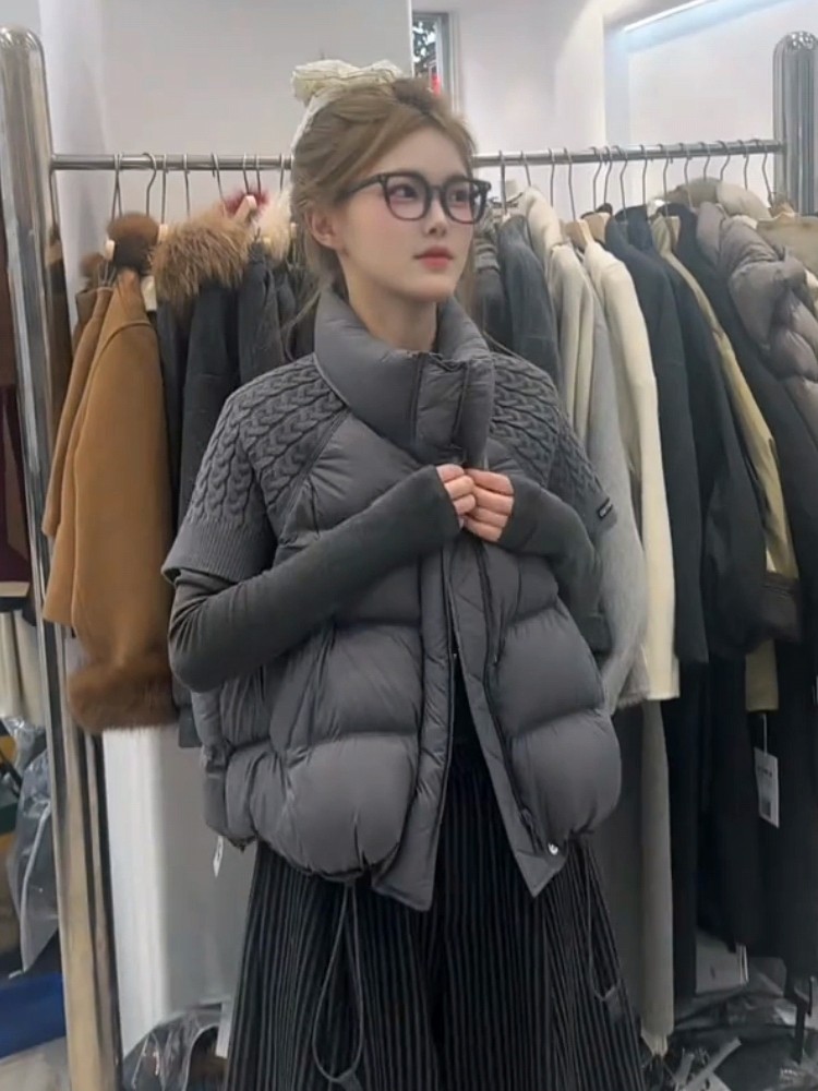 Жилет женский из белого утиного пуха с вязаными рукавами и вставками, новая коллекция осень-зима 2025, повседневный, для миниатюрных женщин, модный.