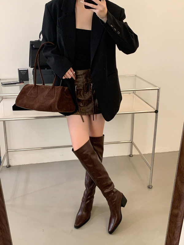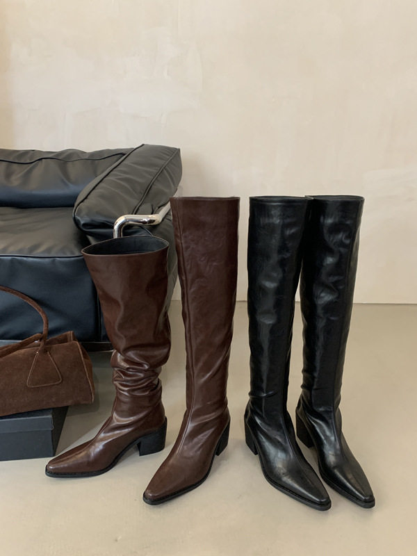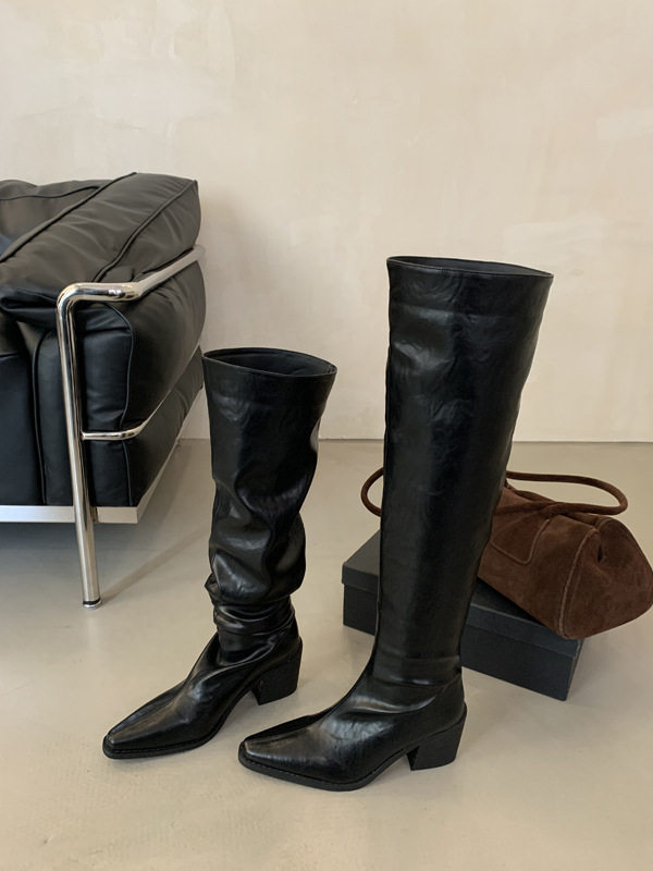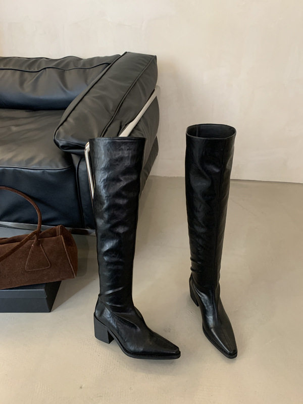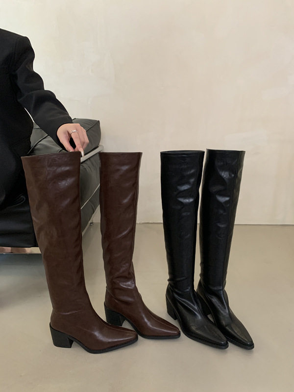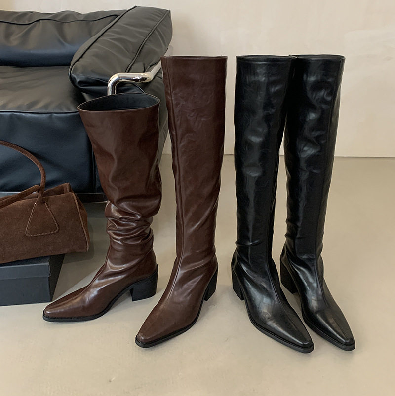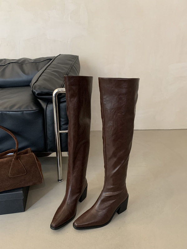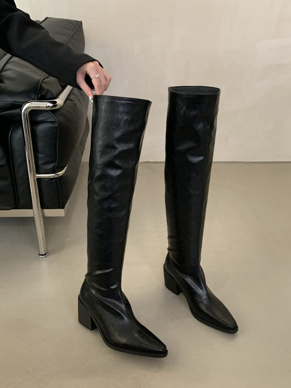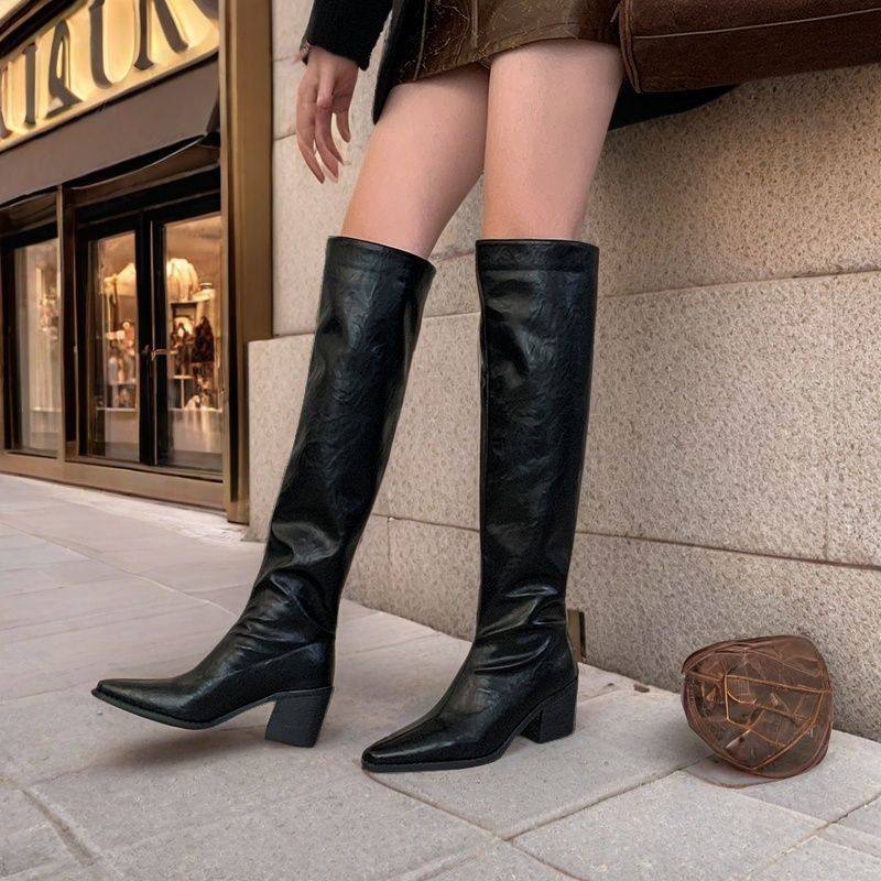 Square-Toe High-Heeled Over-The-Knee Boots, Genuine Leather Slim-Fit Boots, Chunky Heel High Boots, Long Boots, Winter Fleece-Lined Knee-High Boots