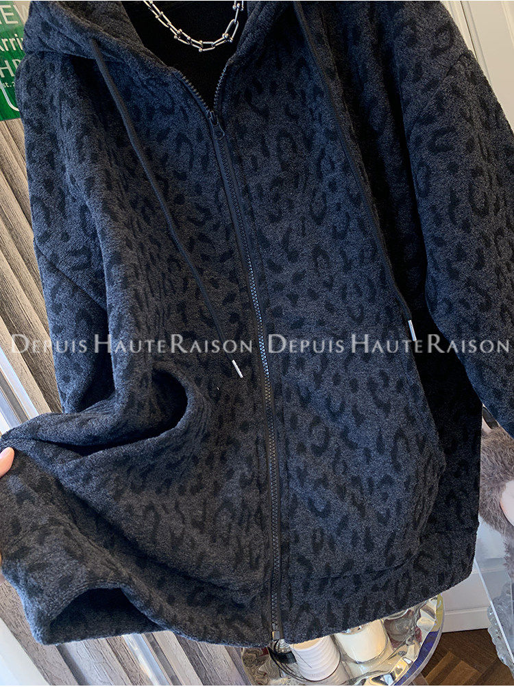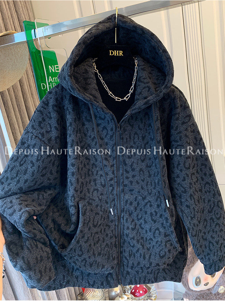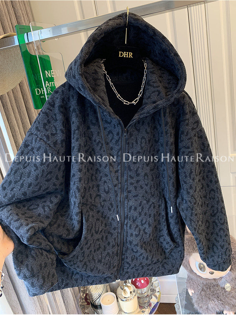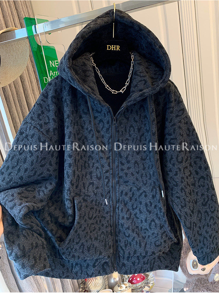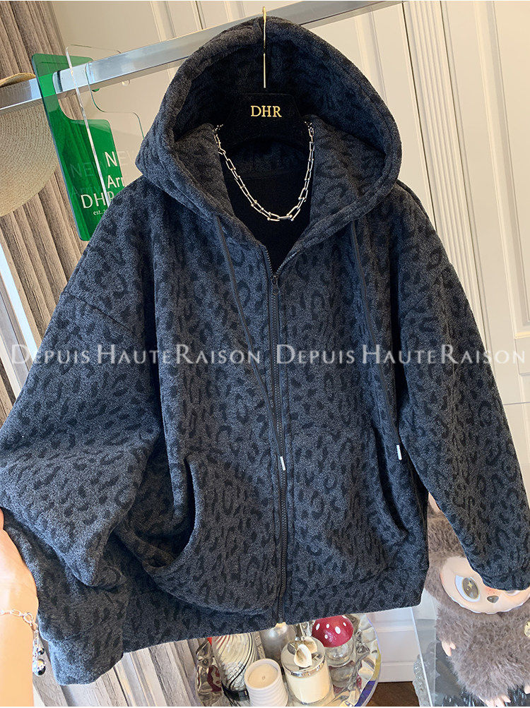 Unique Leopard Print Casual Zip-Up Thickened Fleece Hoodie Jacket for Men and Women, Loose Oversized Top for Autumn and Winter