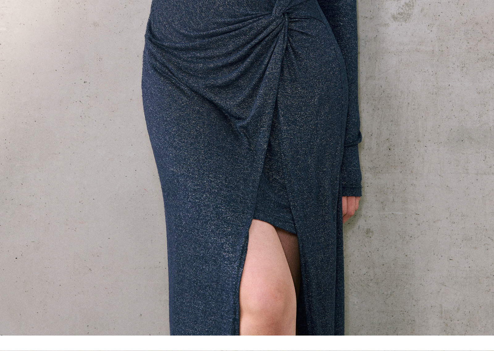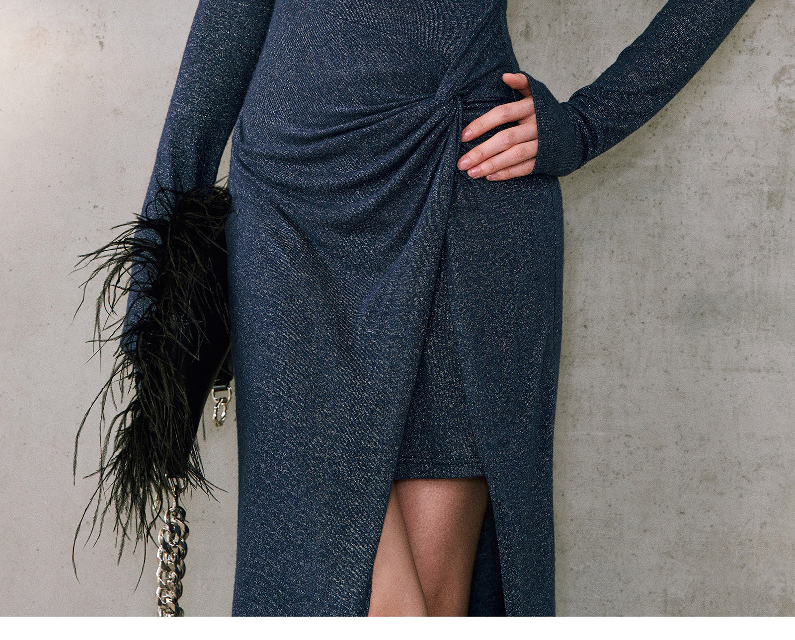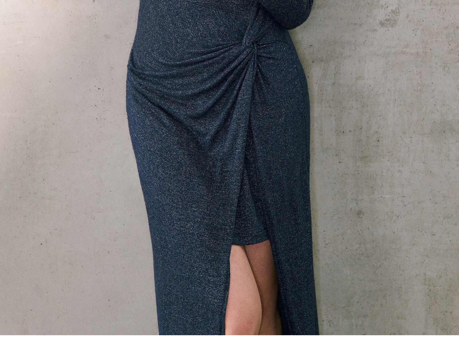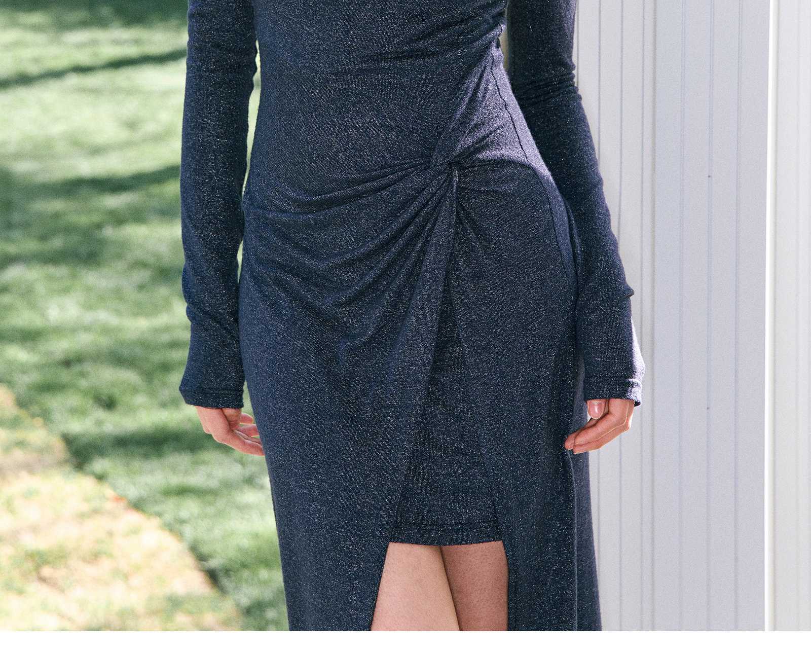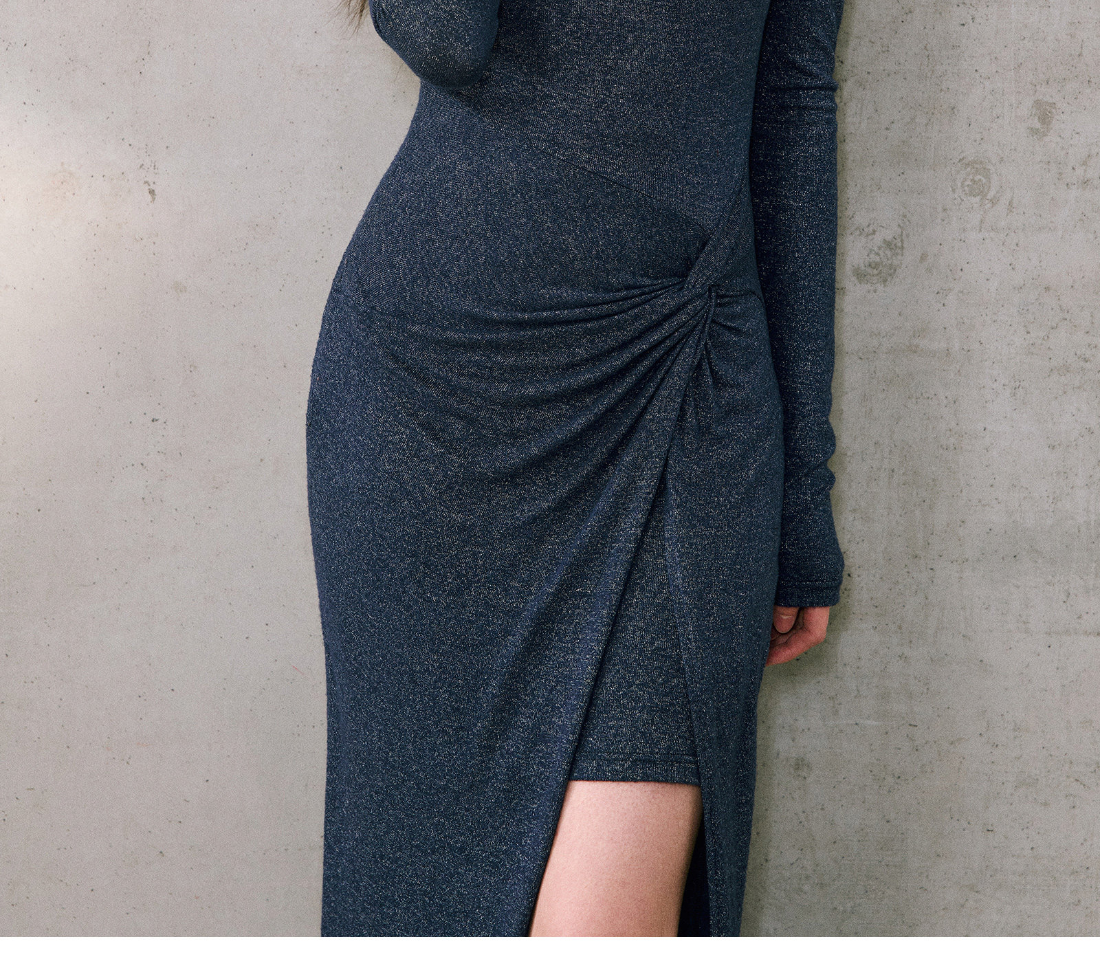 Wangxo[New Arrivals on 01/20 20:00Pm 5% off]Off-Shoulder Twisted Waist-Cinching Slit Dress with Shiny Threads