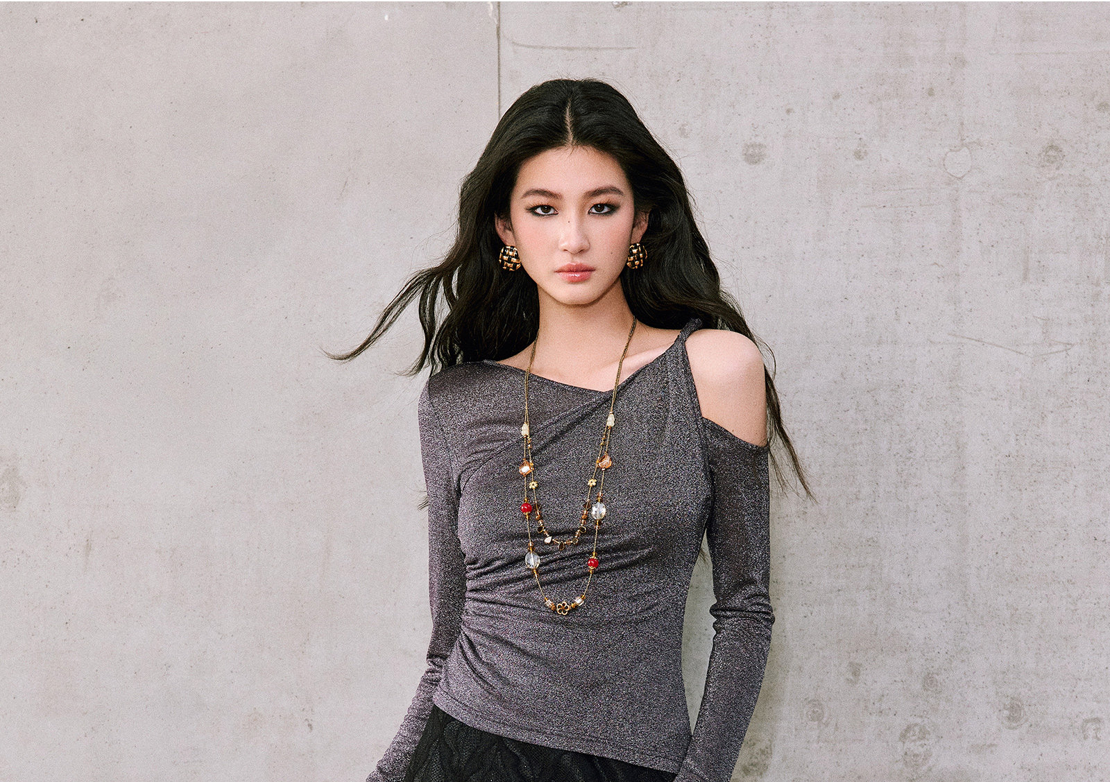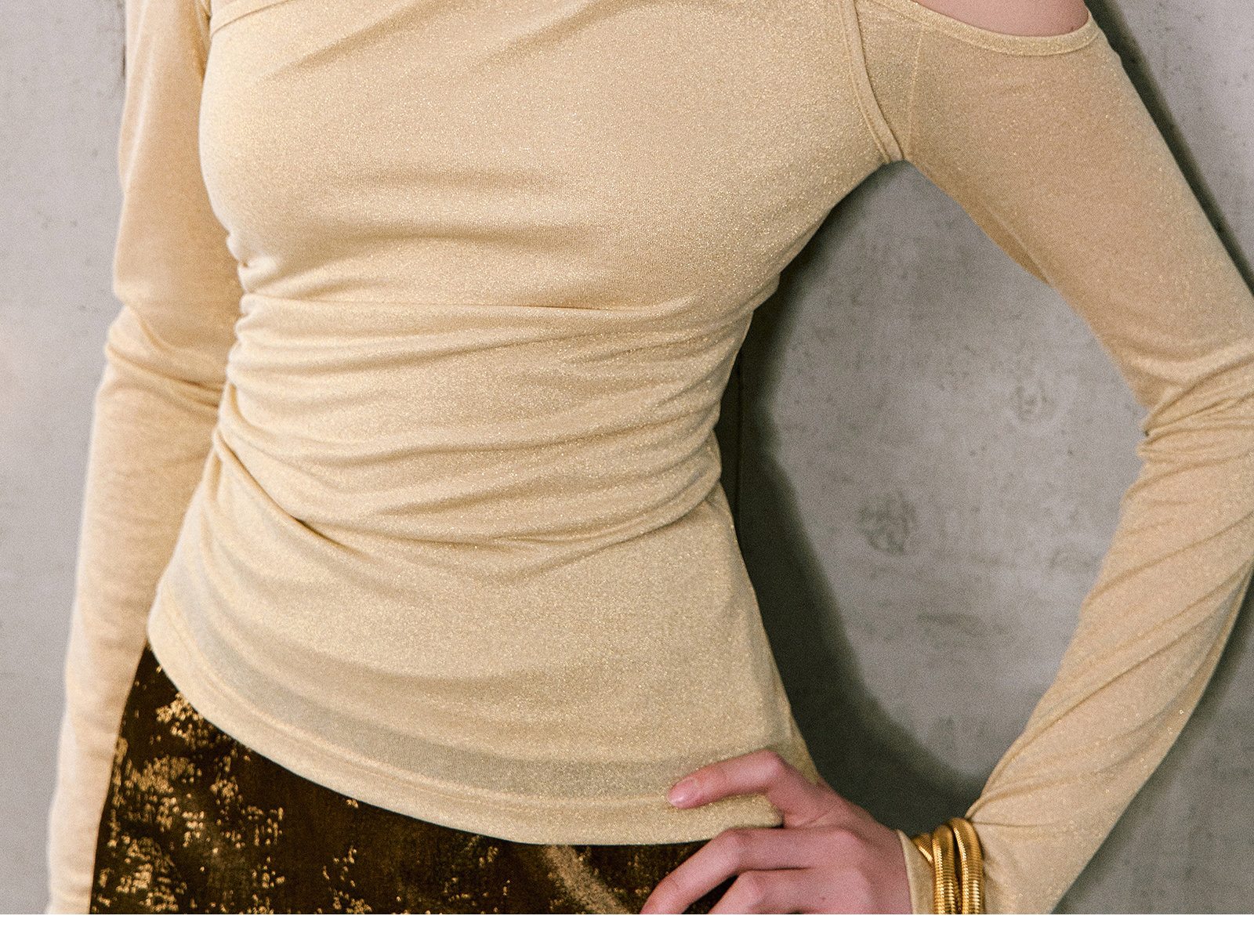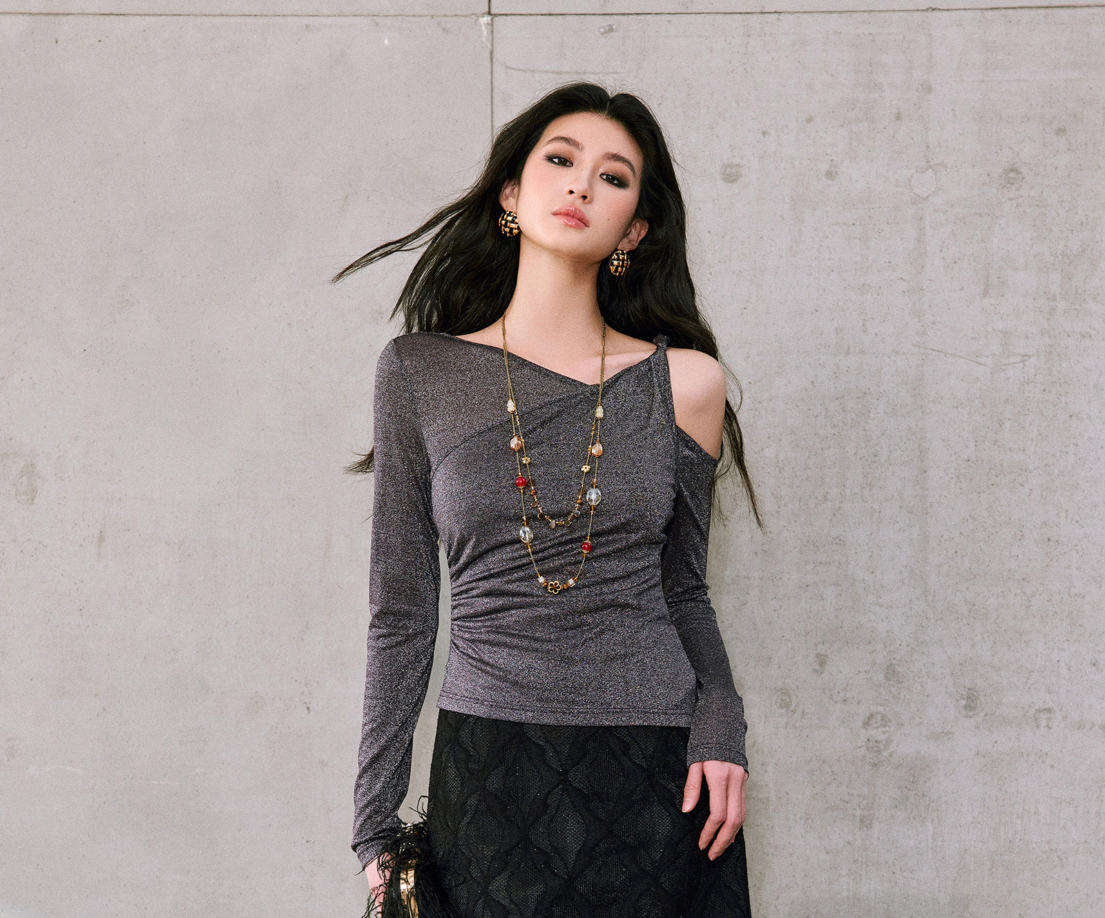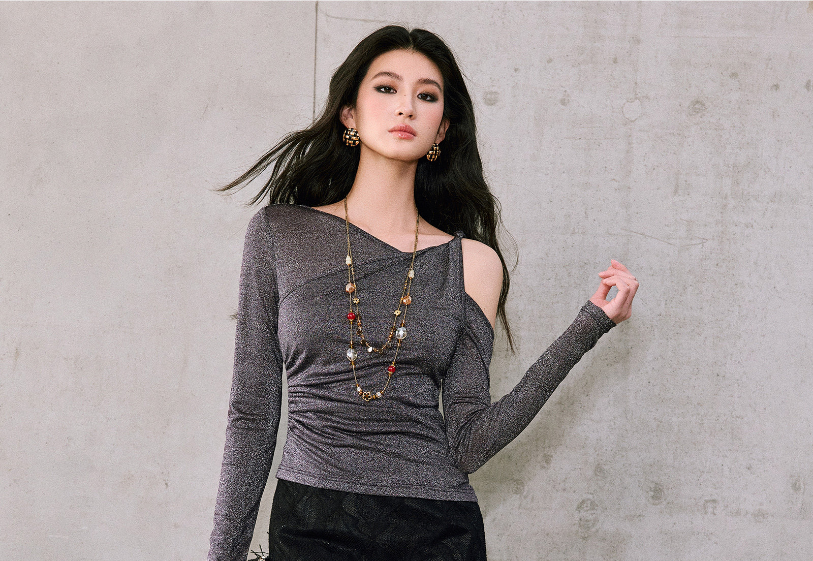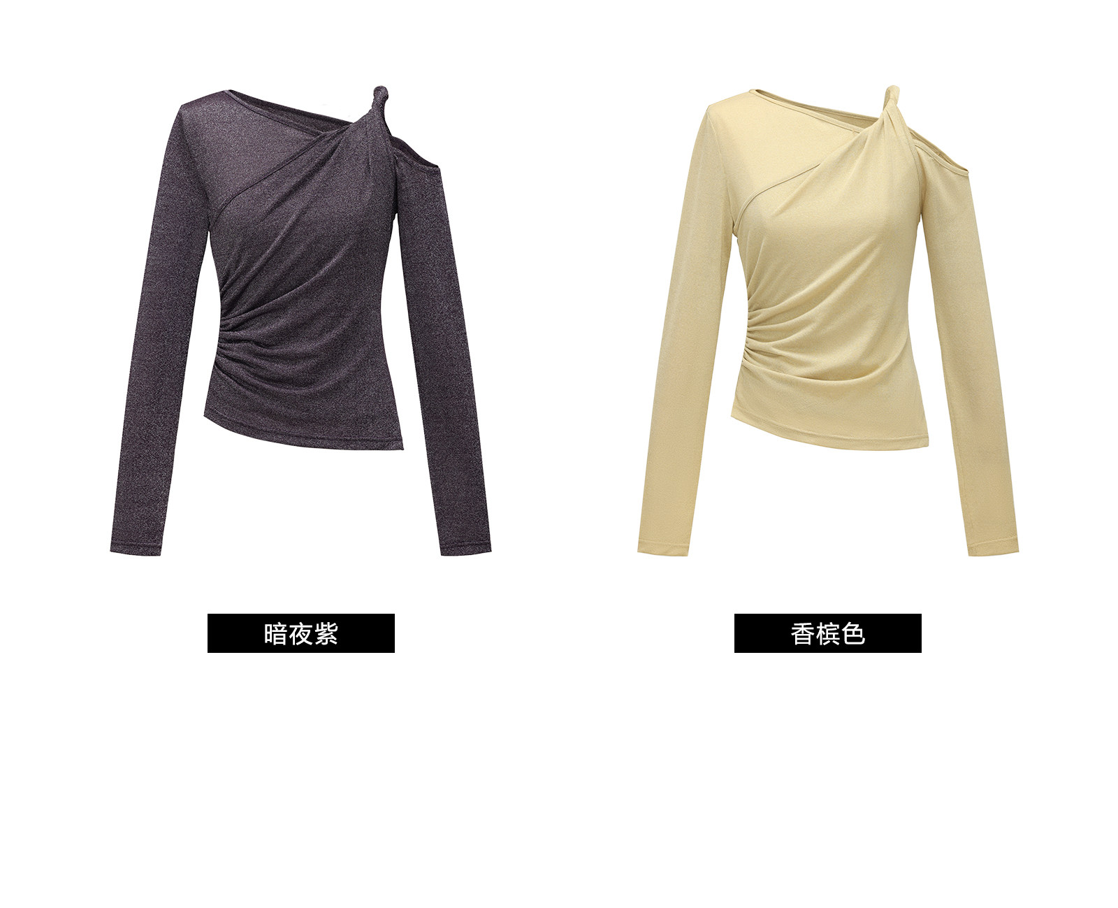 Wangxo[01/20 20:00Pm New Arrival 5% off]Fake Two-Piece Twisted Asymmetrical Shoulder Shiny Knit Top
