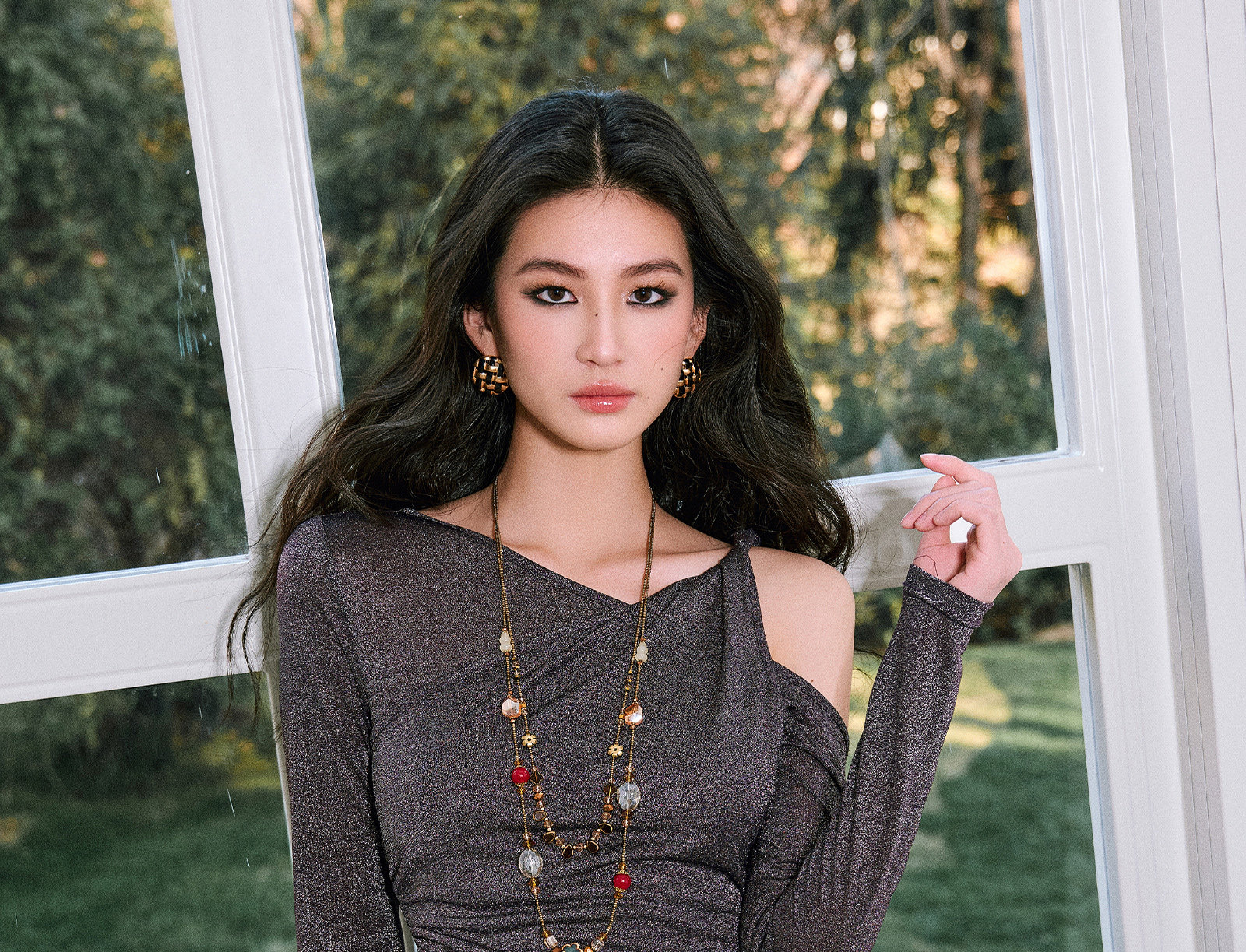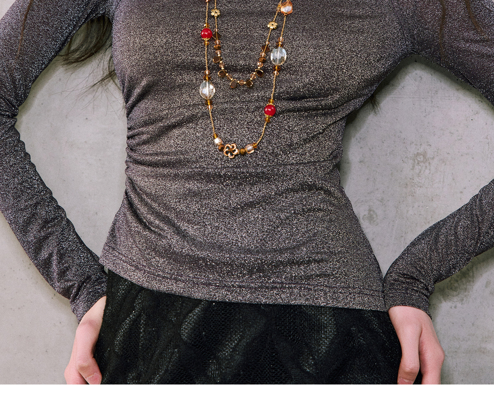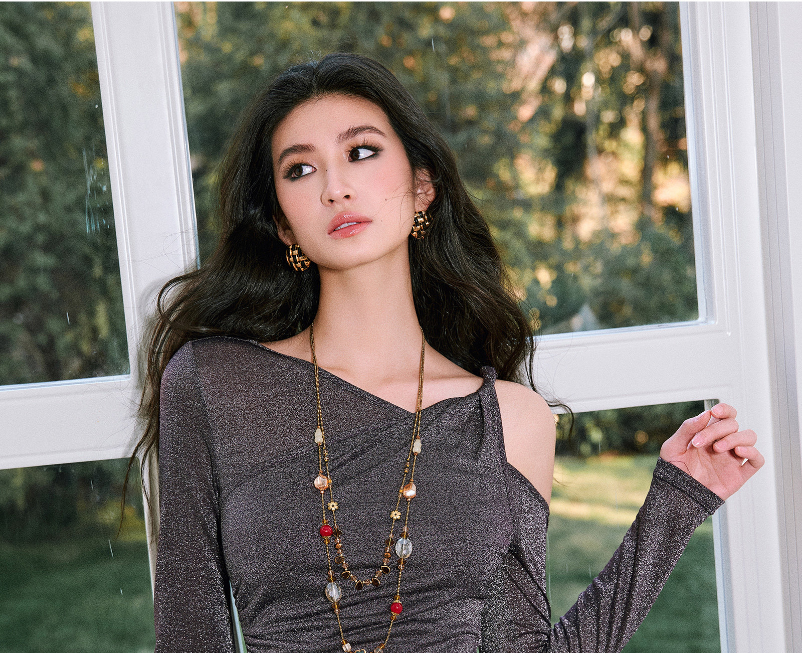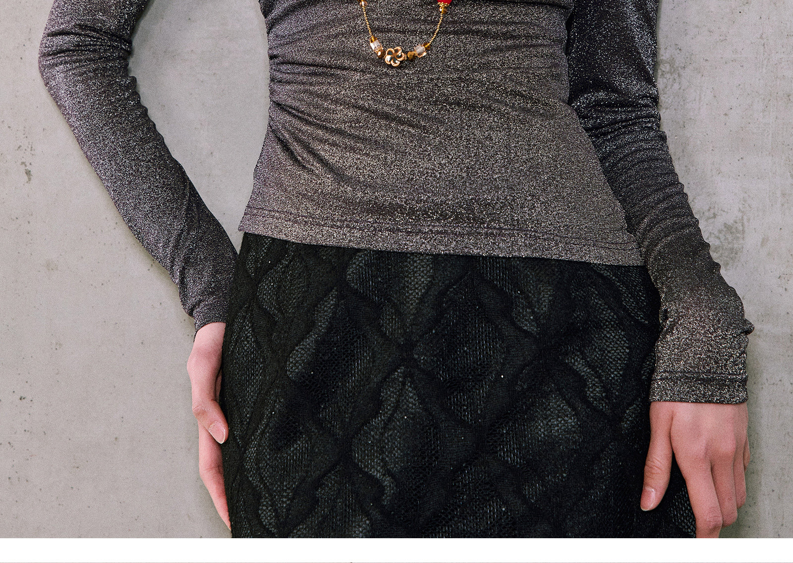 Wangxo[01/20 20:00Pm New Arrival 5% off]Fake Two-Piece Twisted Asymmetrical Shoulder Shiny Knit Top