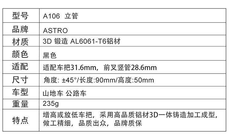 Astro自行车把立 山地公路车把立管铝合金锻造正负45度车把立增高