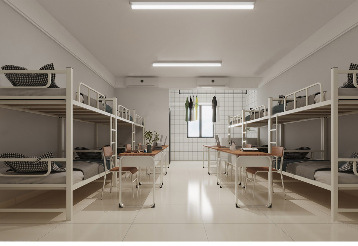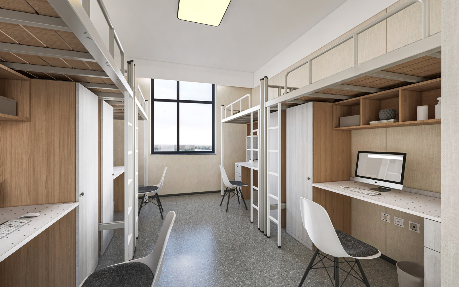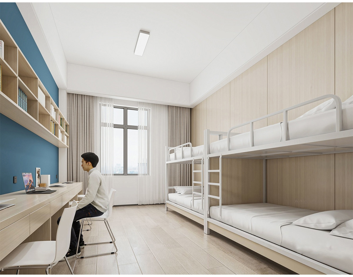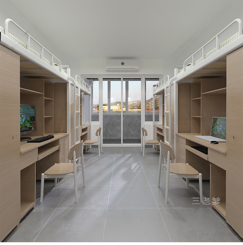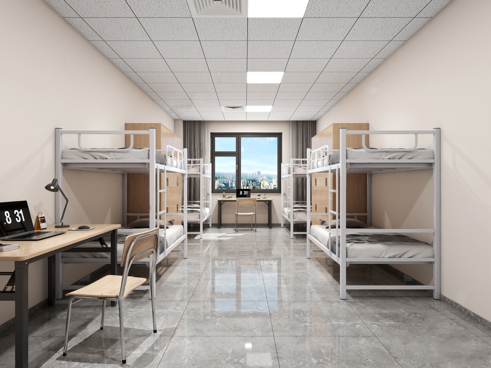 Escuela moderna, empresa, dormitorio para estudiantes universitarios, apartamento juvenil, dormitorio, modelo 3D, biblioteca, cama de hierro superior e inferior, material 3Dmax