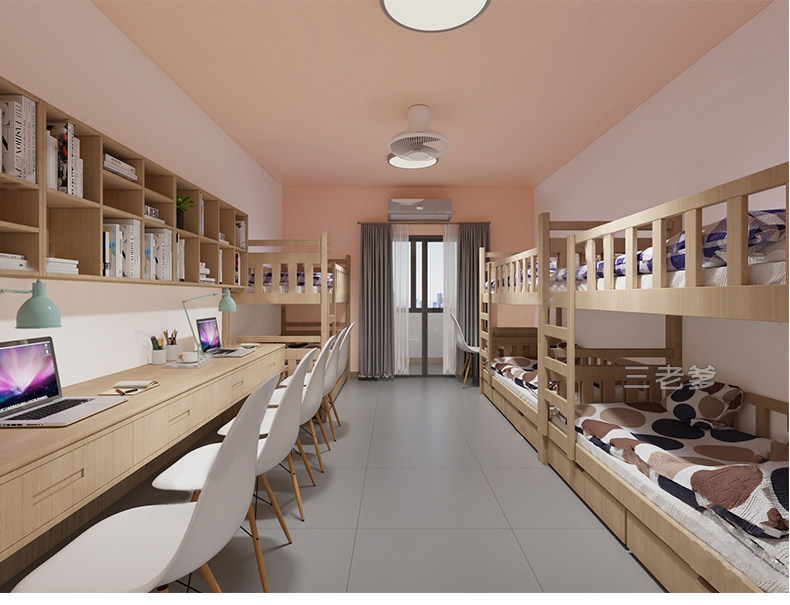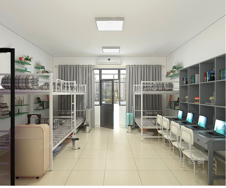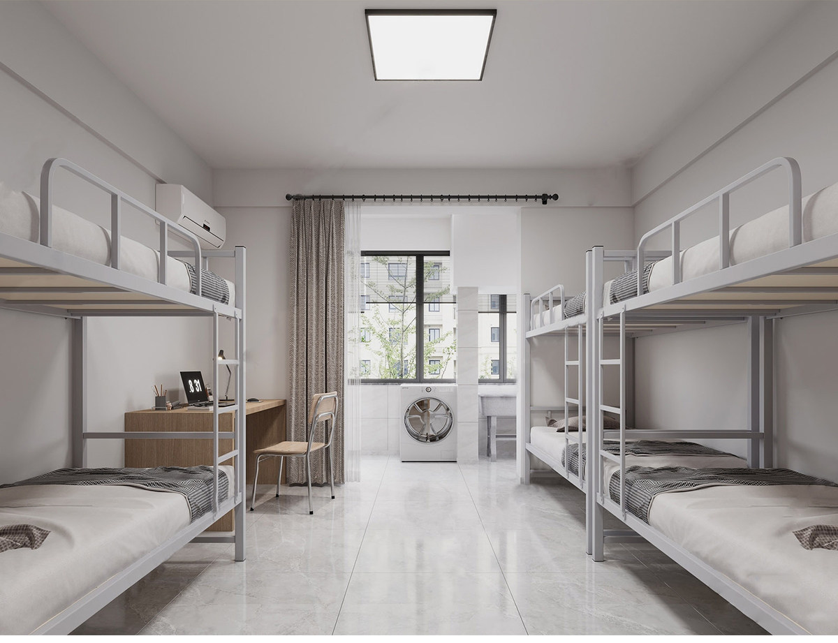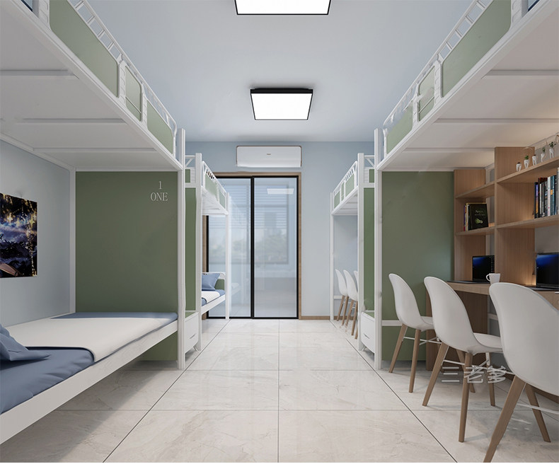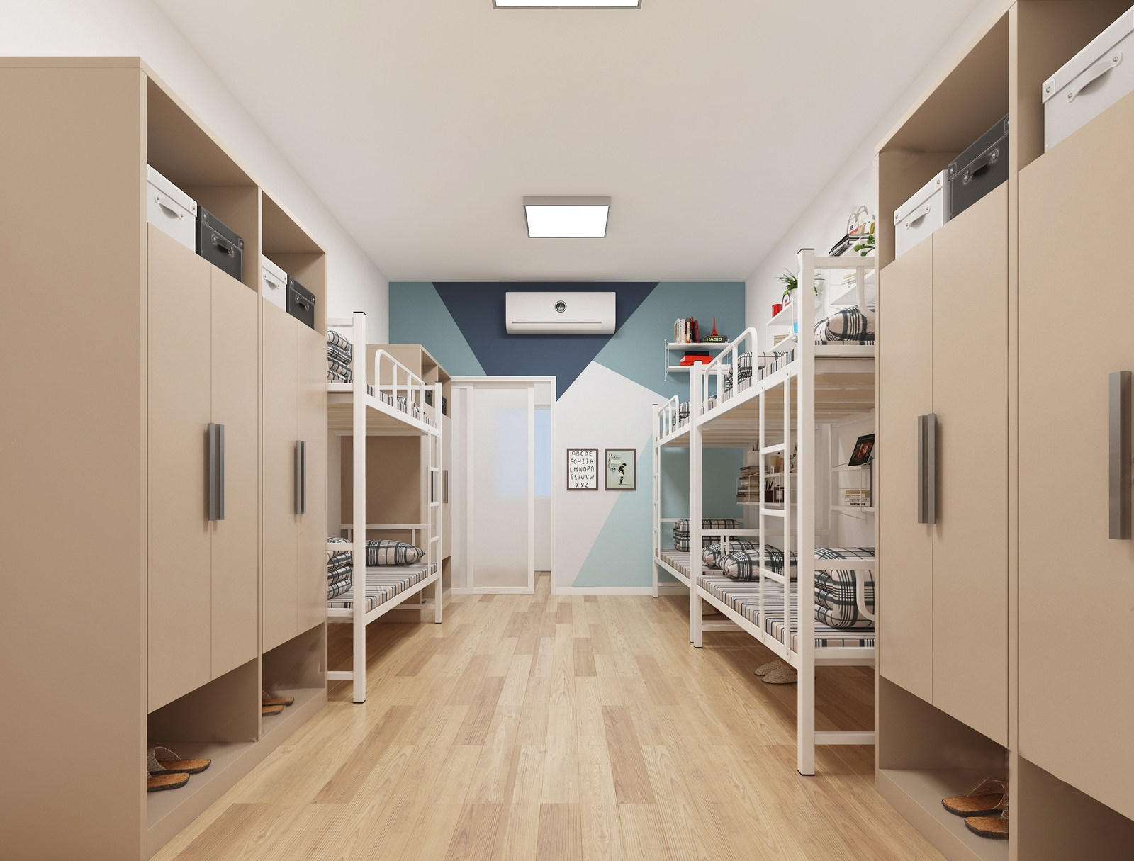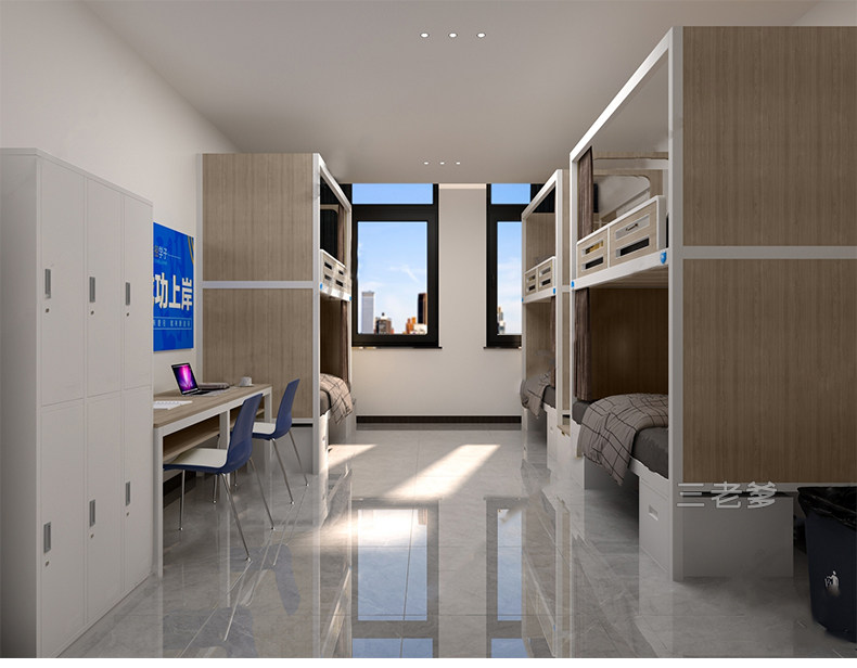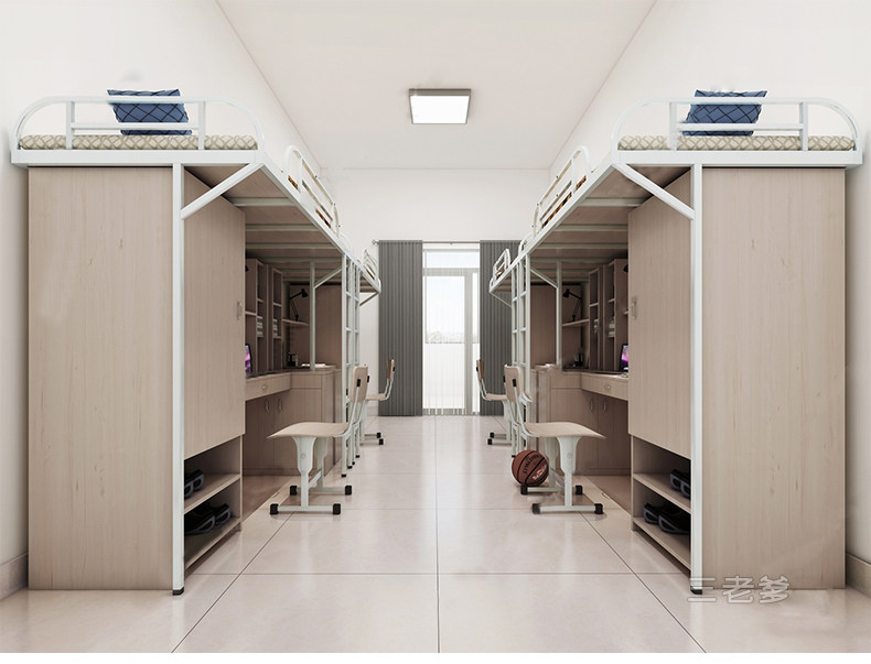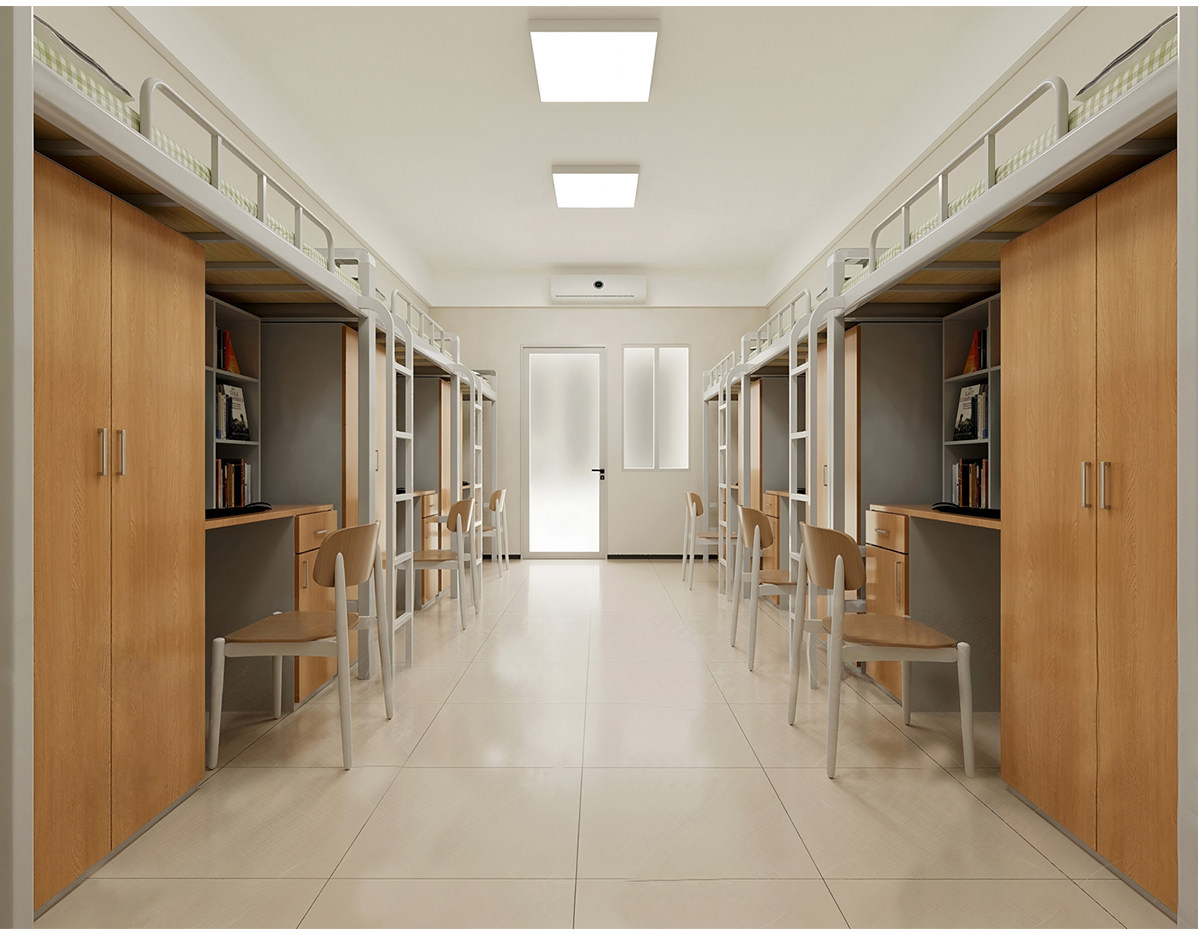 Escuela moderna, empresa, dormitorio para estudiantes universitarios, apartamento juvenil, dormitorio, modelo 3D, biblioteca, cama de hierro superior e inferior, material 3Dmax