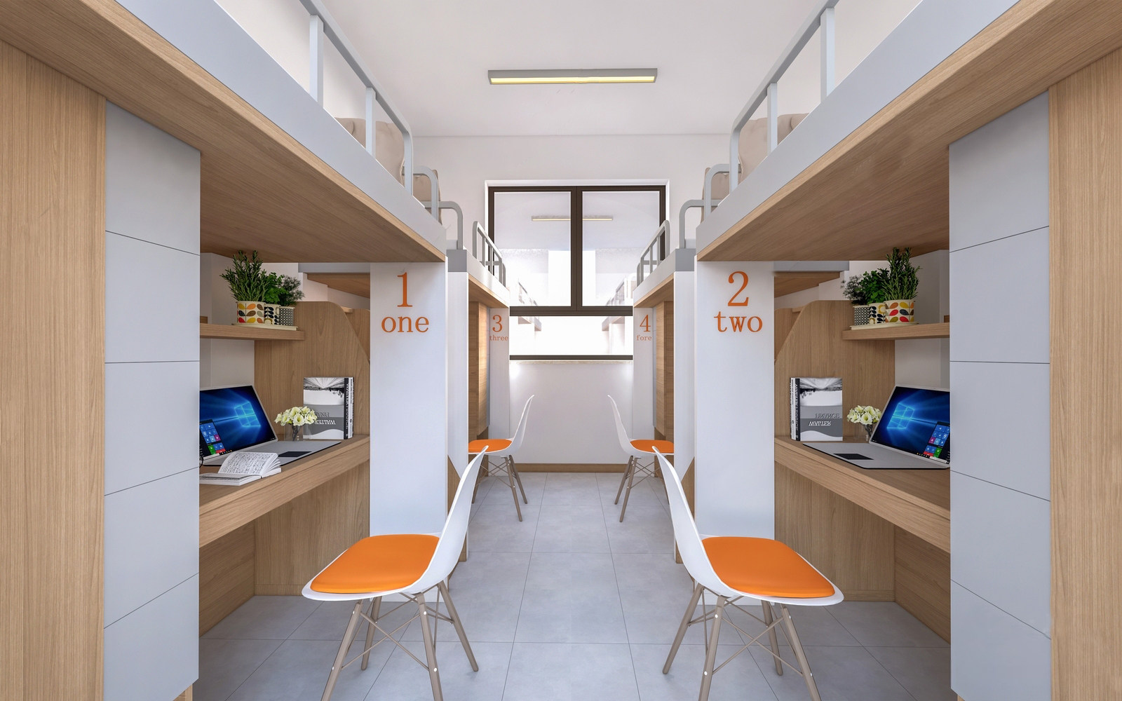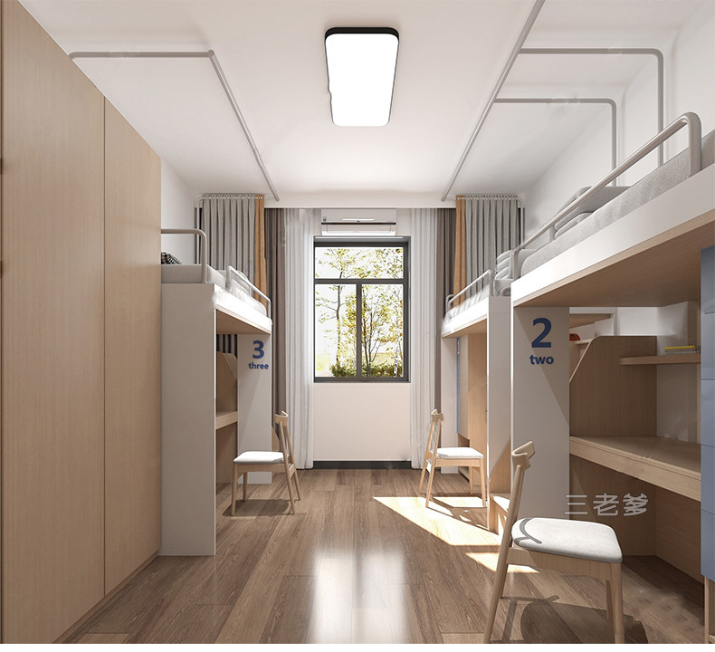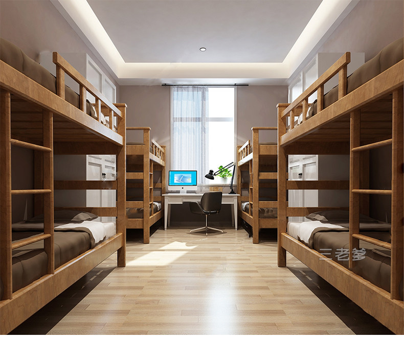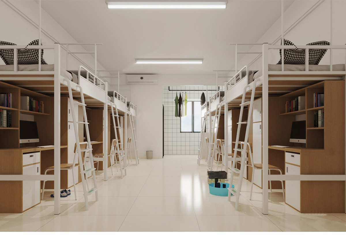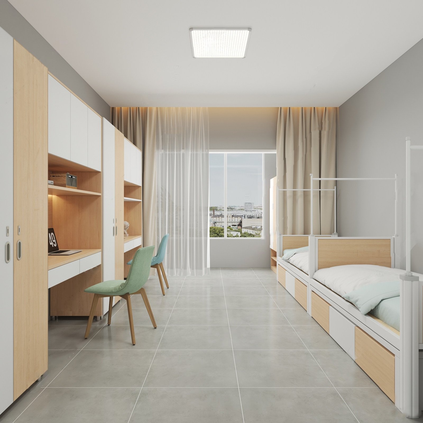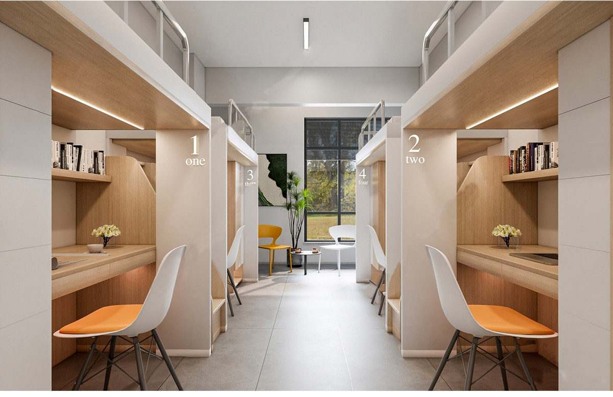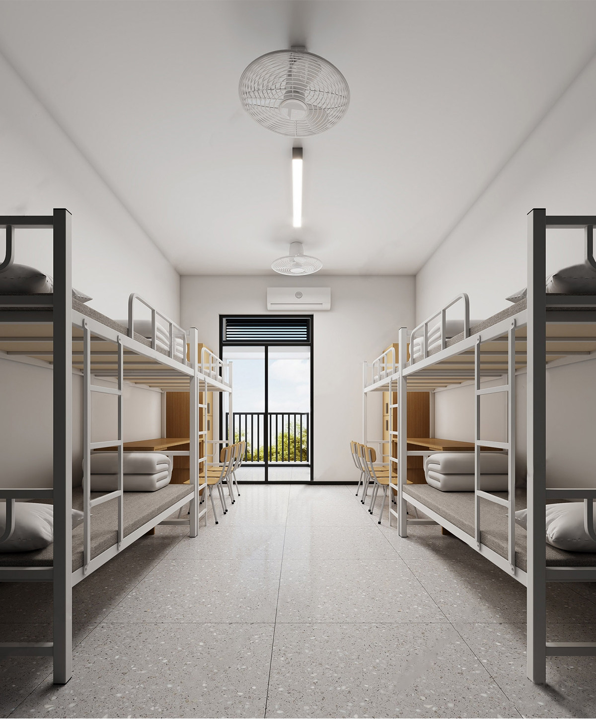 Escuela moderna, empresa, dormitorio para estudiantes universitarios, apartamento juvenil, dormitorio, modelo 3D, biblioteca, cama de hierro superior e inferior, material 3Dmax