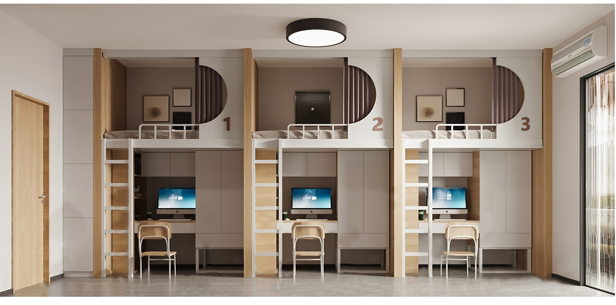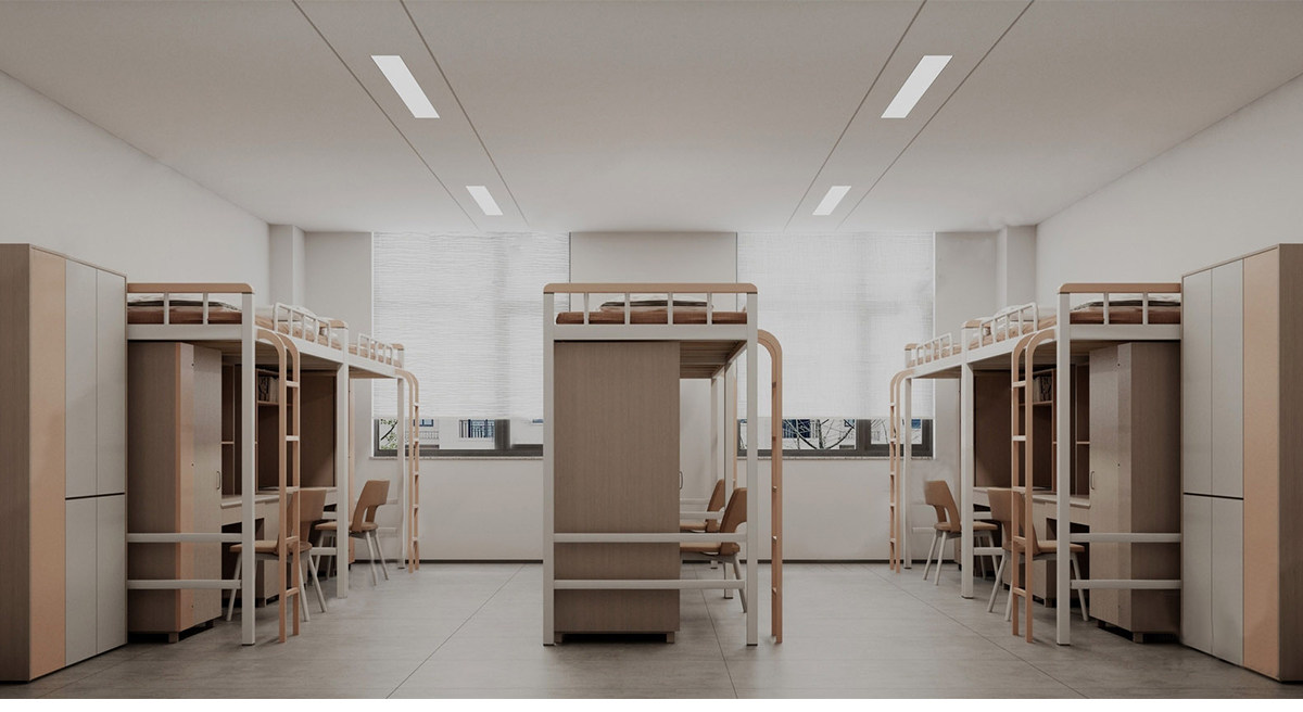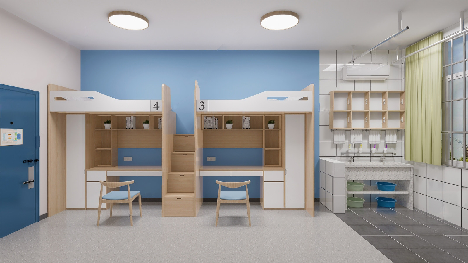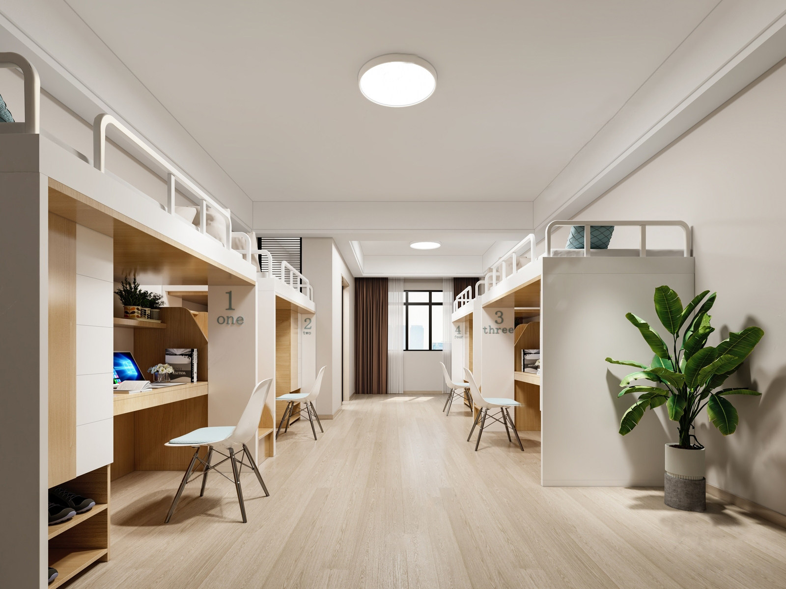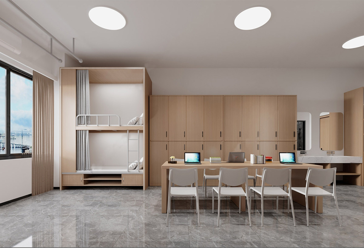 Escuela moderna, empresa, dormitorio para estudiantes universitarios, apartamento juvenil, dormitorio, modelo 3D, biblioteca, cama de hierro superior e inferior, material 3Dmax