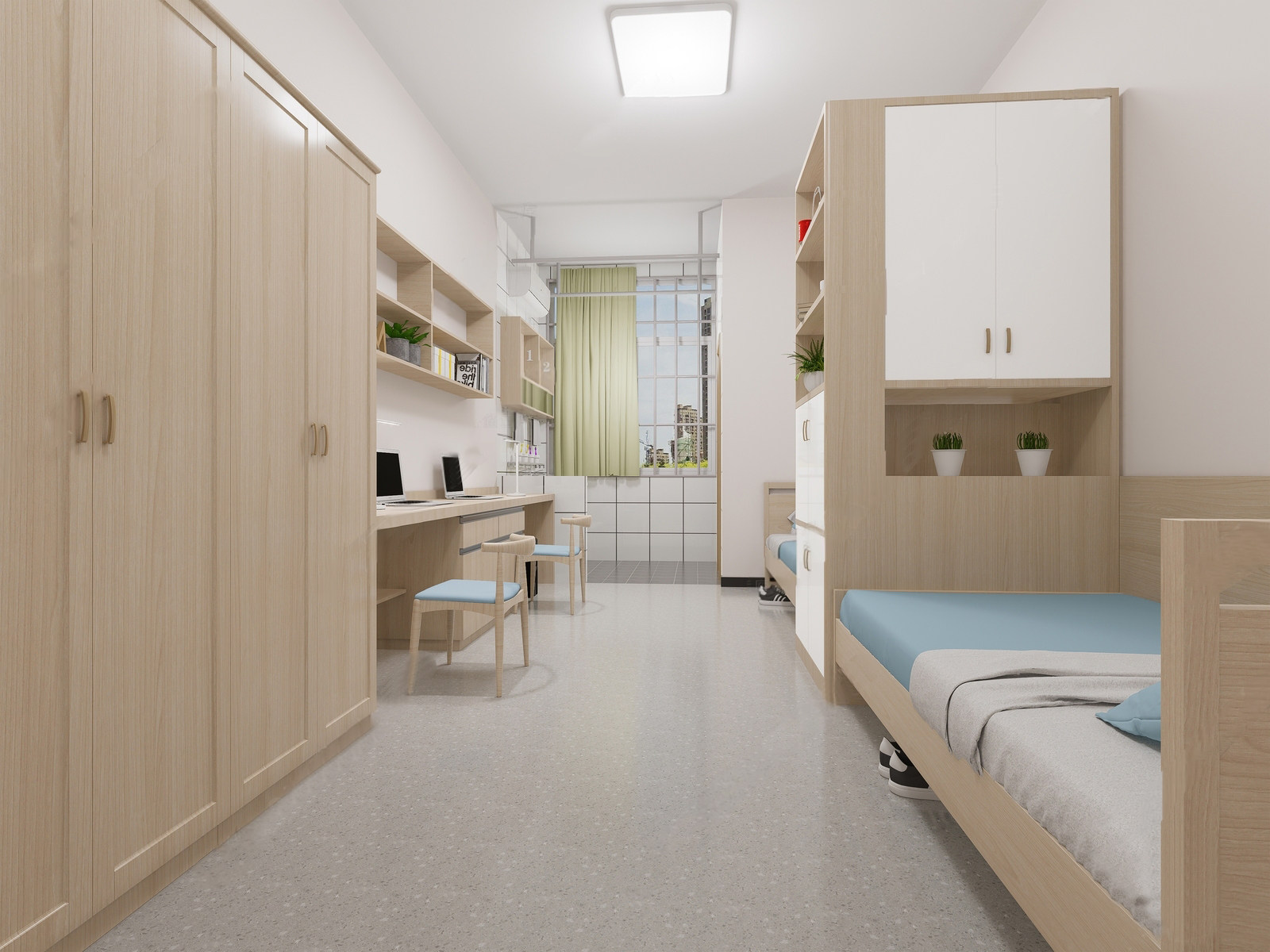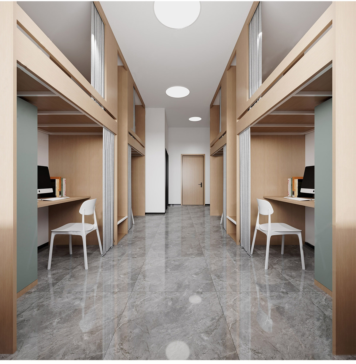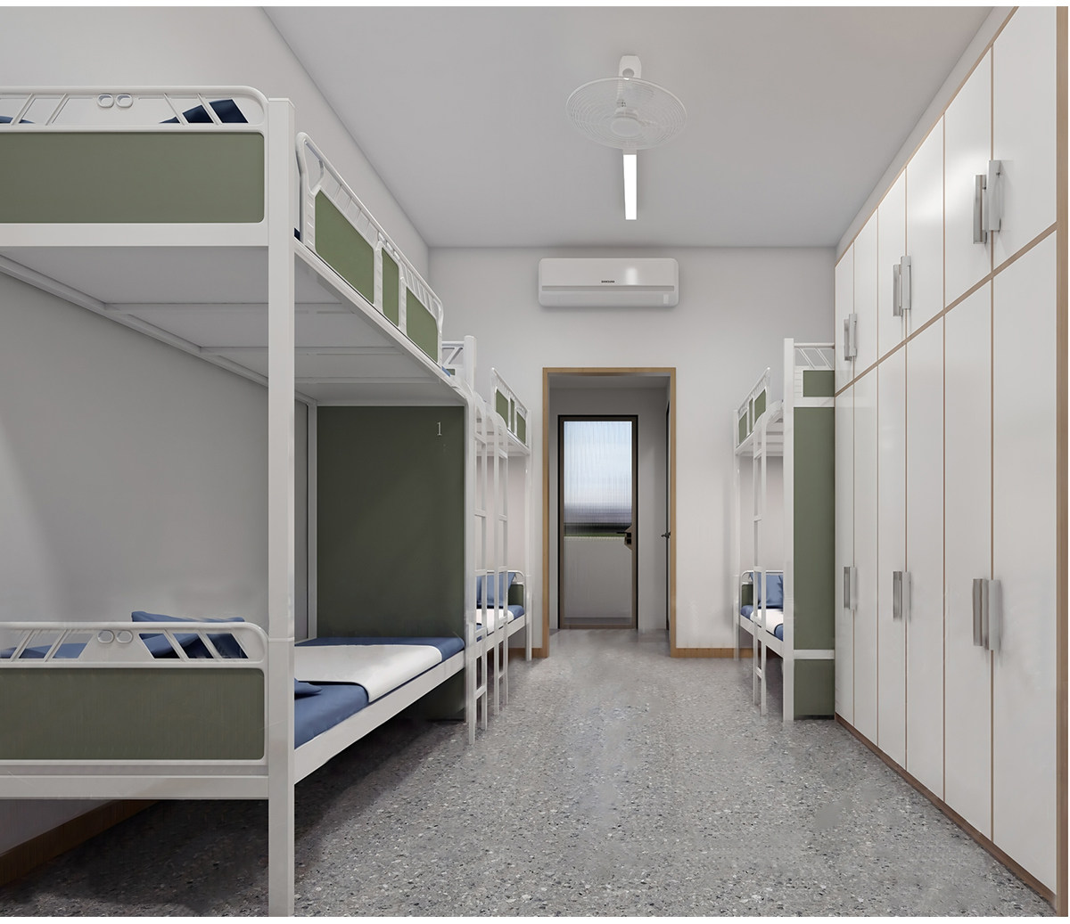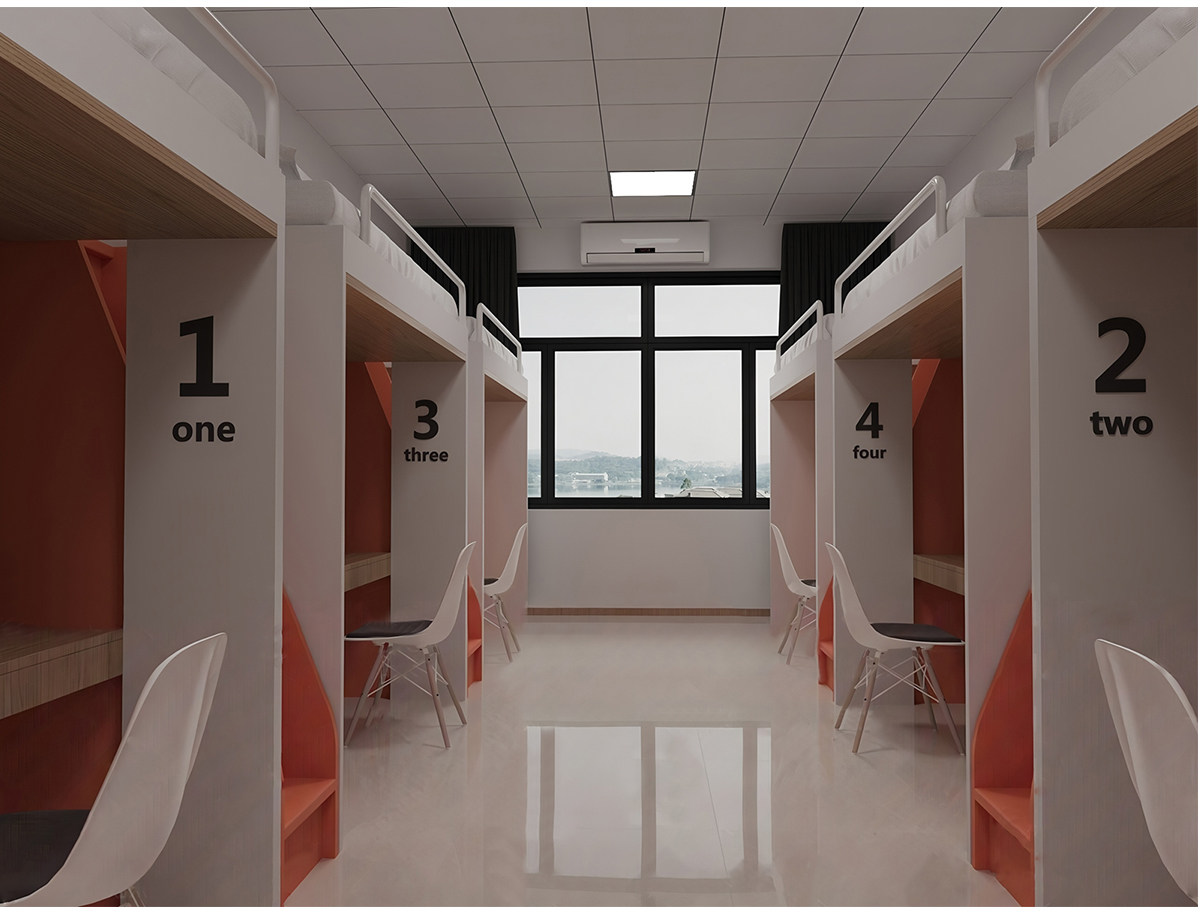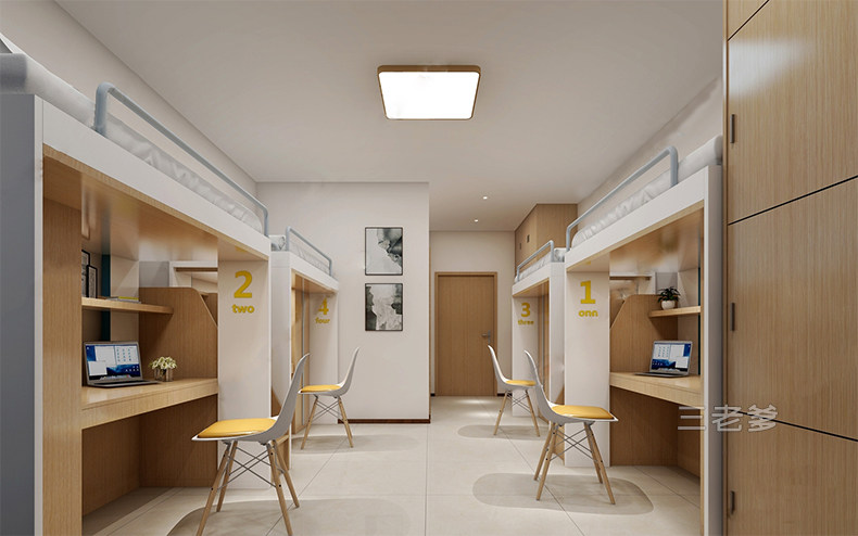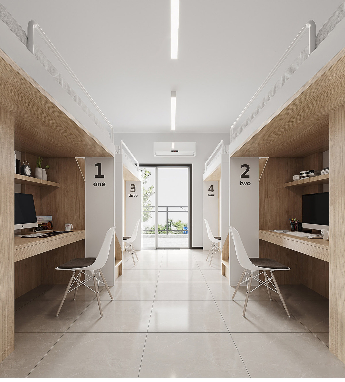 Escuela moderna, empresa, dormitorio para estudiantes universitarios, apartamento juvenil, dormitorio, modelo 3D, biblioteca, cama de hierro superior e inferior, material 3Dmax