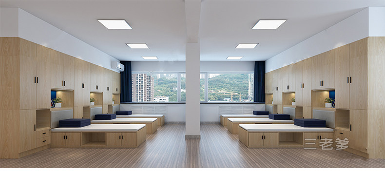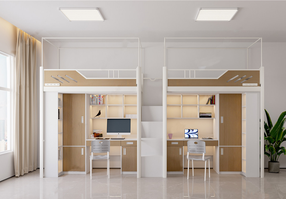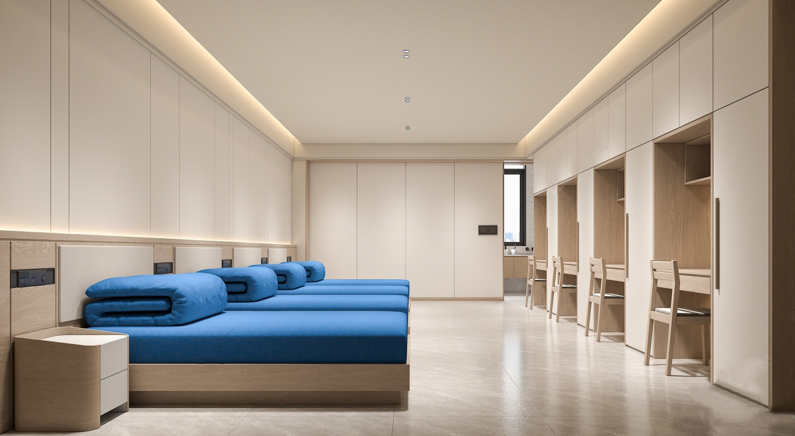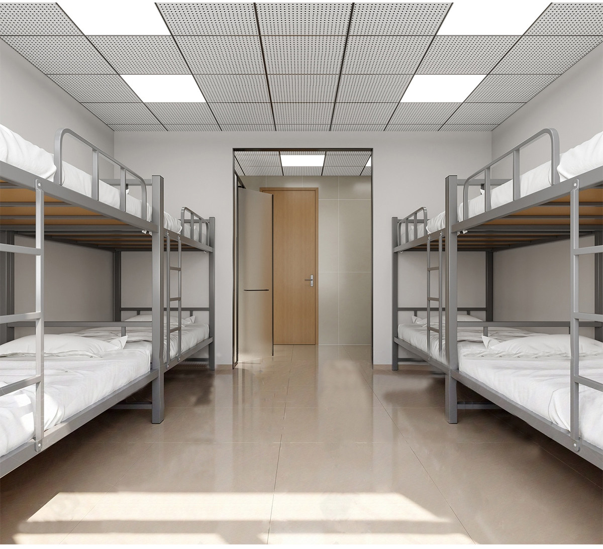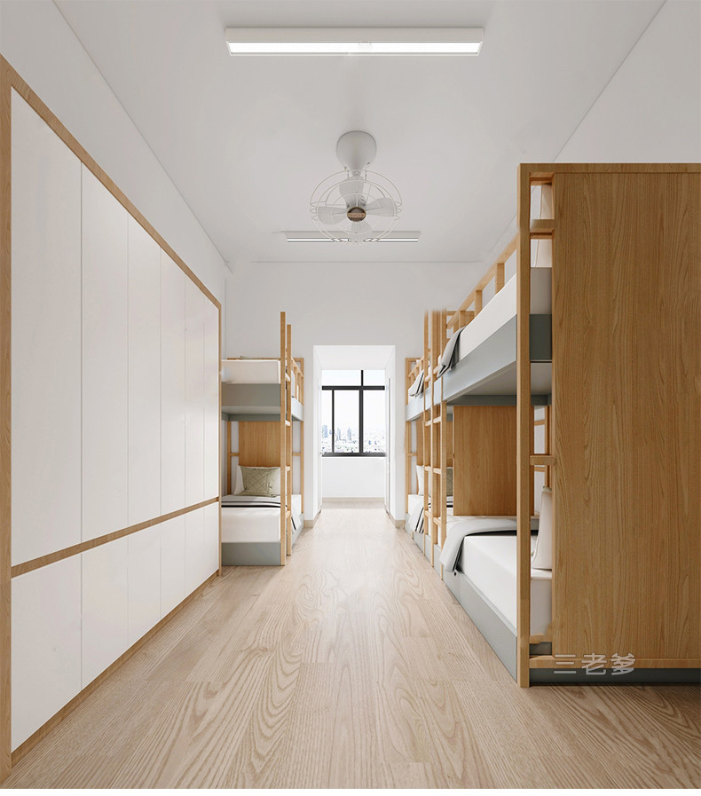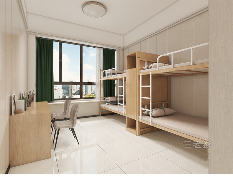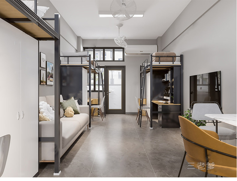 Escuela moderna, empresa, dormitorio para estudiantes universitarios, apartamento juvenil, dormitorio, modelo 3D, biblioteca, cama de hierro superior e inferior, material 3Dmax