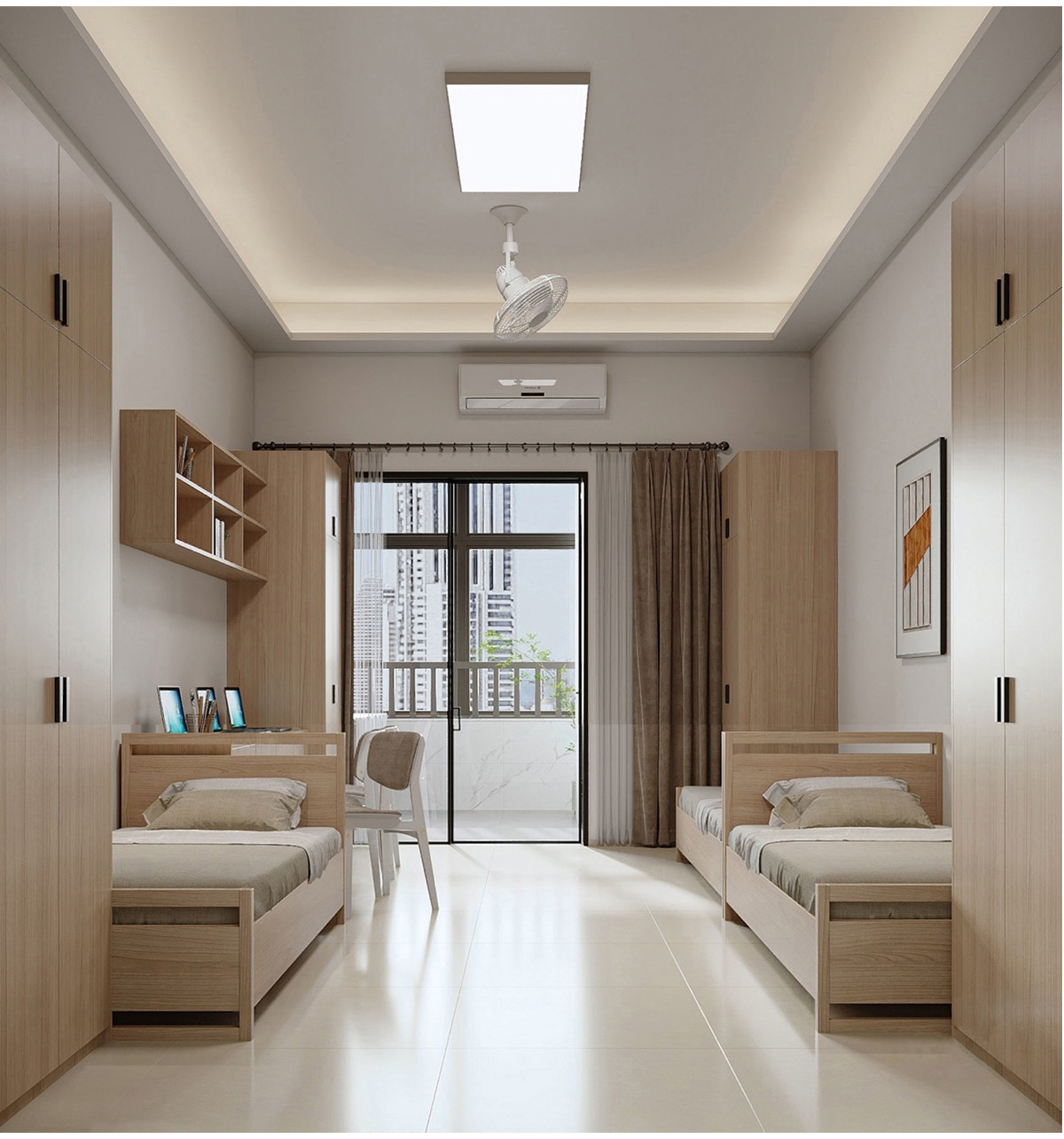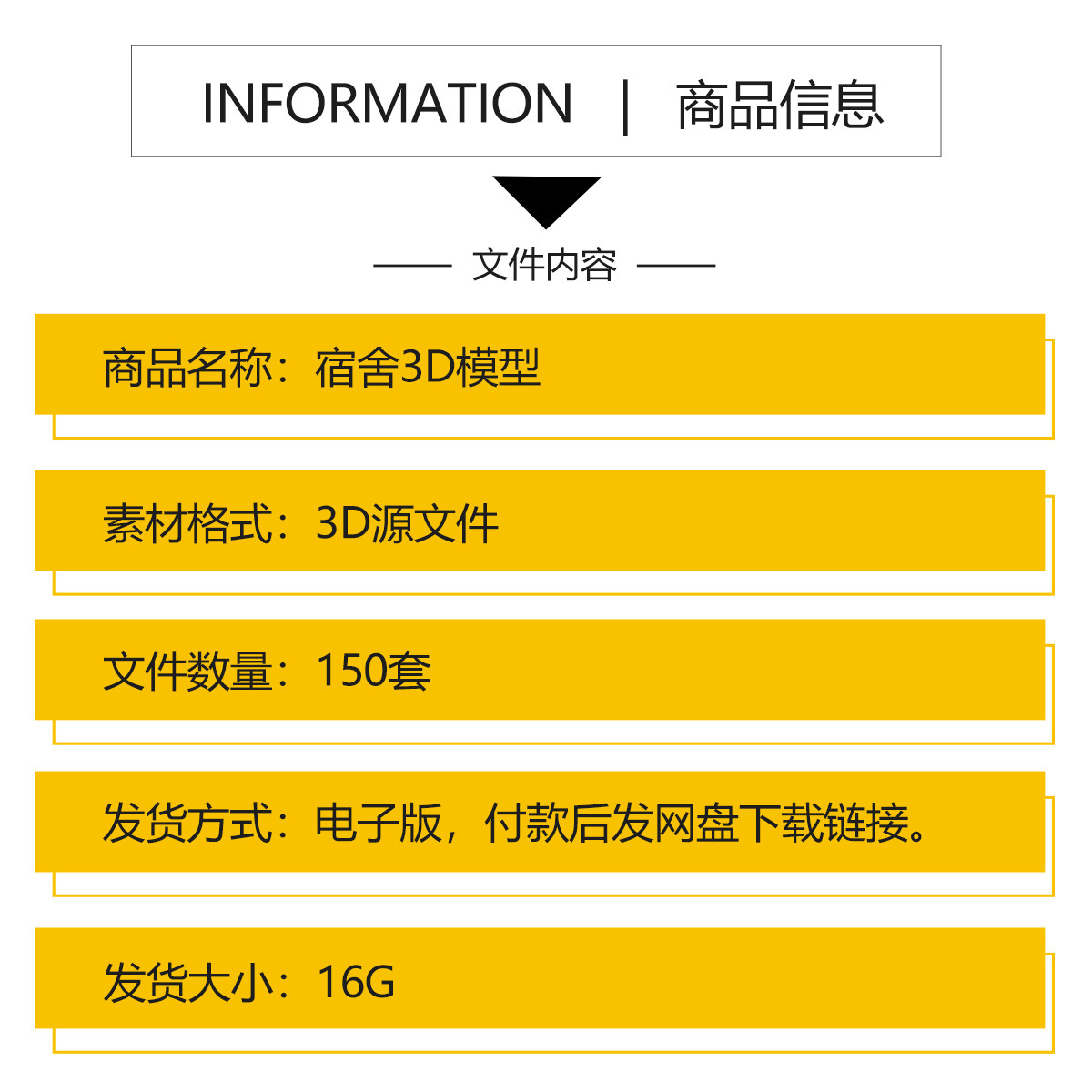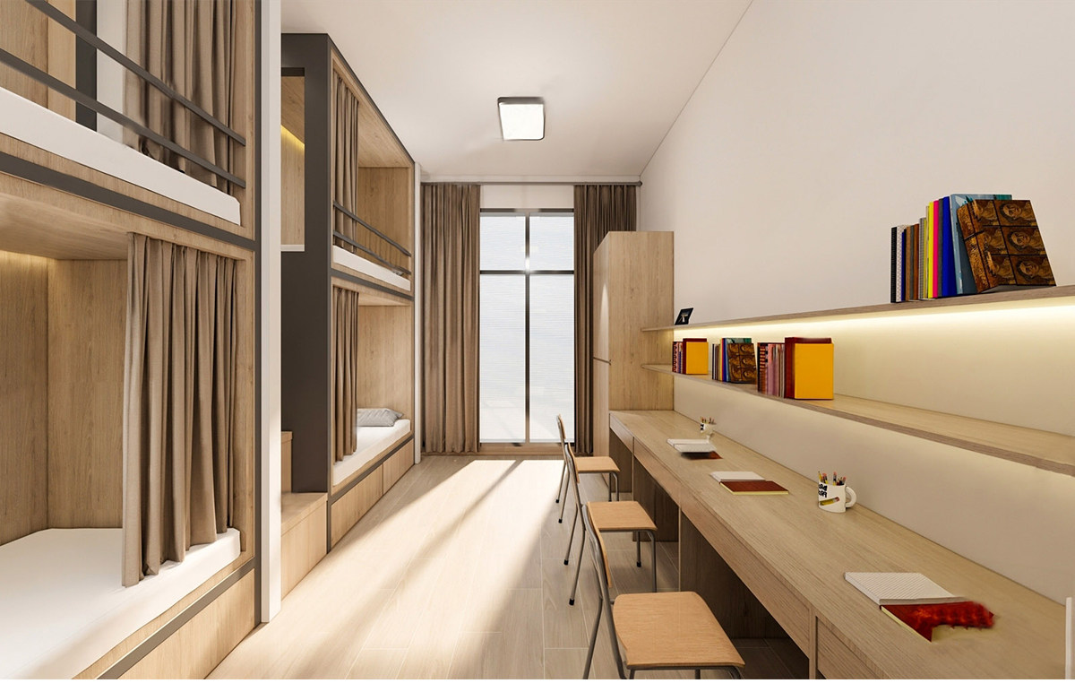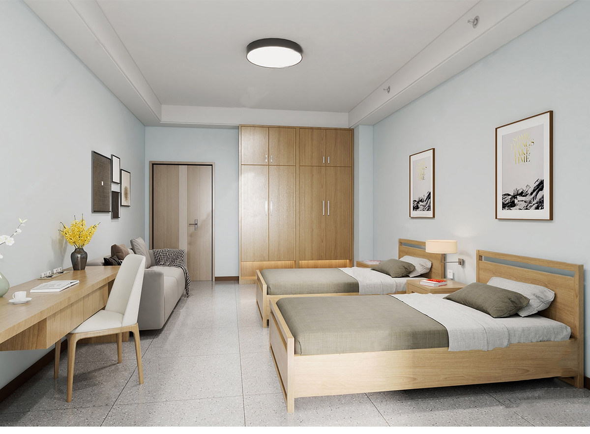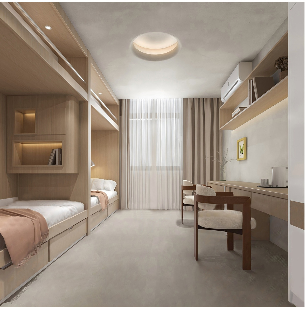 Escuela moderna, empresa, dormitorio para estudiantes universitarios, apartamento juvenil, dormitorio, modelo 3D, biblioteca, cama de hierro superior e inferior, material 3Dmax