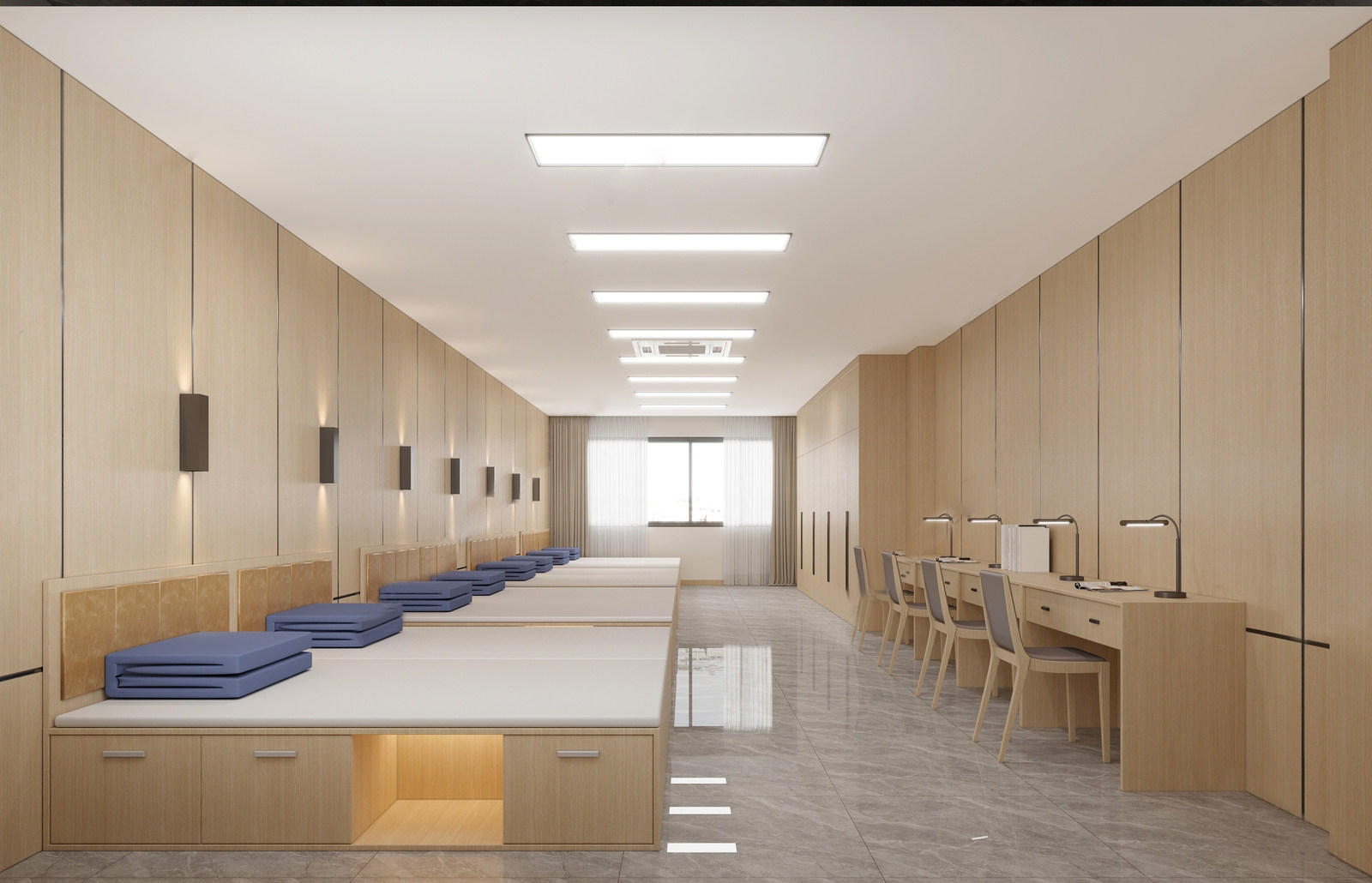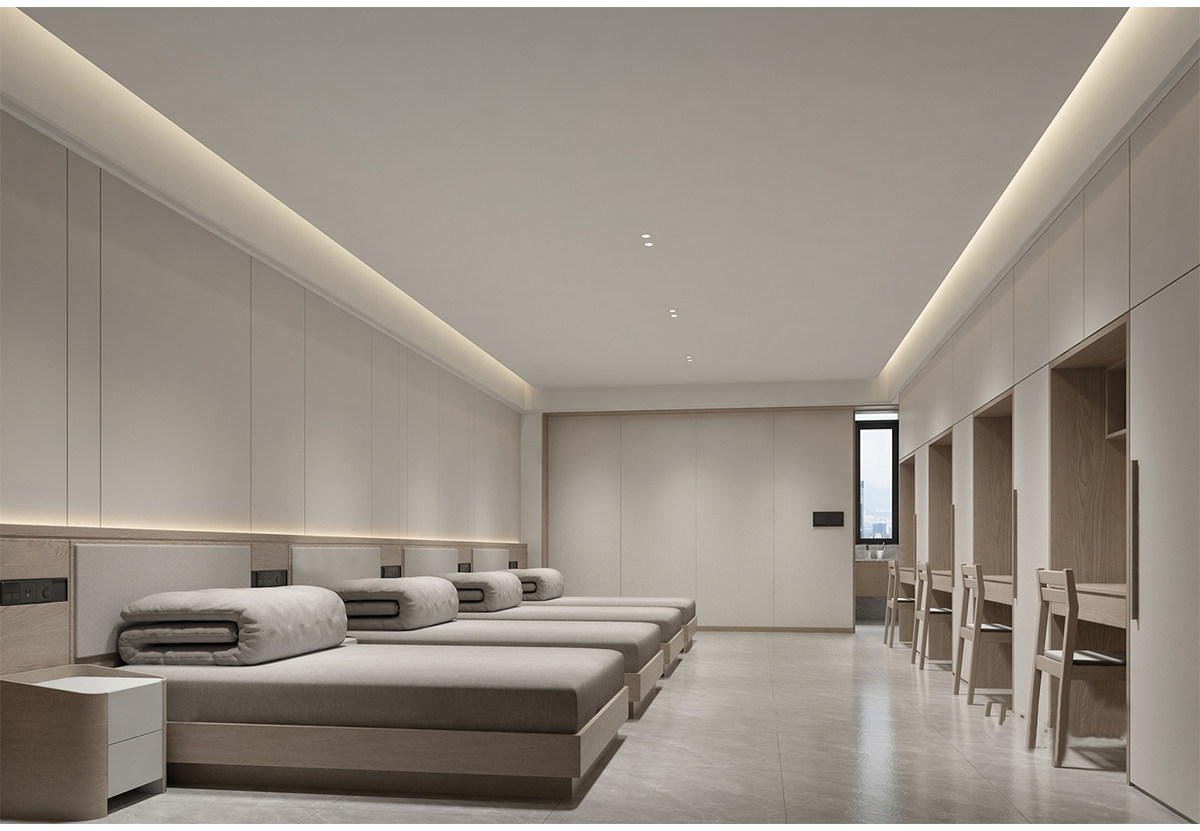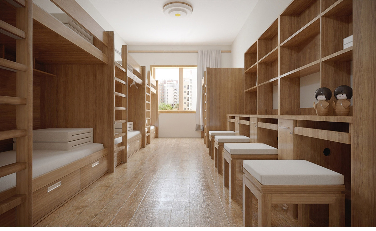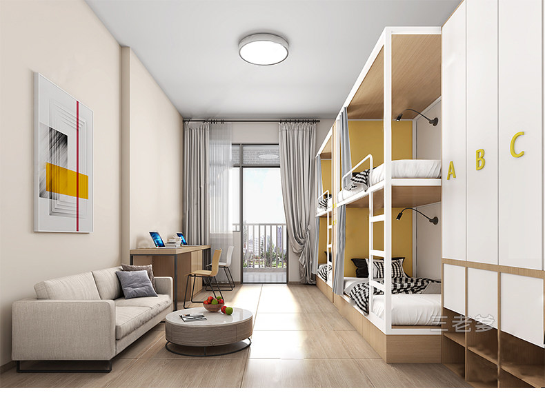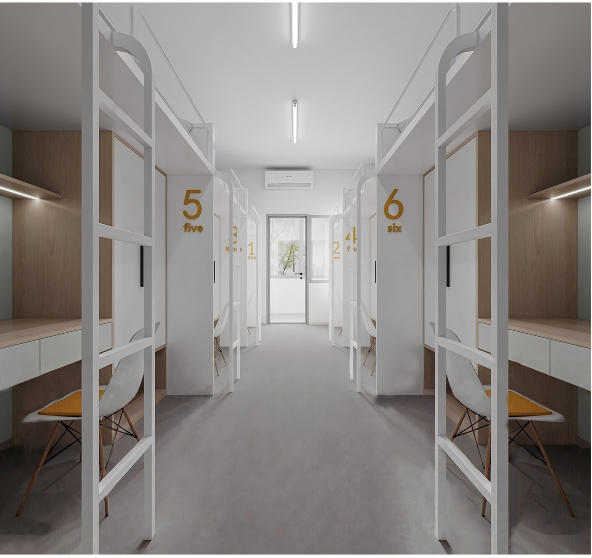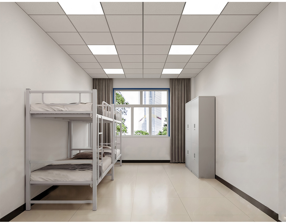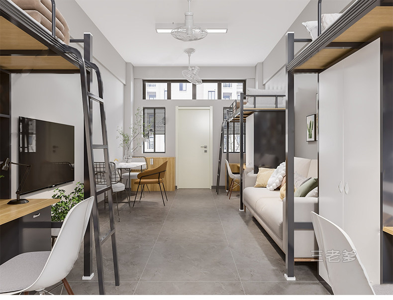 Escuela moderna, empresa, dormitorio para estudiantes universitarios, apartamento juvenil, dormitorio, modelo 3D, biblioteca, cama de hierro superior e inferior, material 3Dmax