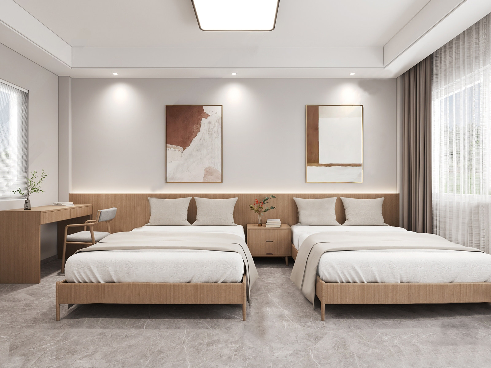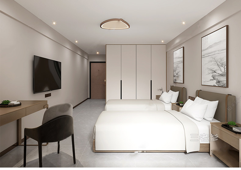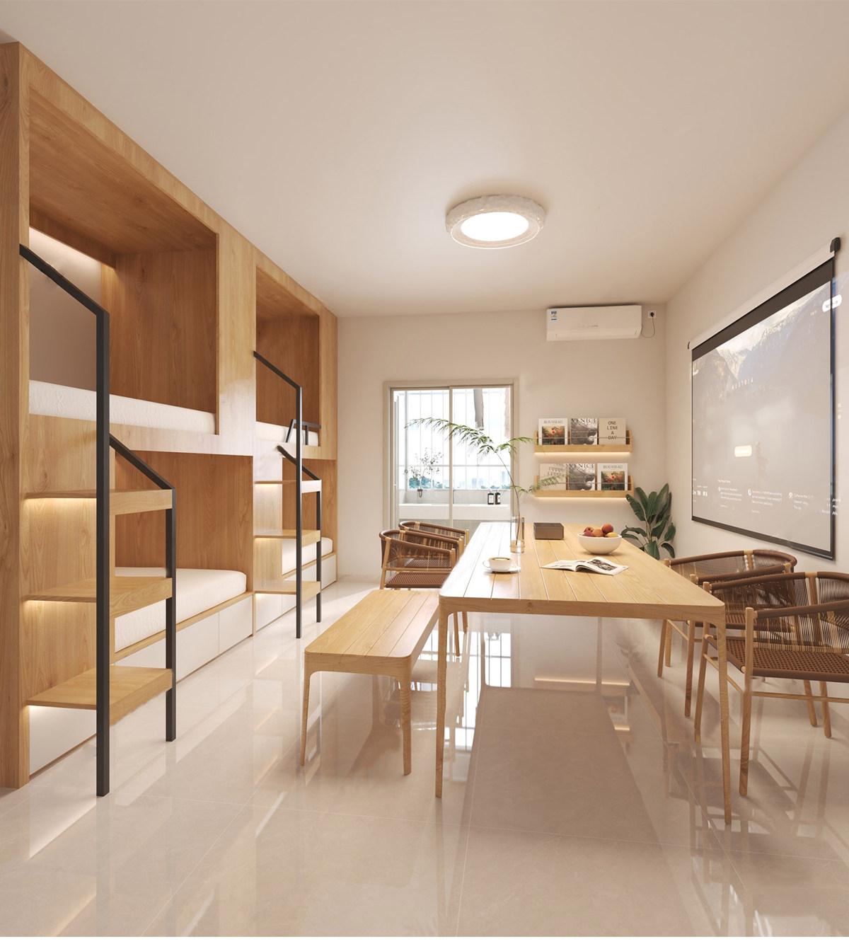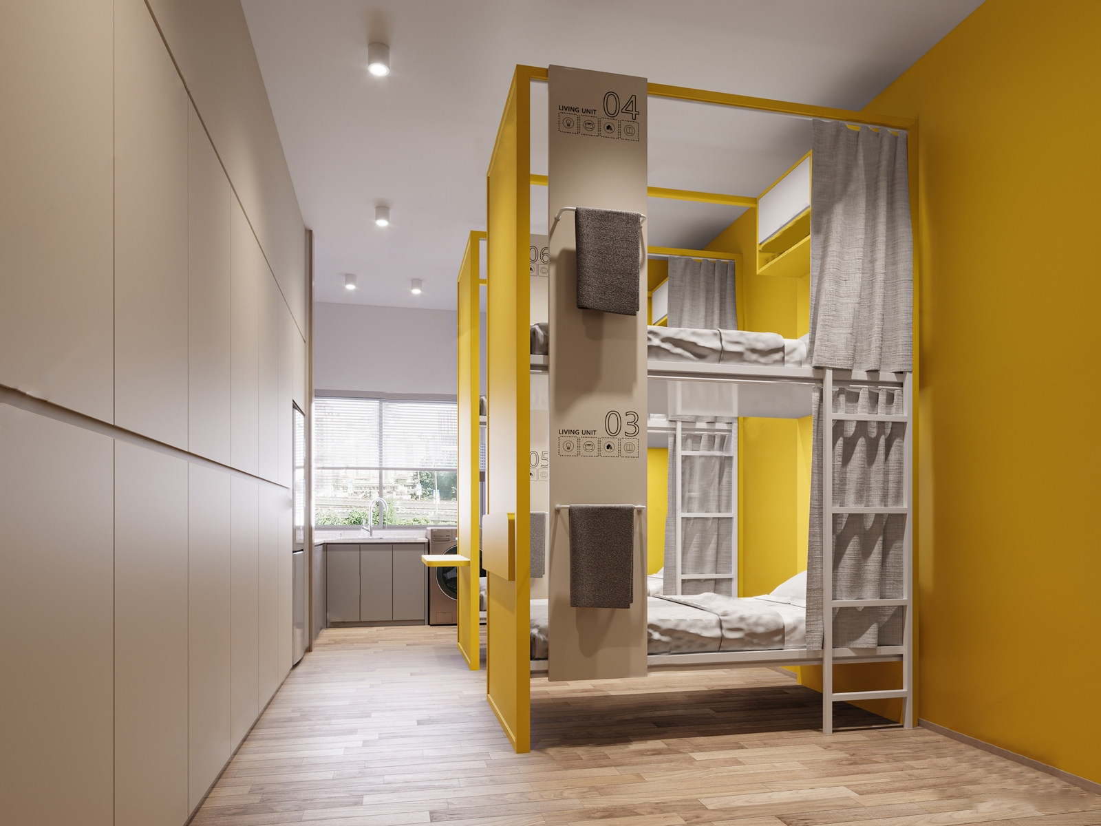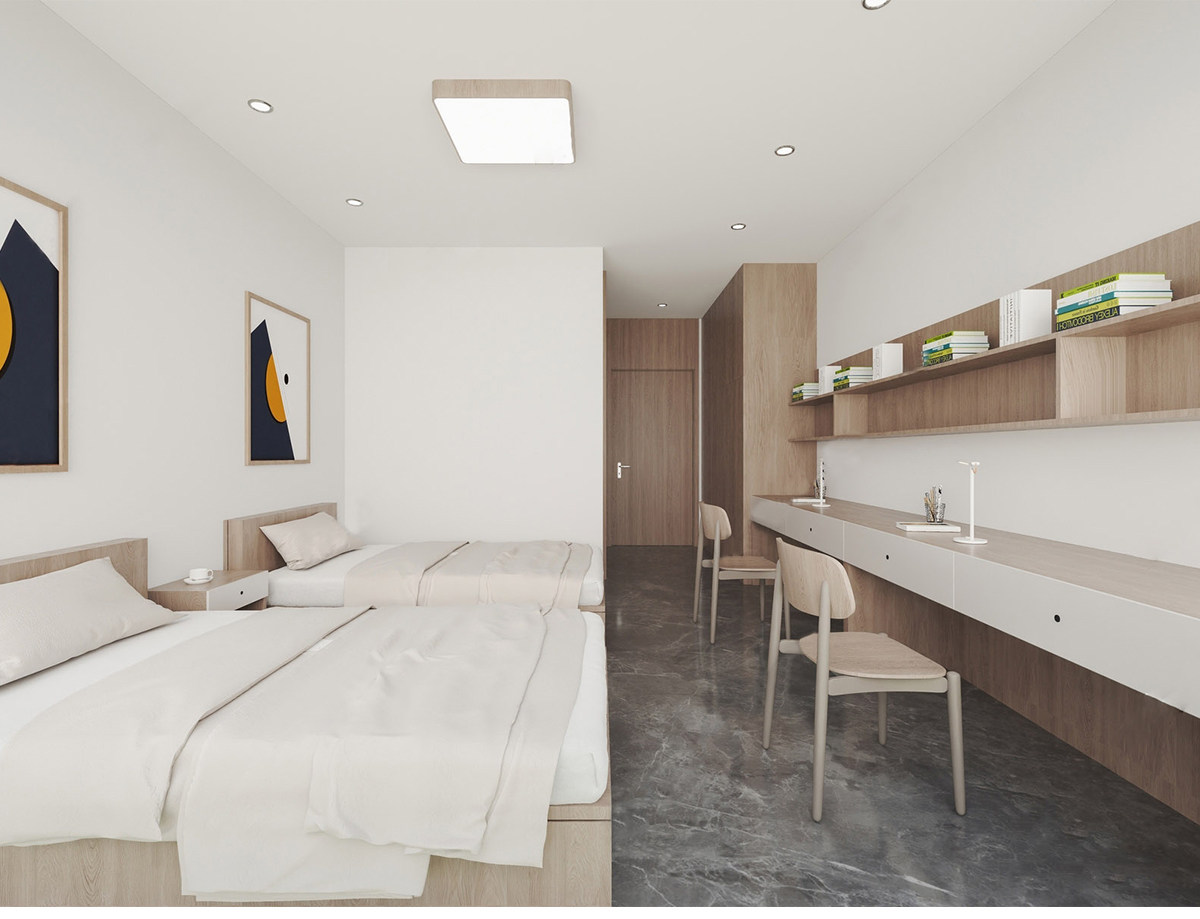 Escuela moderna, empresa, dormitorio para estudiantes universitarios, apartamento juvenil, dormitorio, modelo 3D, biblioteca, cama de hierro superior e inferior, material 3Dmax