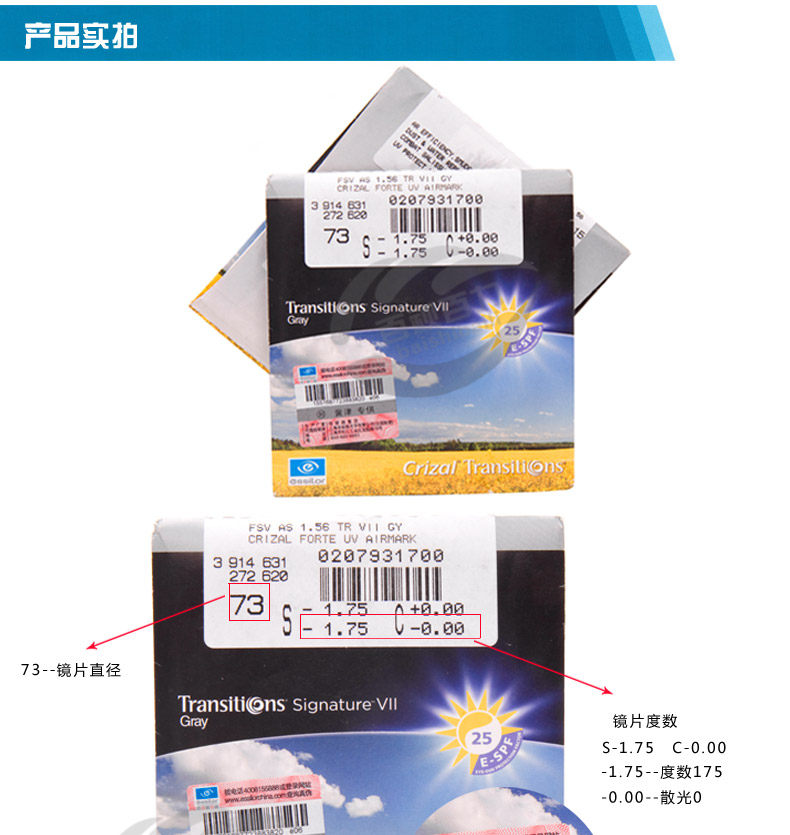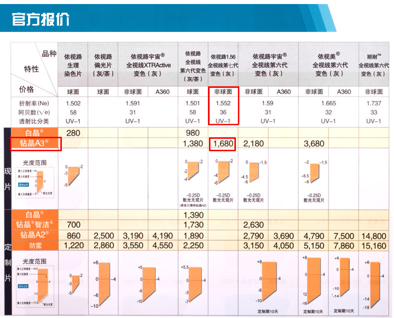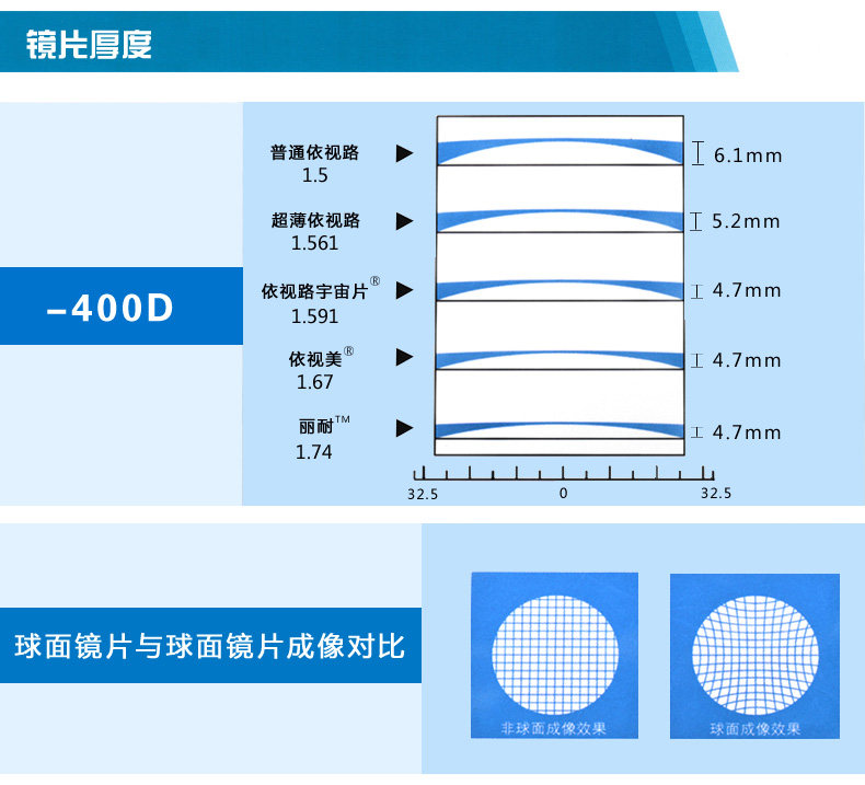 镜片折射率 1.56(较薄),1.61(薄),1.67(超薄)