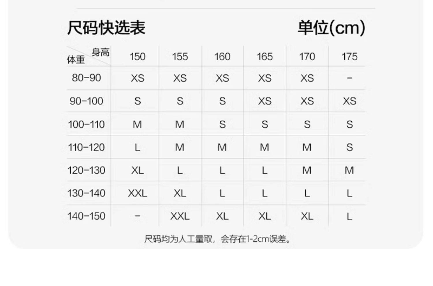 China (cm) 160-165/84-86 165-170 / 88-90 167-172 / 92-96 168-173 / 98-102 170-176 / 106-110