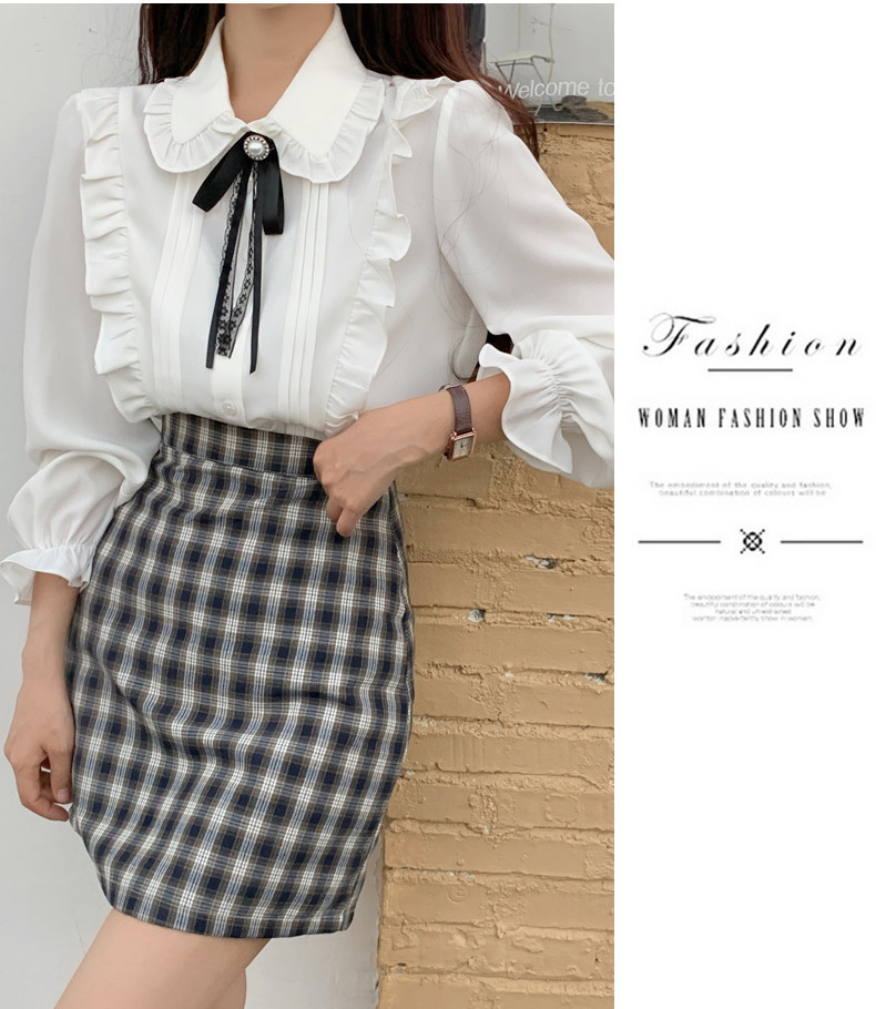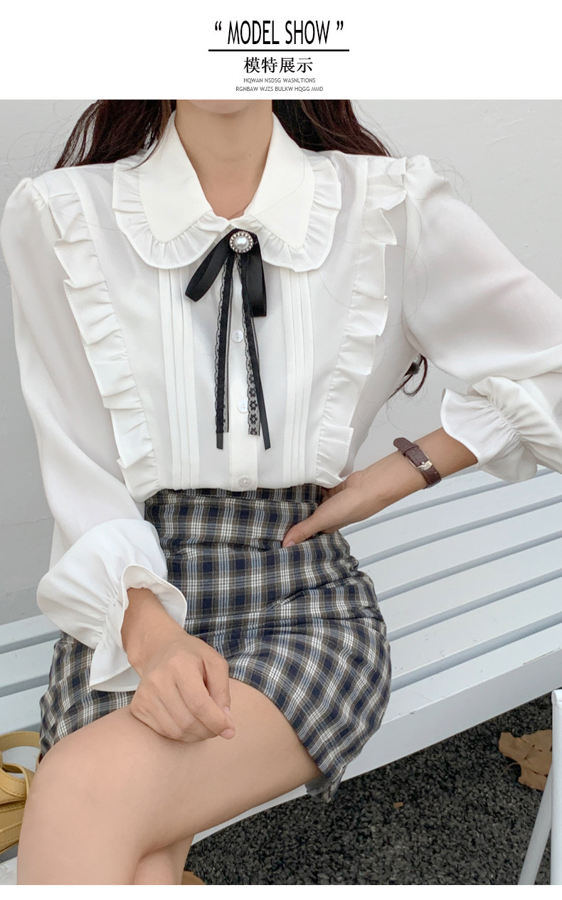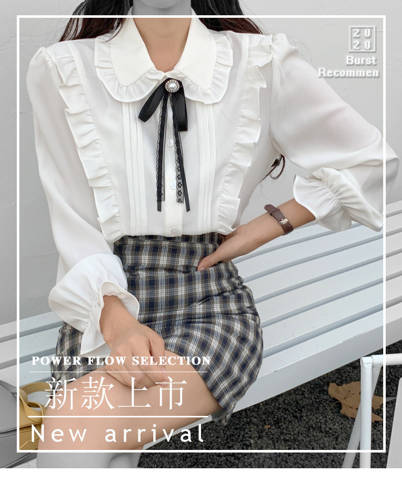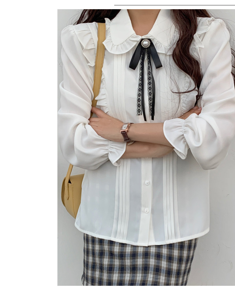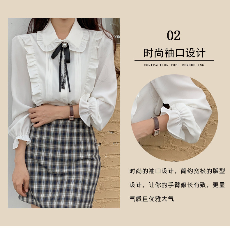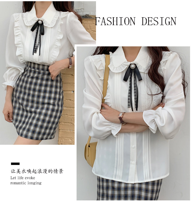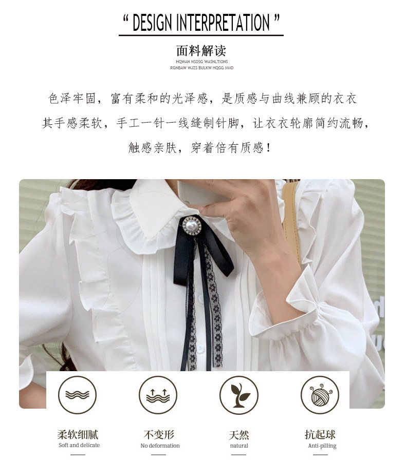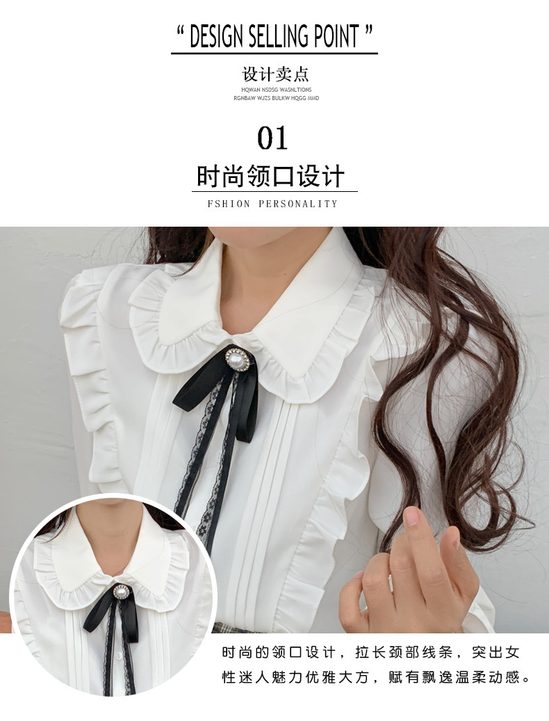 Белая шифоновая блузка с воротником-стойкой для женщин, стильная новинка ранней осени 2025 года с уникальным дизайном и бантом.