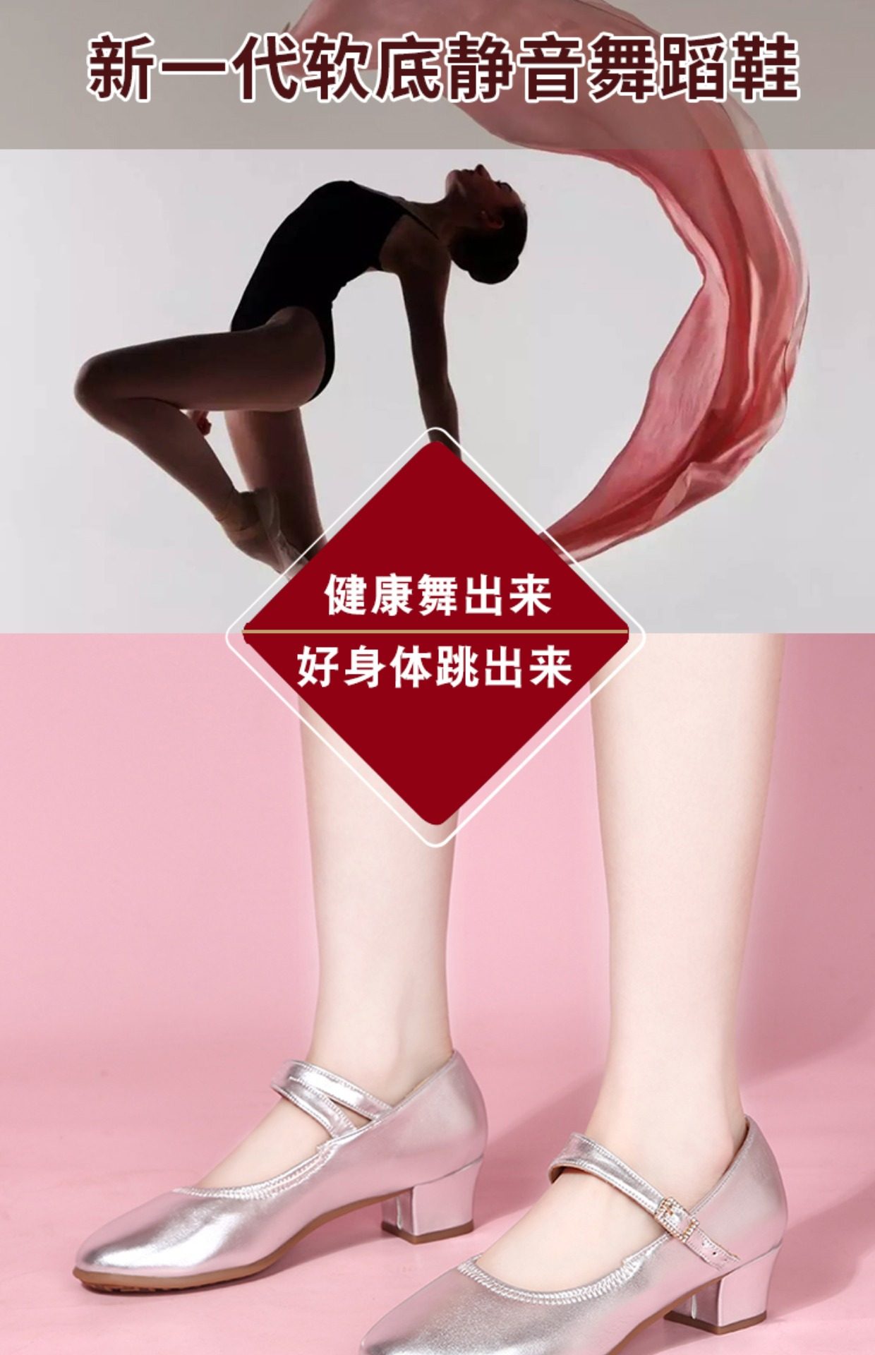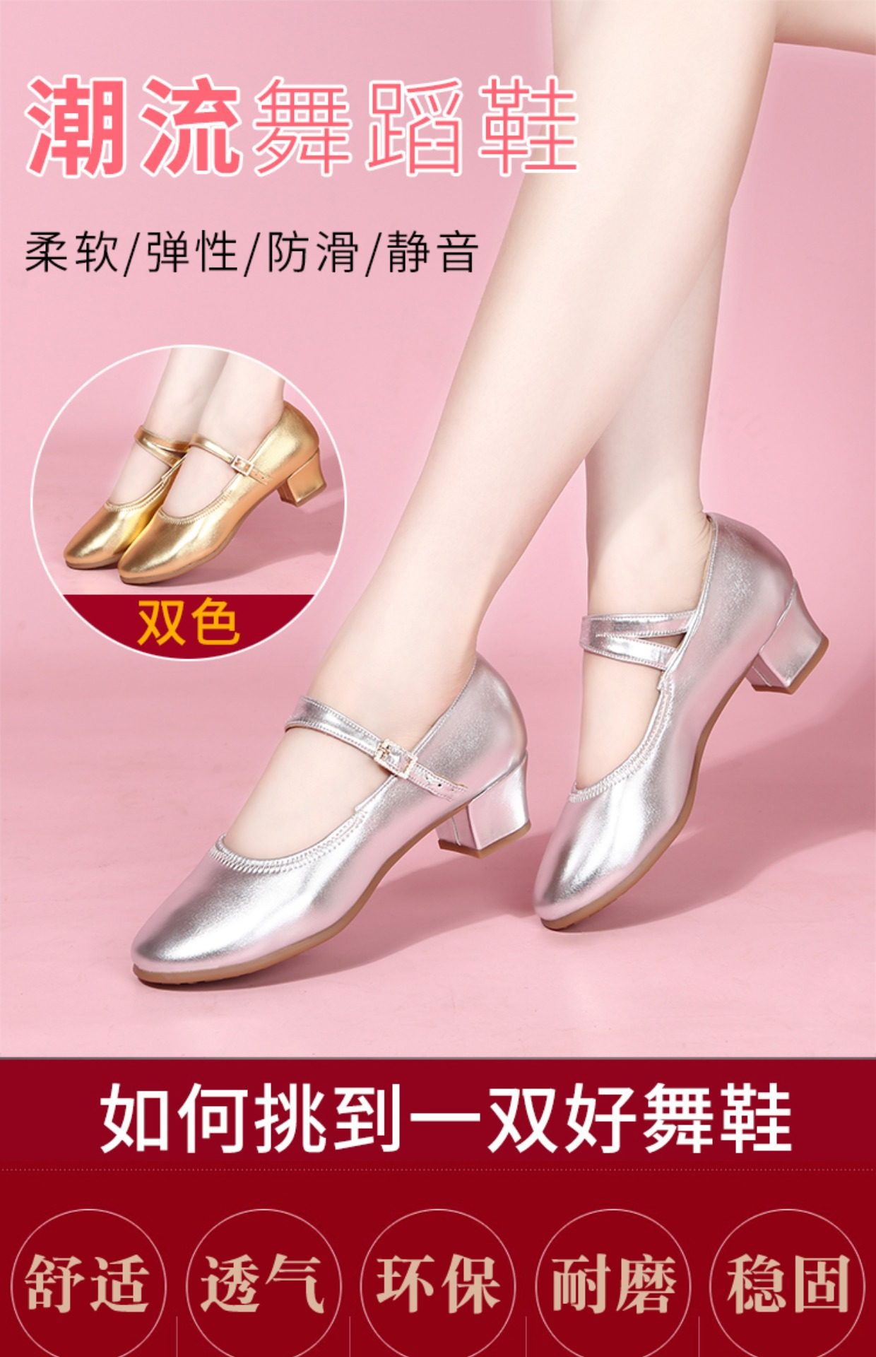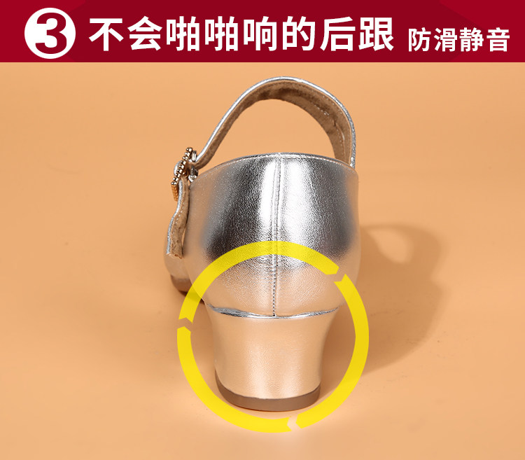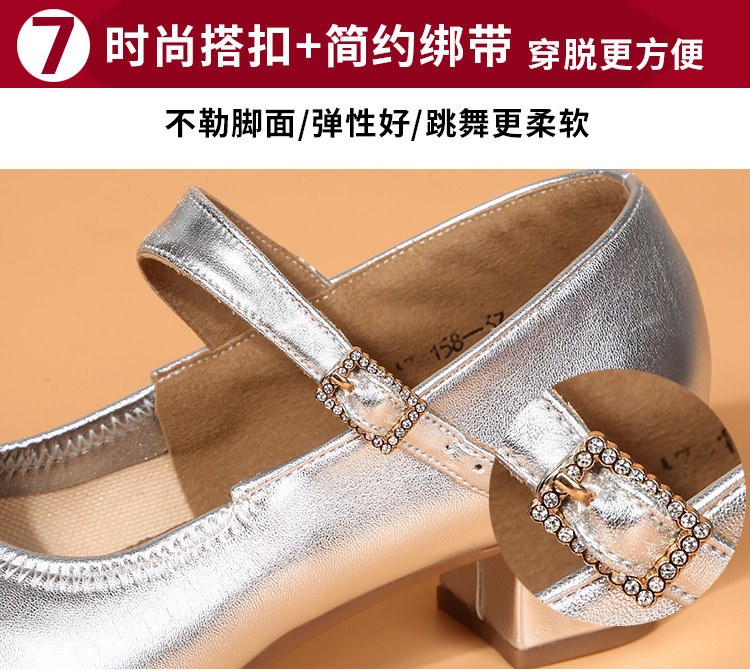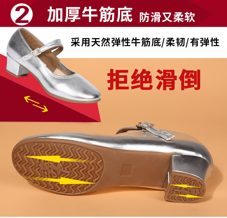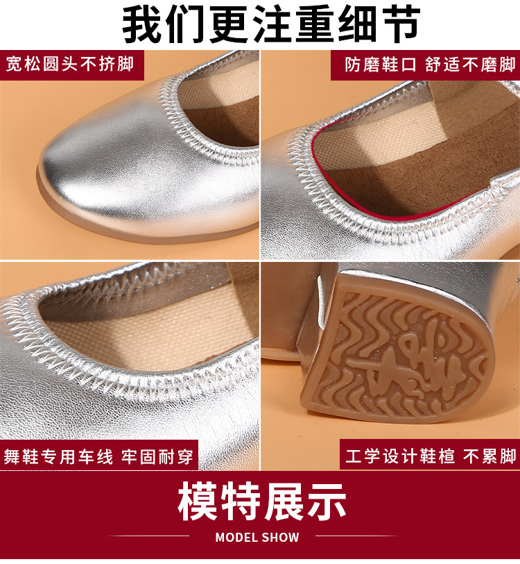 真皮四季牛筋底跳舞女鞋中跟软底广场舞夏天鞋跳舞单鞋银色演出鞋
