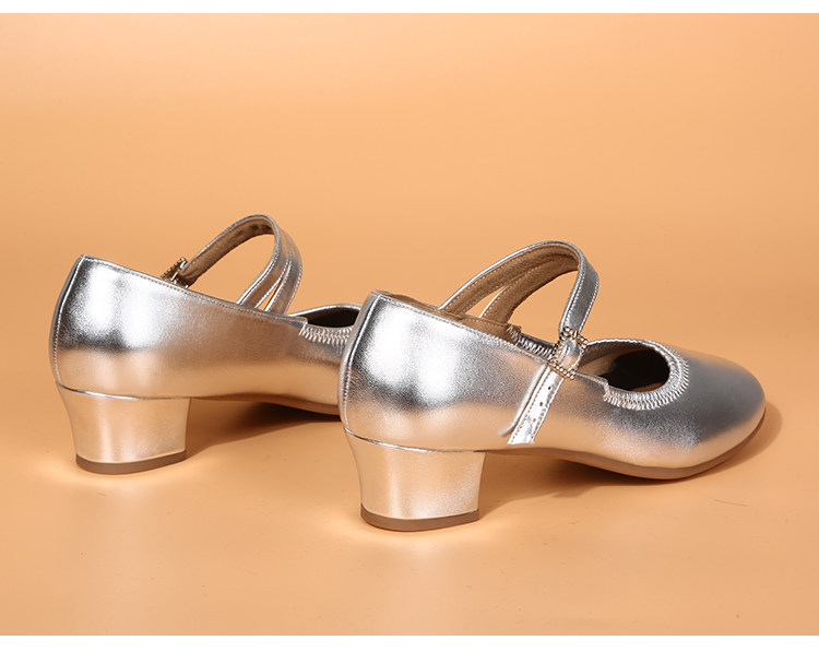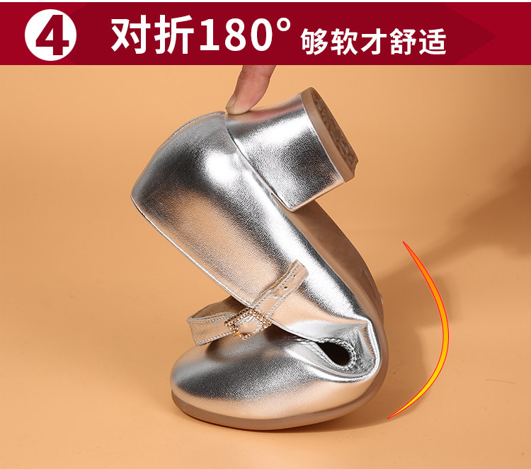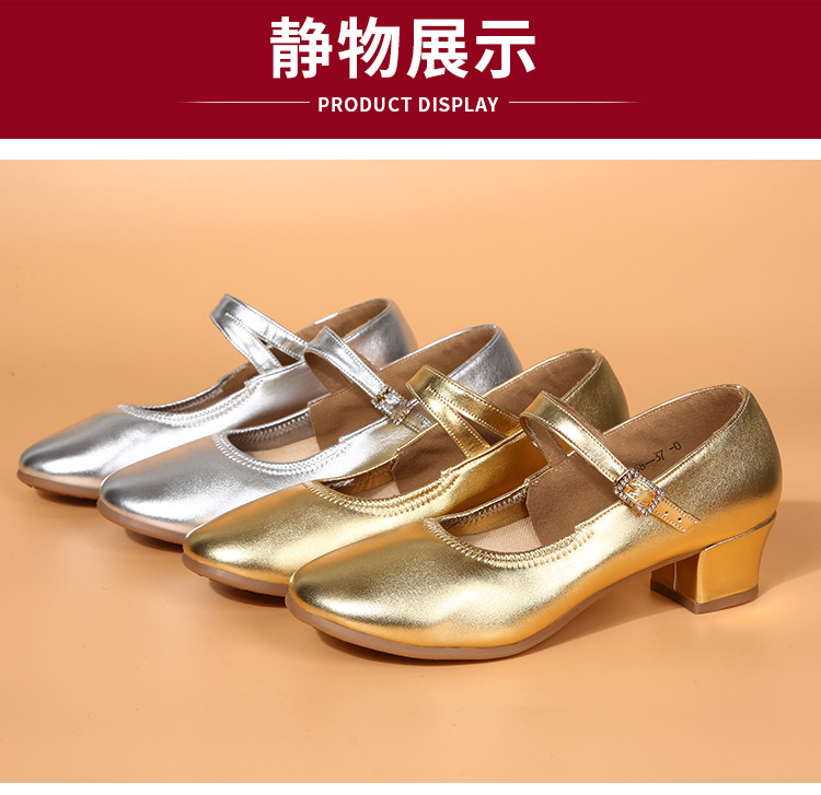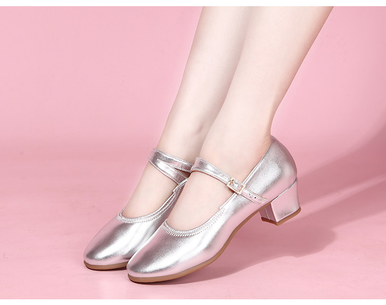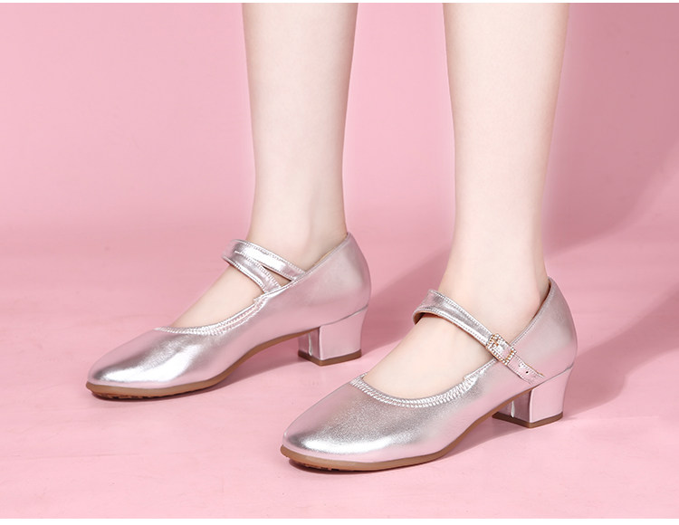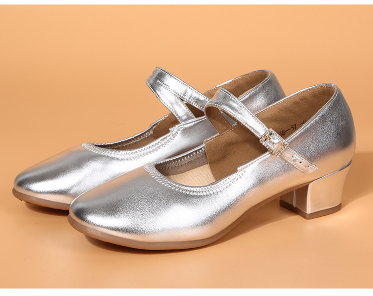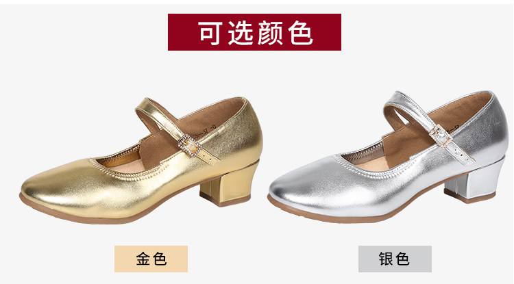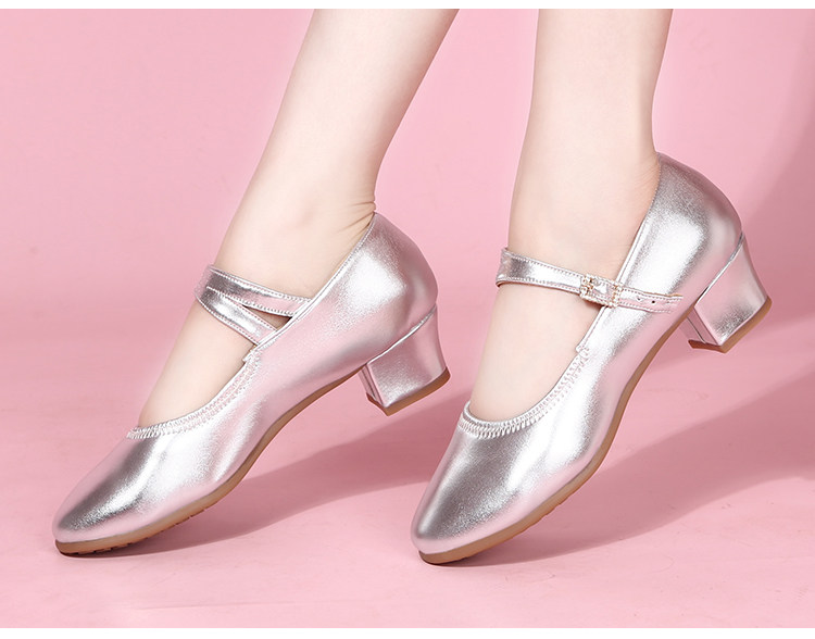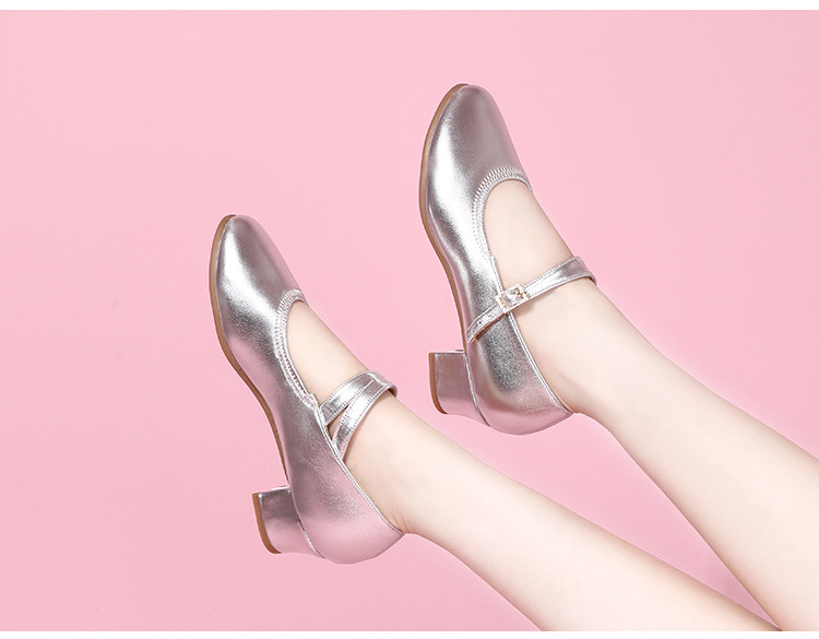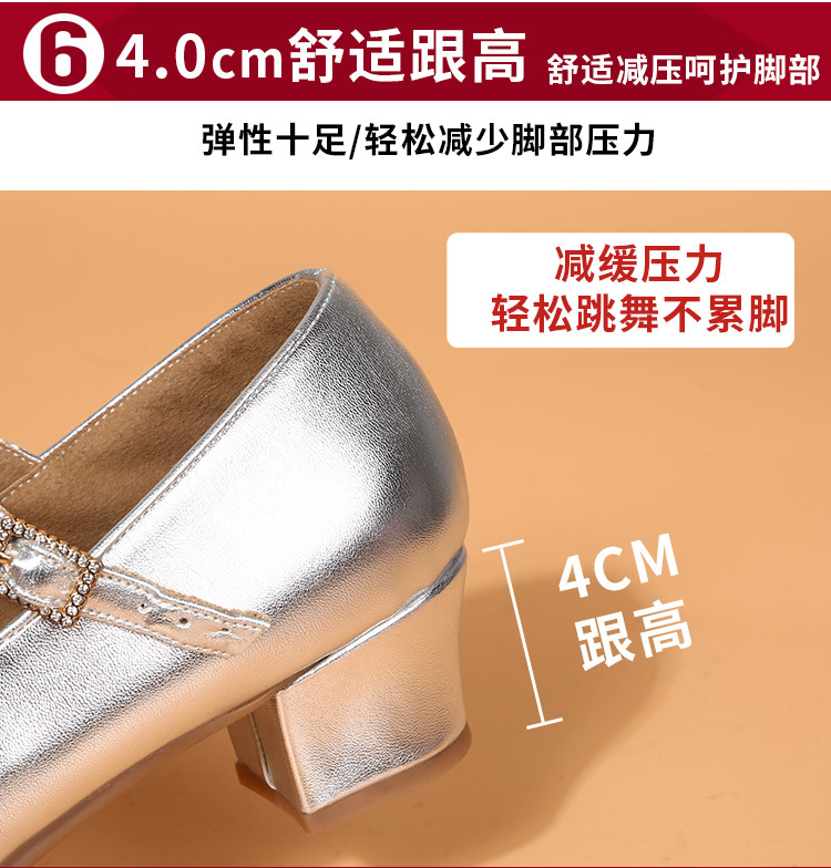 真皮四季牛筋底跳舞女鞋中跟软底广场舞夏天鞋跳舞单鞋银色演出鞋