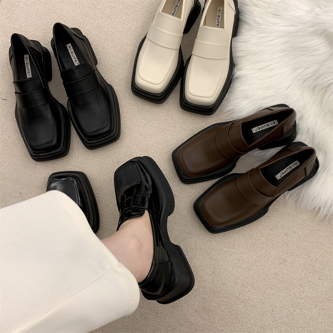 香港厚底英伦风小皮鞋女2025新款大方头春秋冬季乐福真皮黑色单鞋